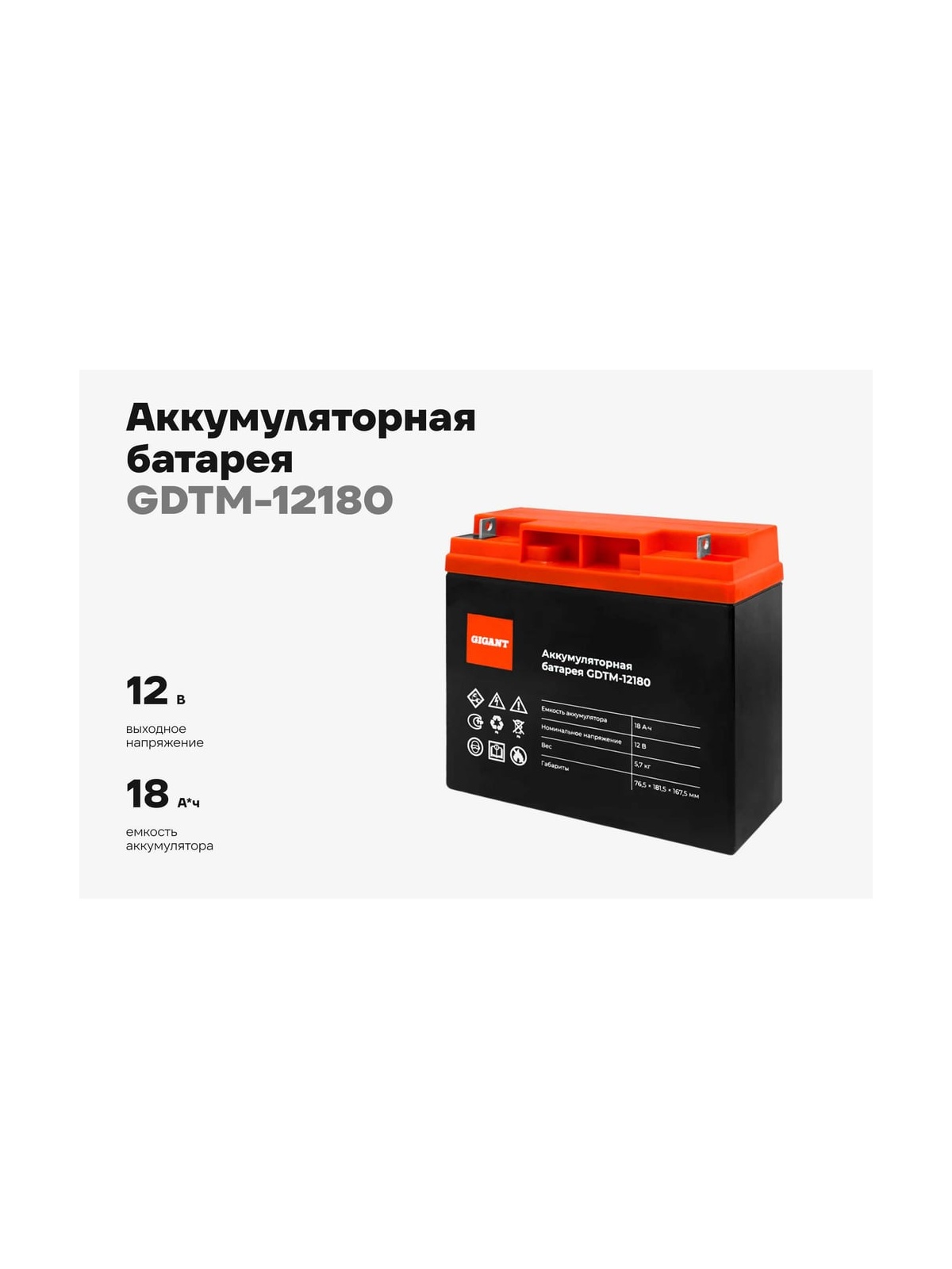 Аккумуляторная батарея Gigant GDTM-12180 представляет собой надежное решение для обеспечения стабильного питания ваших устройств. С емкостью 18 А*ч и выходным напряжением 12 В, она подходит для различных применений, обеспечивая длительное время работы. Использование технологии AGM гарантирует высокую производительность и безопасность эксплуатации, так как она предотвращает утечку электролита и минимизирует необходимость в обслуживании. =