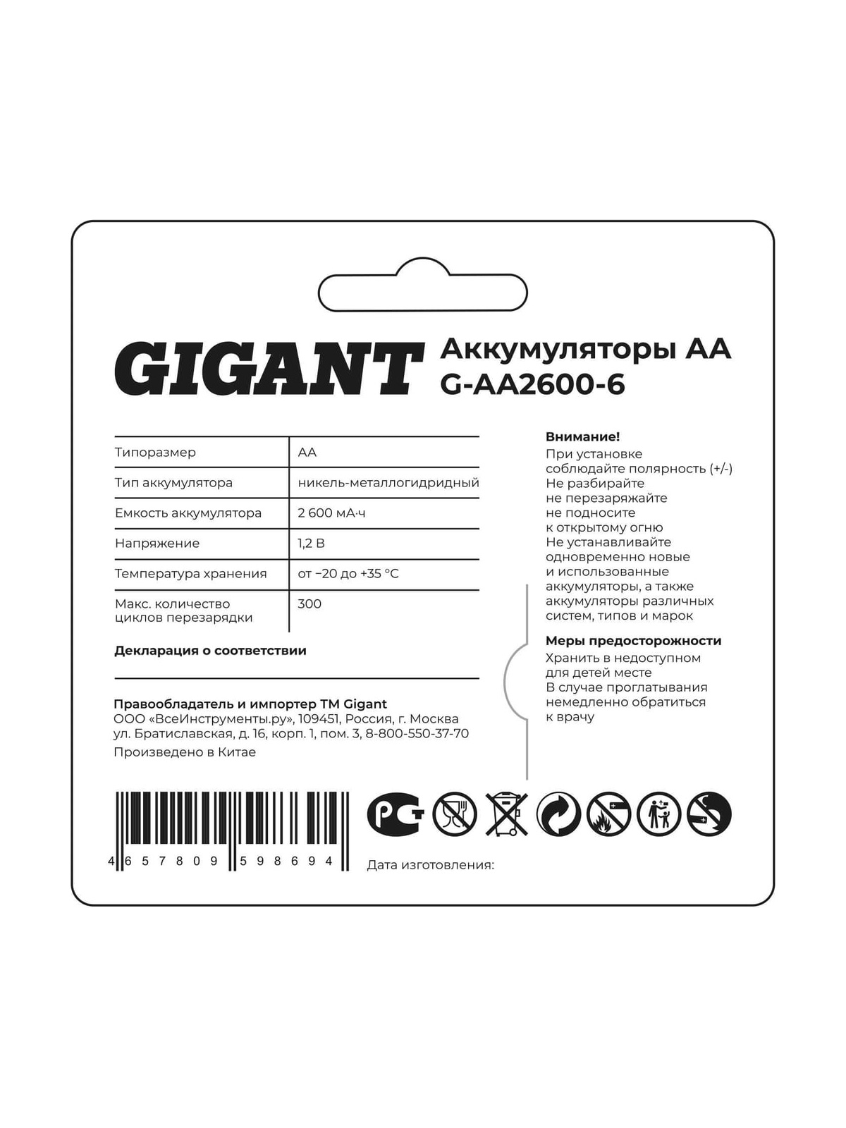 Перезаряжаемые аккумуляторы Gigant размера АА, емкостью 2600 мАч - 6шт. G-AA2600-6 характеризуются большим сроком службы, стабильной работой в широком диапазоне температур. Аккумуляторы отлично работают с такими устройствами, как радиоуправляемые игрушки, фонарики, плееры, пульты дистанционного управления, часы, фотоаппараты и других устройствах с высоким энергопотреблением. Аккумуляторы Gigant выдерживают до 500 циклов перезарядки и могут использоваться при температурах от 0 до +45°C. В отличие от обычных одноразовых элементов питания, которые постепенно теряют напряжение и ухудшают свою работу, эти аккумуляторы держат рабочее напряжение до последнего. У аккумуляторов Gigant отсутствует эффект памяти: их не нужно полностью разряжать, они сохраняют свою номинальную емкость. Товар сертифицирован.