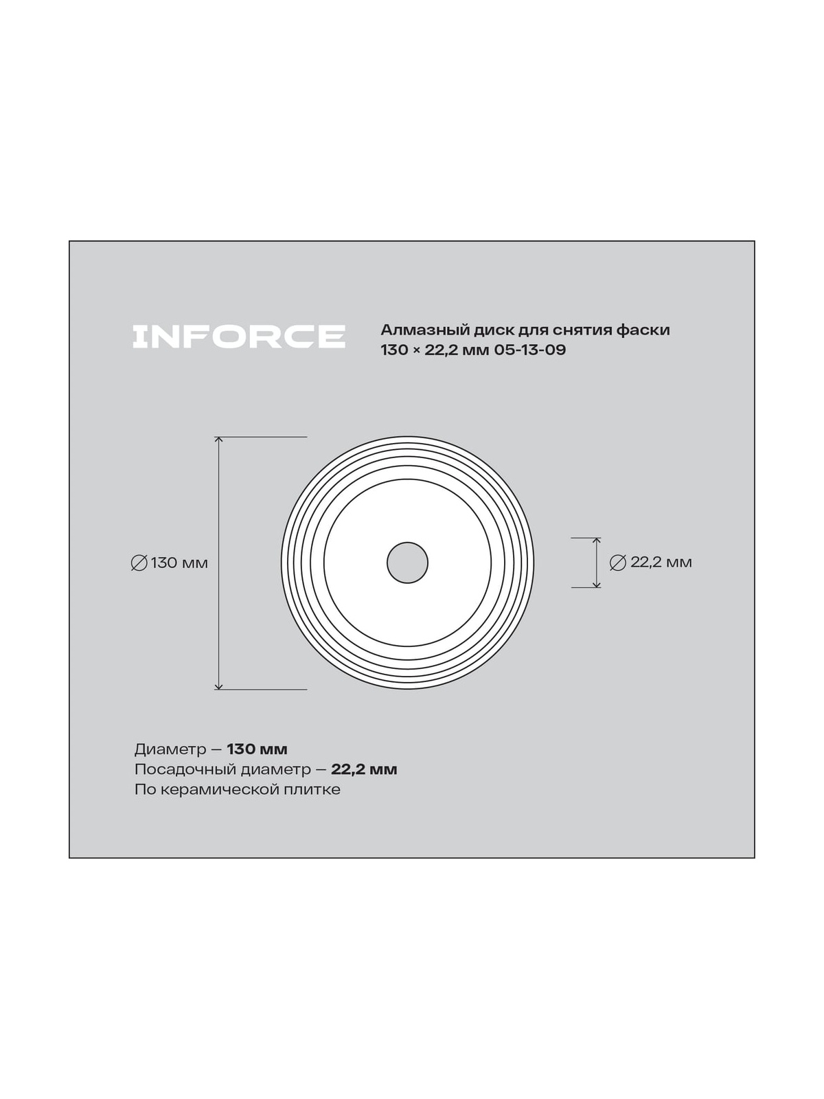 Алмазный диск для снятия фаски 130x22.2 мм Inforce 05-13-09 предназначен для работы с плиткой, керамогранитом и камнем. Благодаря сплошной конструкции, диск обеспечивает чистый и ровный рез, что особенно важно при обработке деликатных материалов. Использование данного диска в условиях мокрого реза с применением СОЖ позволяет значительно увеличить срок его службы и повысить качество обработки.