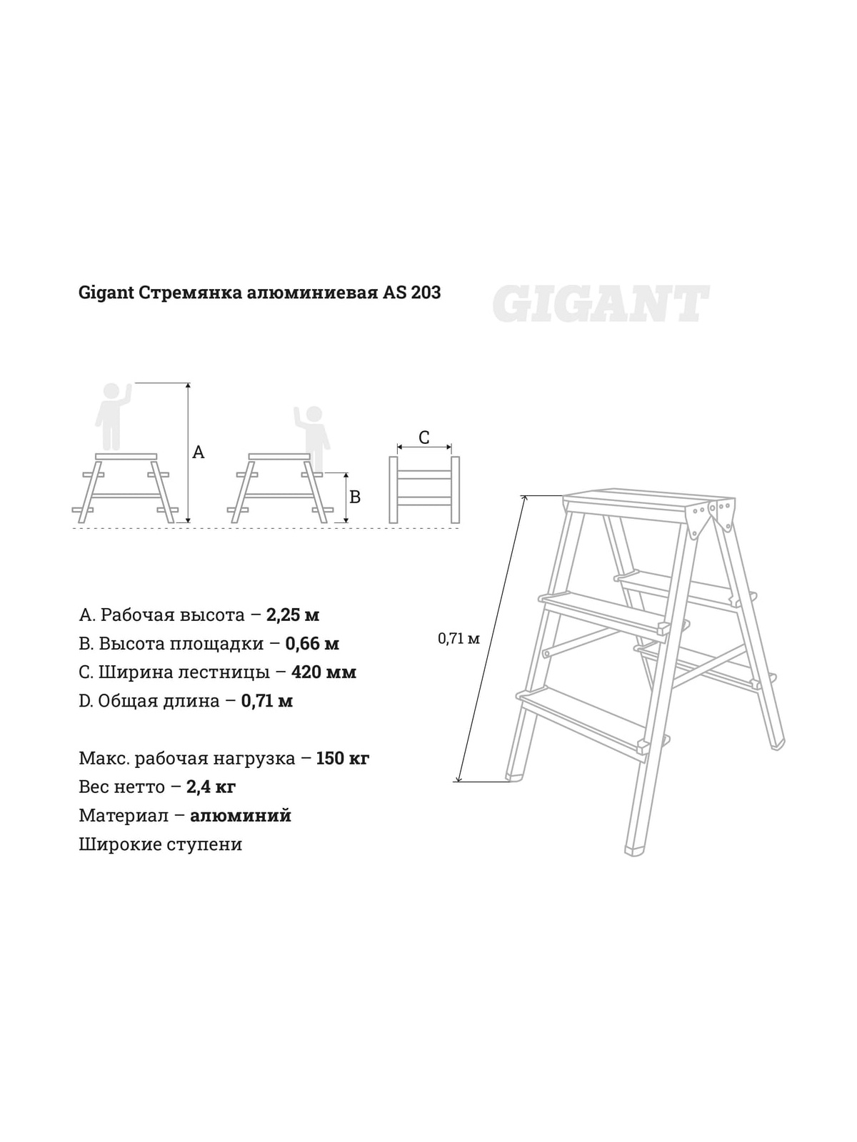 Стремянка Gigant - это раскладная лестница, предназначенная для хозяйственных нужд и ремонтных работ на высоте до 2,65 м. Надежная конструкция состоит из двух секций по 3 ступени. Высота площадки составляет 0,66 м. Стремянка понадобится при проведении строительно-отделочных работ в доме, для бытовых нужд, при сборке урожая или обрезке деревьев в саду, а также для эксплуатации в магазинах или на складах. Алюминиевая конструкция делает стремянку легкой и прочной, ее можно эксплуатировать внутри помещений и на улице, так как она не подвержена коррозии. Для удобства и безопасности пользования ступени имеют широкую рифленую поверхность - ноги не соскальзывают и меньше устают. Максимальная нагрузка на стремянку составляет 150 кг. При хранении и транспортировке стремянка занимает не много места. Продукция представлена профессиональными и бытовыми инструментами, имеет доступную цену и высокое качество. При изготовлении товаров Gigant используется современное оборудование и прочные материалы. Производство осуществляется на современных предприятиях России и Азии. Тестирование товаров осуществляется в два этапа, каждая партия инструментов проходит проверку на соответствие стандартам и заявленным техническим характеристикам. Это является залогом качества и надежности готового продукта. Продукция представлена широкой линейкой инструментов. У нас можно приобрести ручной инструмент, строительный, садовый, сантехнический, климатический, крепежный, автогаражный, а также станки, расходные материалы и многое другое. Данная позиция поставляется взамен Алюминиевая стремянка Inforce двусторонняя, 3 ступени 02-11-09.