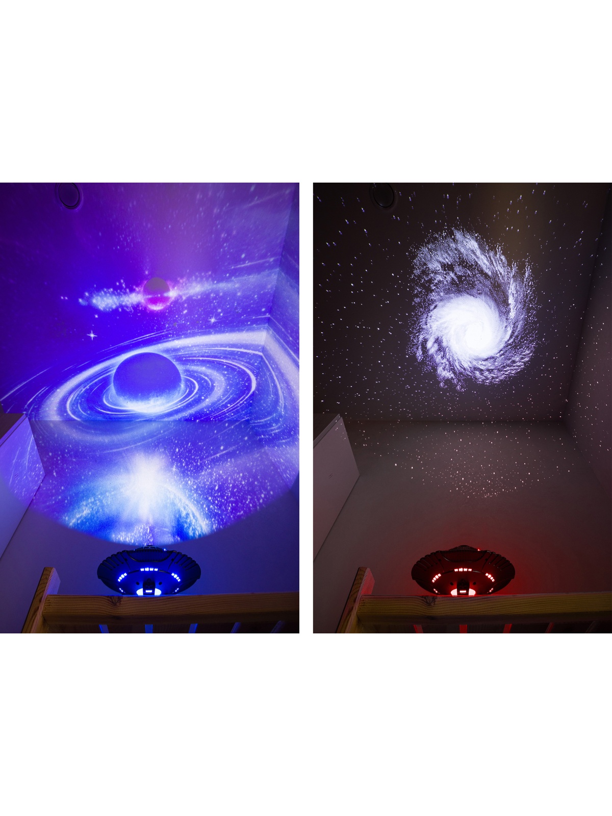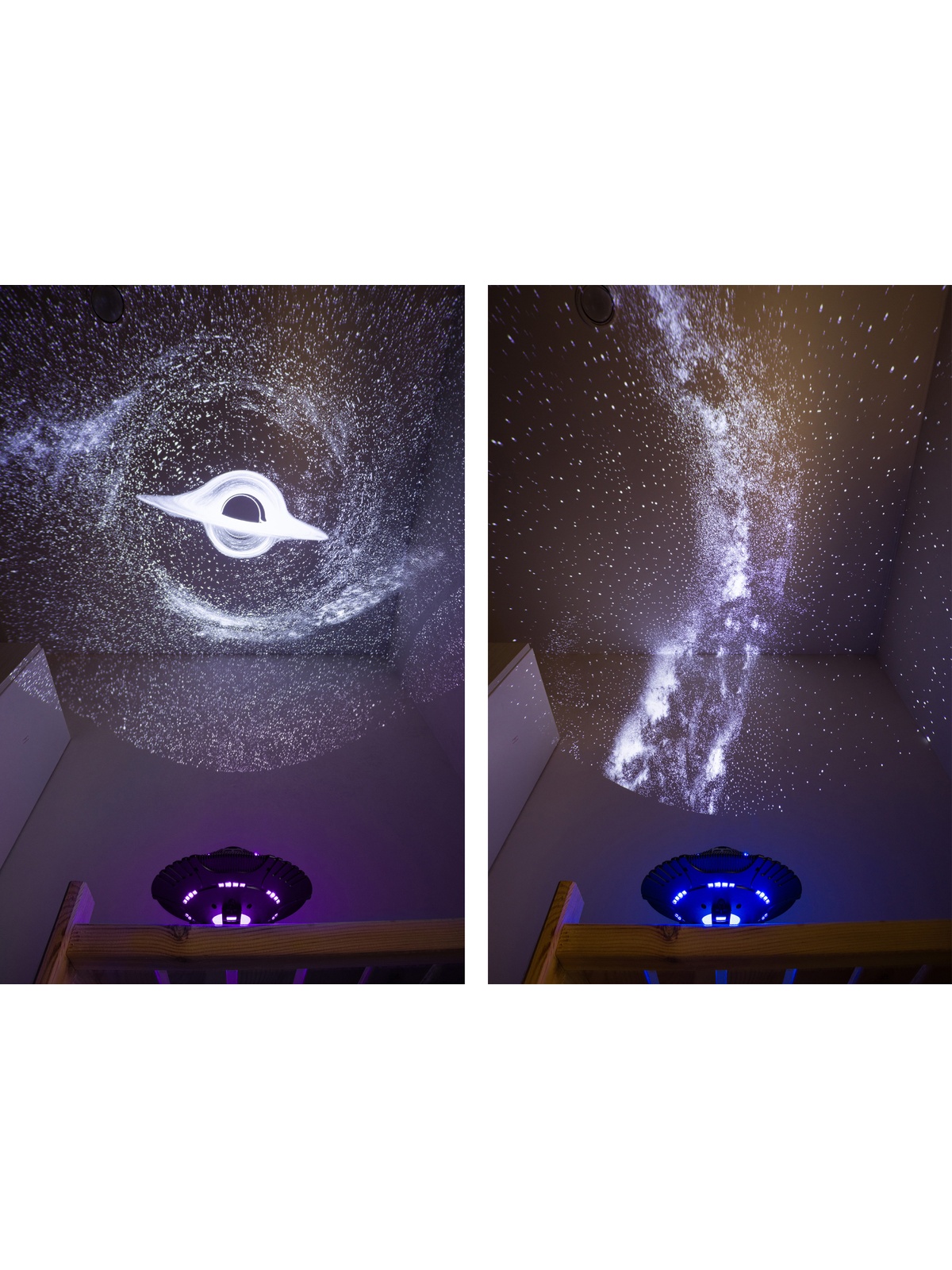Небольшой астропланетарий в виде НЛО днем будет украшением интерьера, а вечером поможет ребенку расслабиться после школьных занятий и позволит понаблюдать за красотами космоса. В комплекте идут проекционные диски (слайды) с изображениями галактики Млечный Путь, планеты, черной дыры и других космических объектов. Проектор дает яркое изображение, уровень яркости подсветки можно менять. Есть два режима работы светодиодов: один цвет или плавная смена цветов.