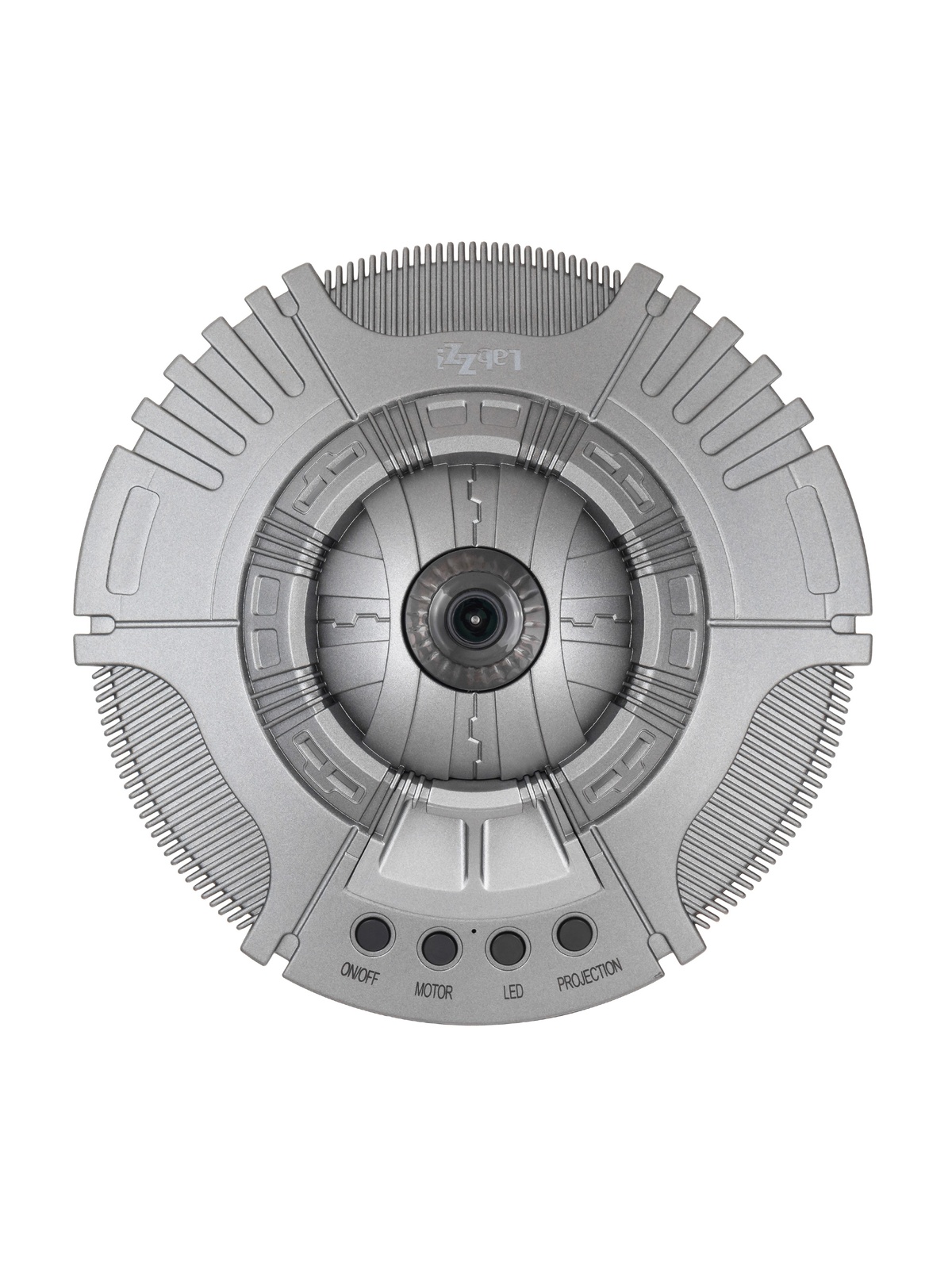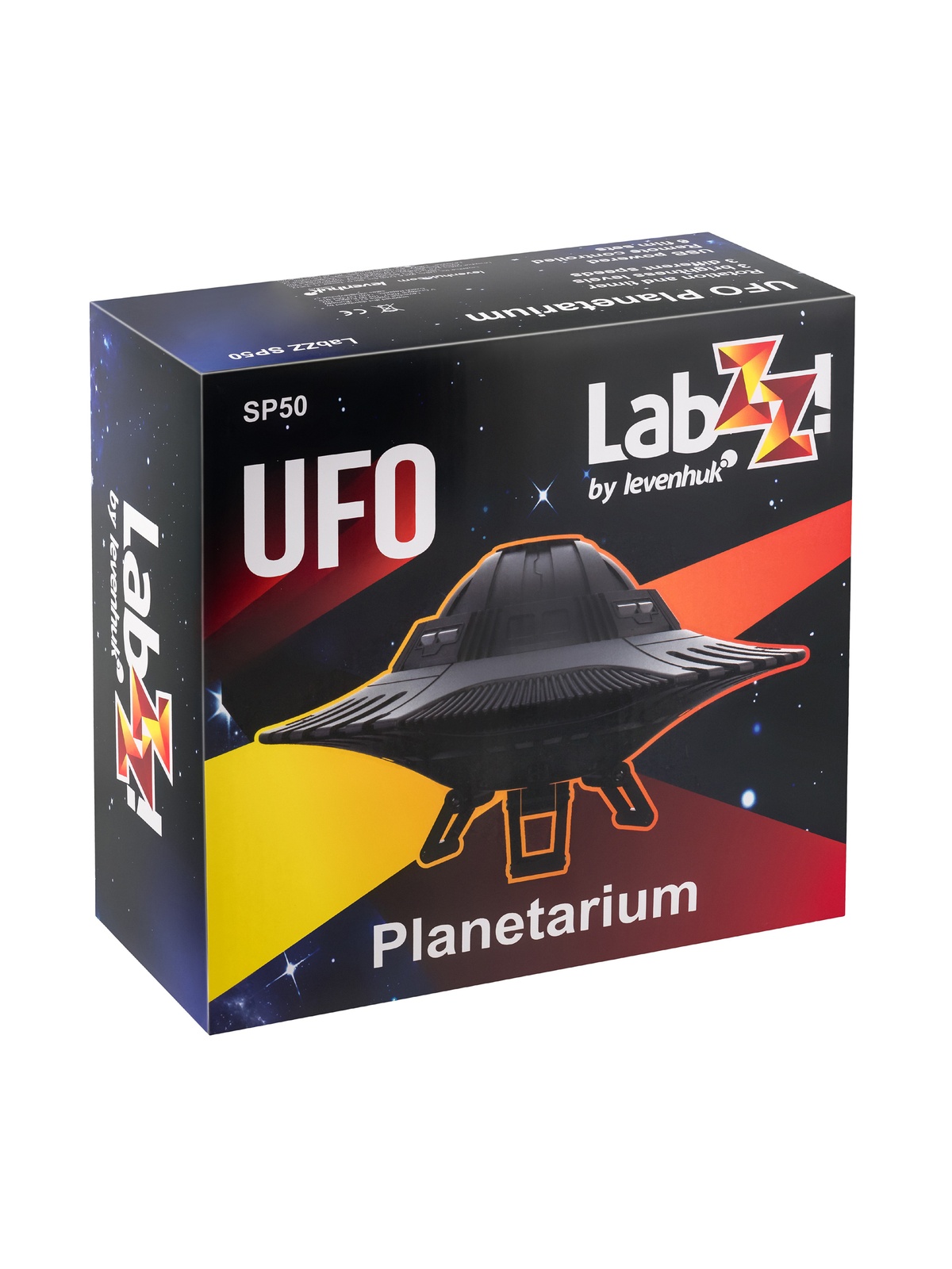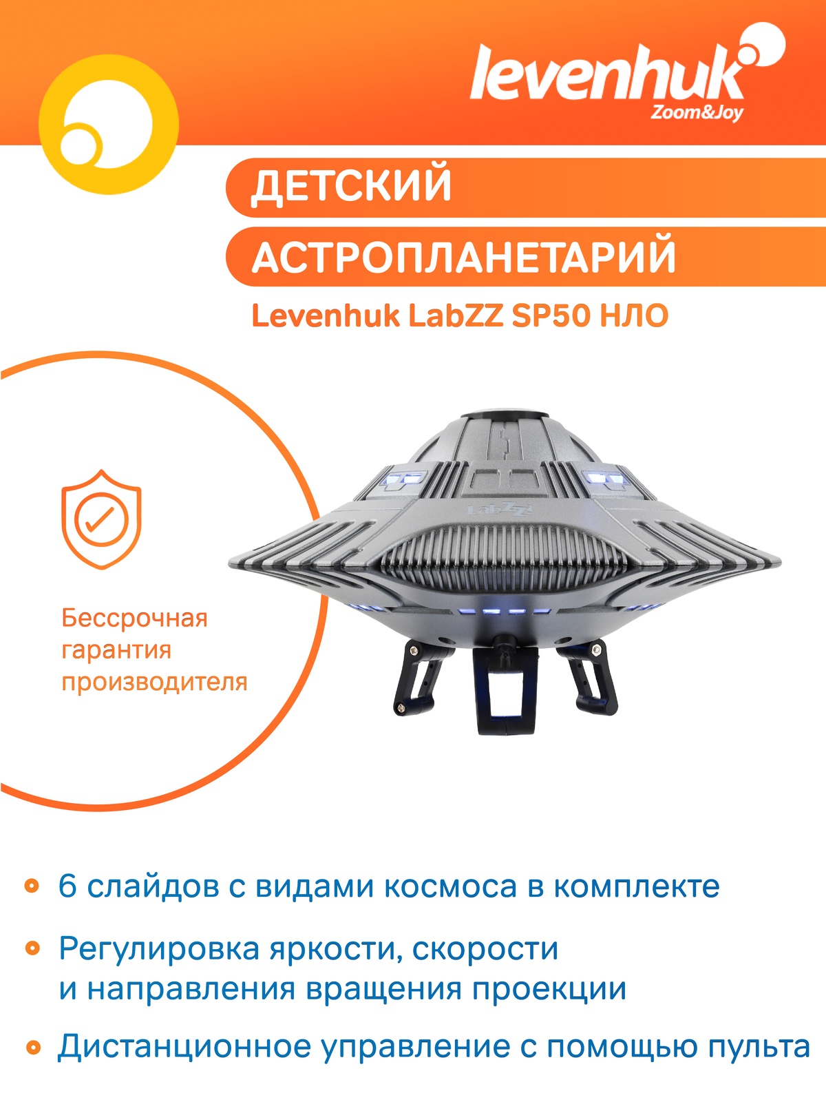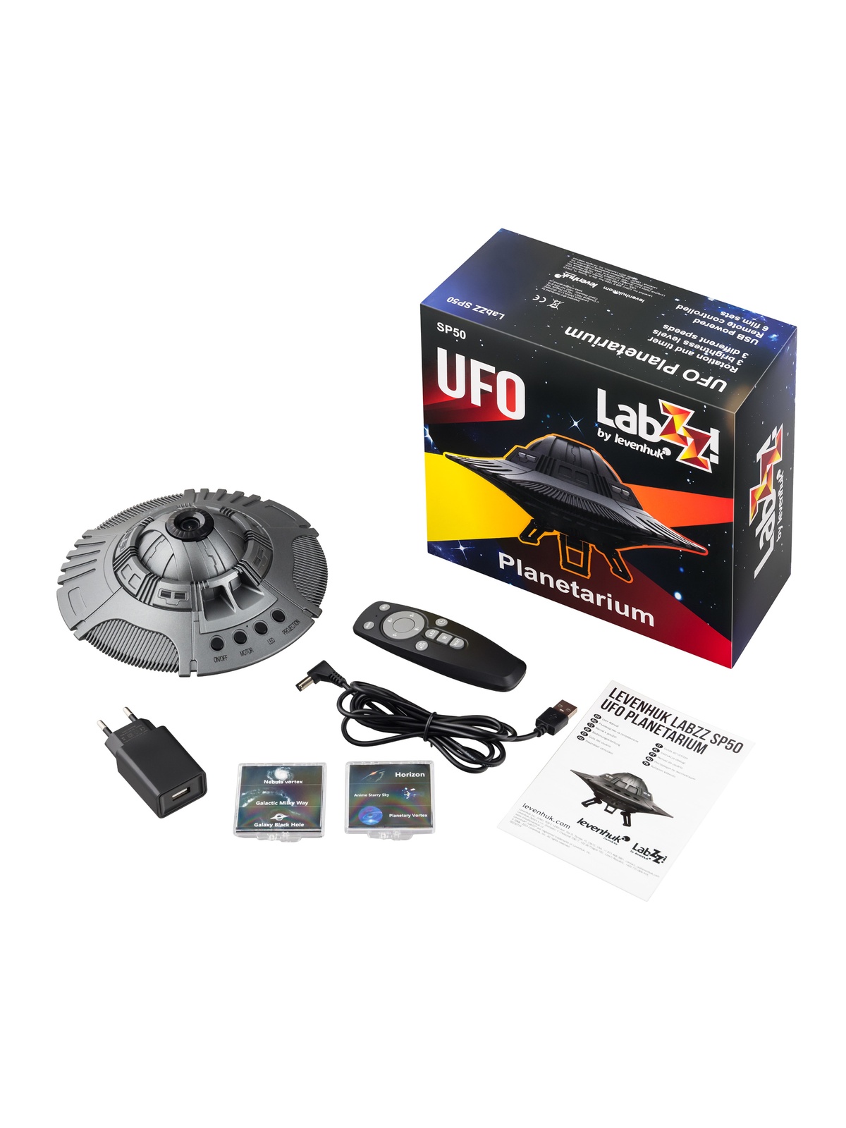 Изображение проецируют на потолок или на стену, площадь проекции – 30 квадратных метров. С помощью отдельной кнопки запускают вращение проекции, двукратным нажатием на кнопку меняют направление вращения. В астропланетарии Levenhuk LabZZ SP50 НЛО предусмотрена ручная настройка резкости с помощью фокусировочного колеса на корпусе. В комплект также входит пульт управления с питанием от батареек (не поставляются с устройством).