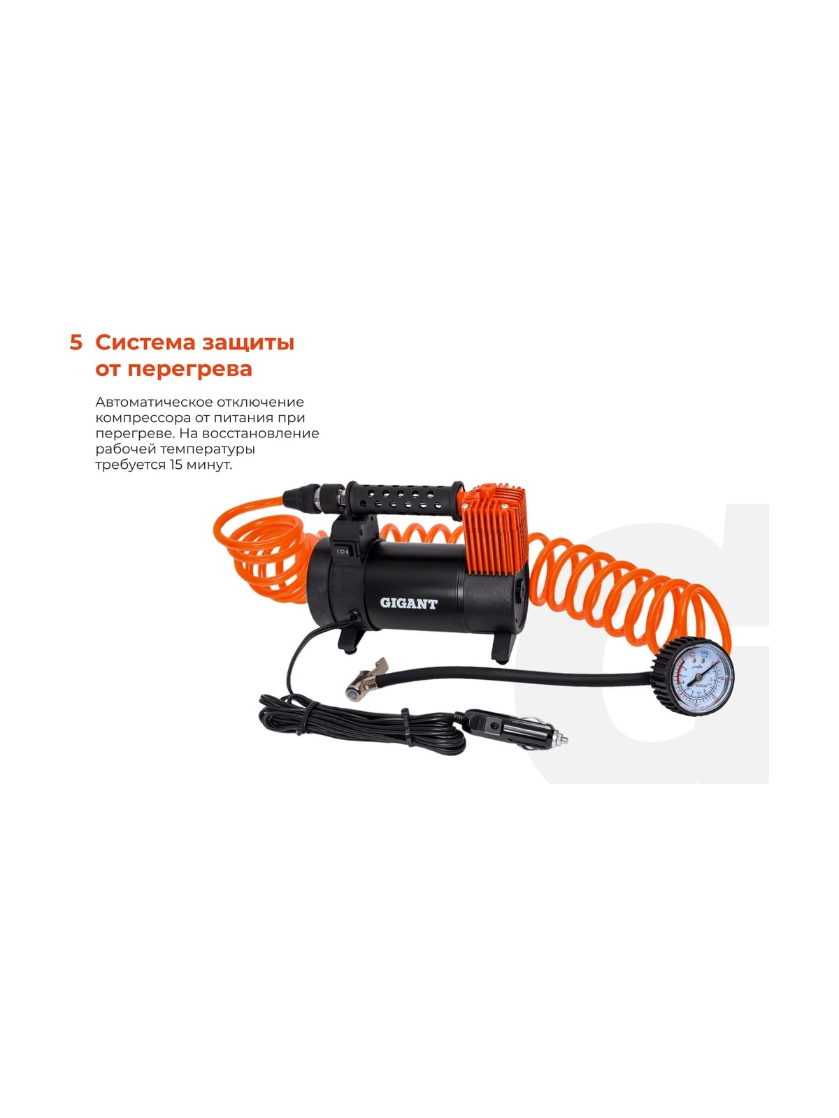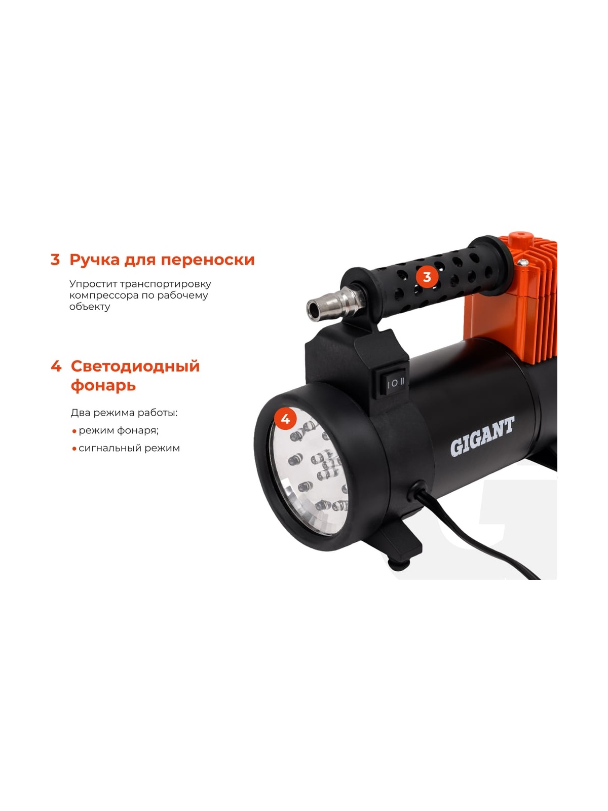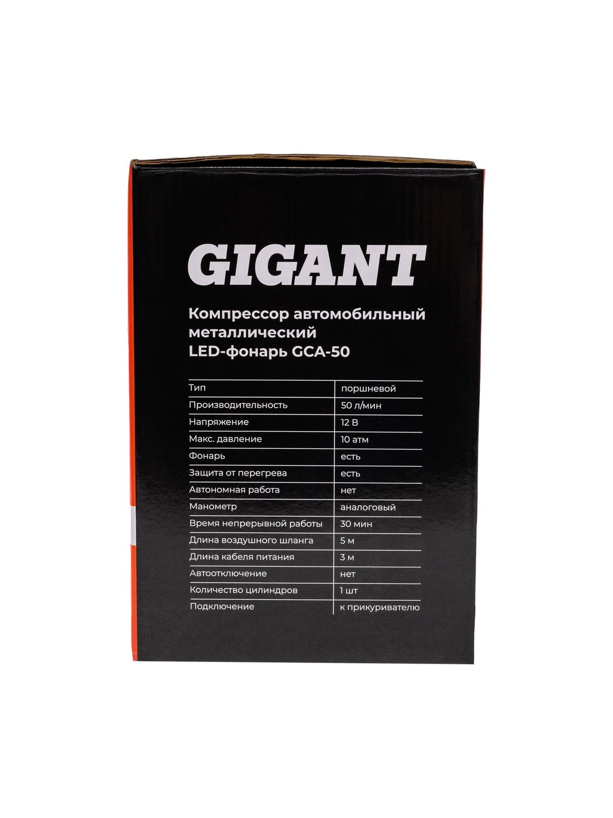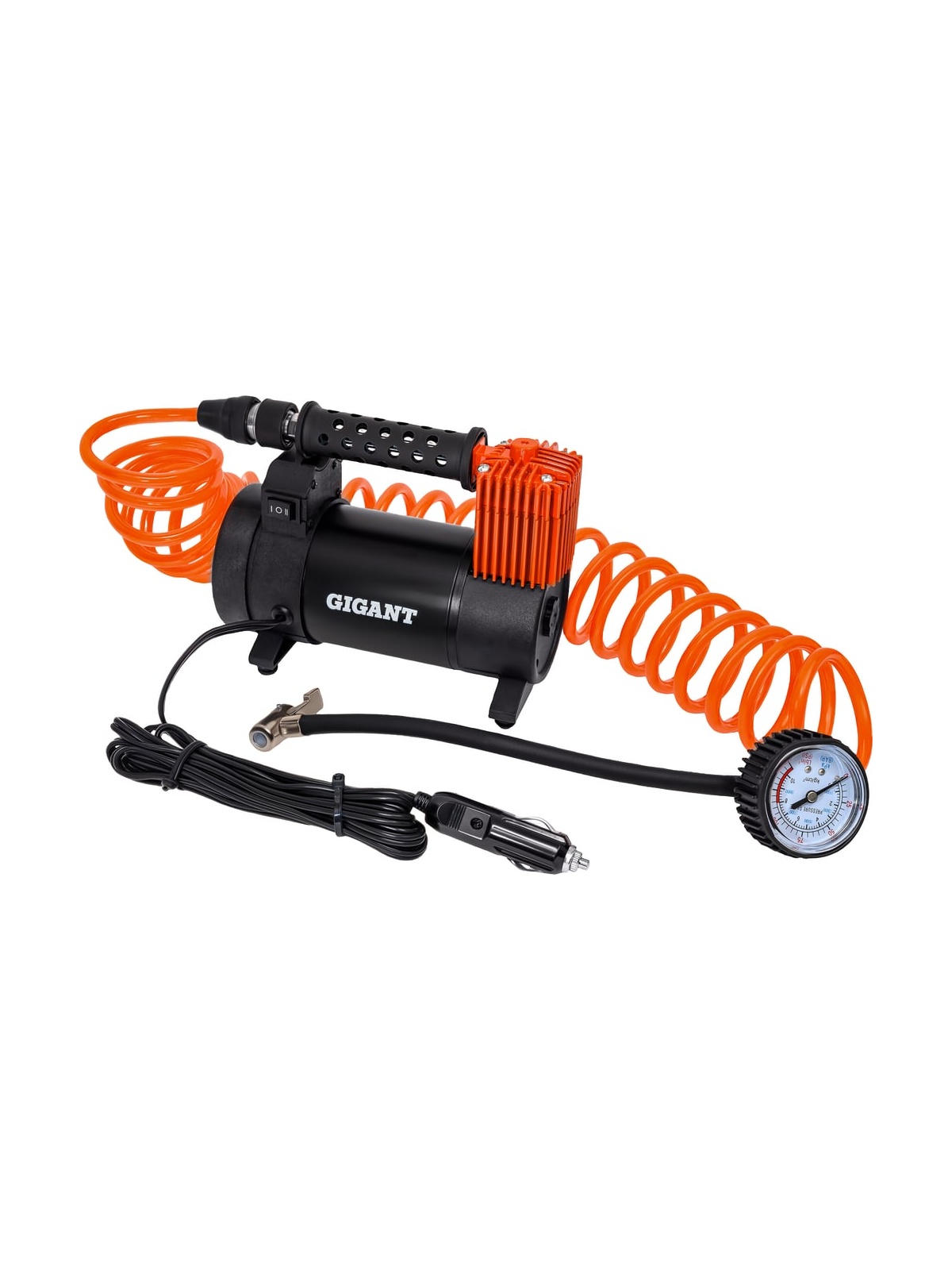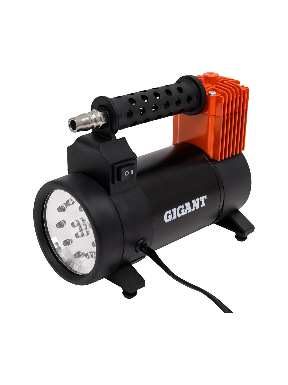 Автомобильный компрессор Gigant металл, 12V, LED фонарь GCA-50 отлично подходит для дальних поездок и путешествий. Устройство позволяет легко и быстро накачать шины автомобиля или велосипеда, а также различные надувные изделия. Встроенный LED фонарь обеспечивает комфортное использование компрессора в темное время суток. Визуальный контроль - встроенный манометр позволяет контролировать рабочее давление; Удобное перемещение - в конструкции предусматривается транспортировочная рукоять для легкого и удобного перемещения агрегата с одного места на другое; Широкие возможности - в стандартную комплектацию входит набор насадок для накачивания велосипедных шин, матрацев, мячей и резиновых лодок.