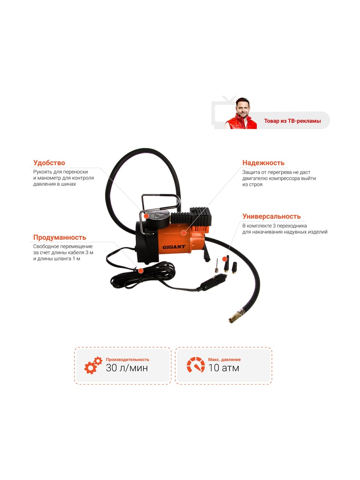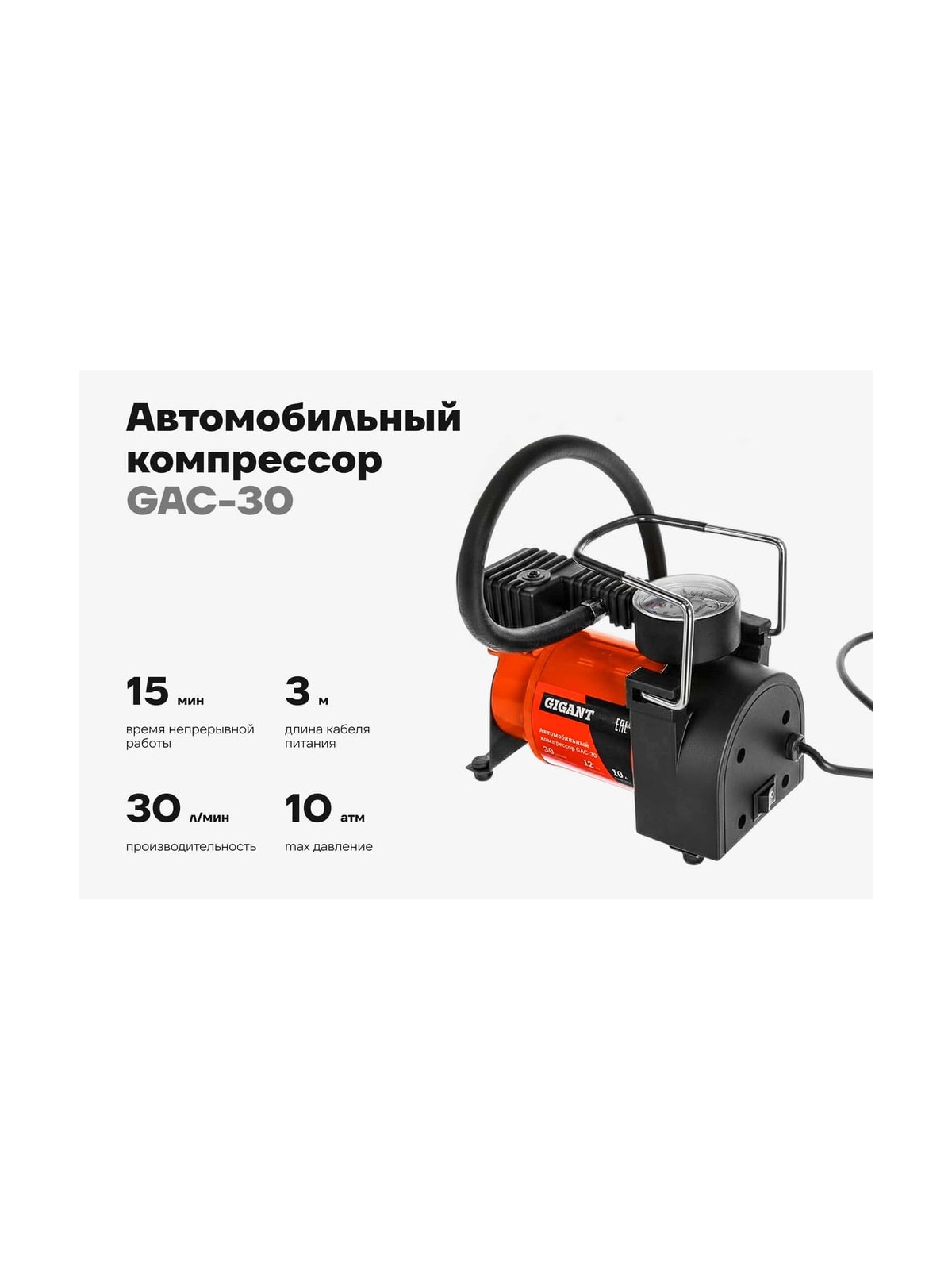 Автомобильный компрессор Gigant GAC-30 подойдет для длительных автомобильных поездок и позволит быстро наполнить воздухом спущенное колесо. Двигатель оснащен поршнем, что делает компрессор легким, но мощным. Модель оснащается встроенной защитой от перегрева, что значительно продлевает срок ее службы. Установка проста в применении и не требует специальных пользовательских навыков. Оборудование имеет безмасляное исполнение, поэтому не нуждается в техническом обслуживании. Производительность автокомпрессора составляет 30 литров в минуту, что означает, что он легко и быстро накачает шины с посадочным диаметром 13 — 14 дюймов на любом легковом автомобиле. Для внедорожников и грузовиков рекомендуется компрессор Gigant GAC-60 с производительностью 60 литров в минуту. Продукция представлена профессиональными и бытовыми инструментами, имеет доступную цену и высокое качество. При изготовлении товаров Gigant используется современное оборудование и прочные материалы. Производство осуществляется на современных предприятиях России и Азии. Тестирование товаров осуществляется в два этапа, каждая партия инструментов проходит проверку на соответствие стандартам и заявленным техническим характеристикам. Это является залогом качества и надежности готового продукта. Продукция представлена широкой линейкой инструментов. У нас можно приобрести ручной инструмент, строительный, садовый, сантехнический, климатический, крепежный, автогаражный, а также станки, расходные материалы и многое другое.