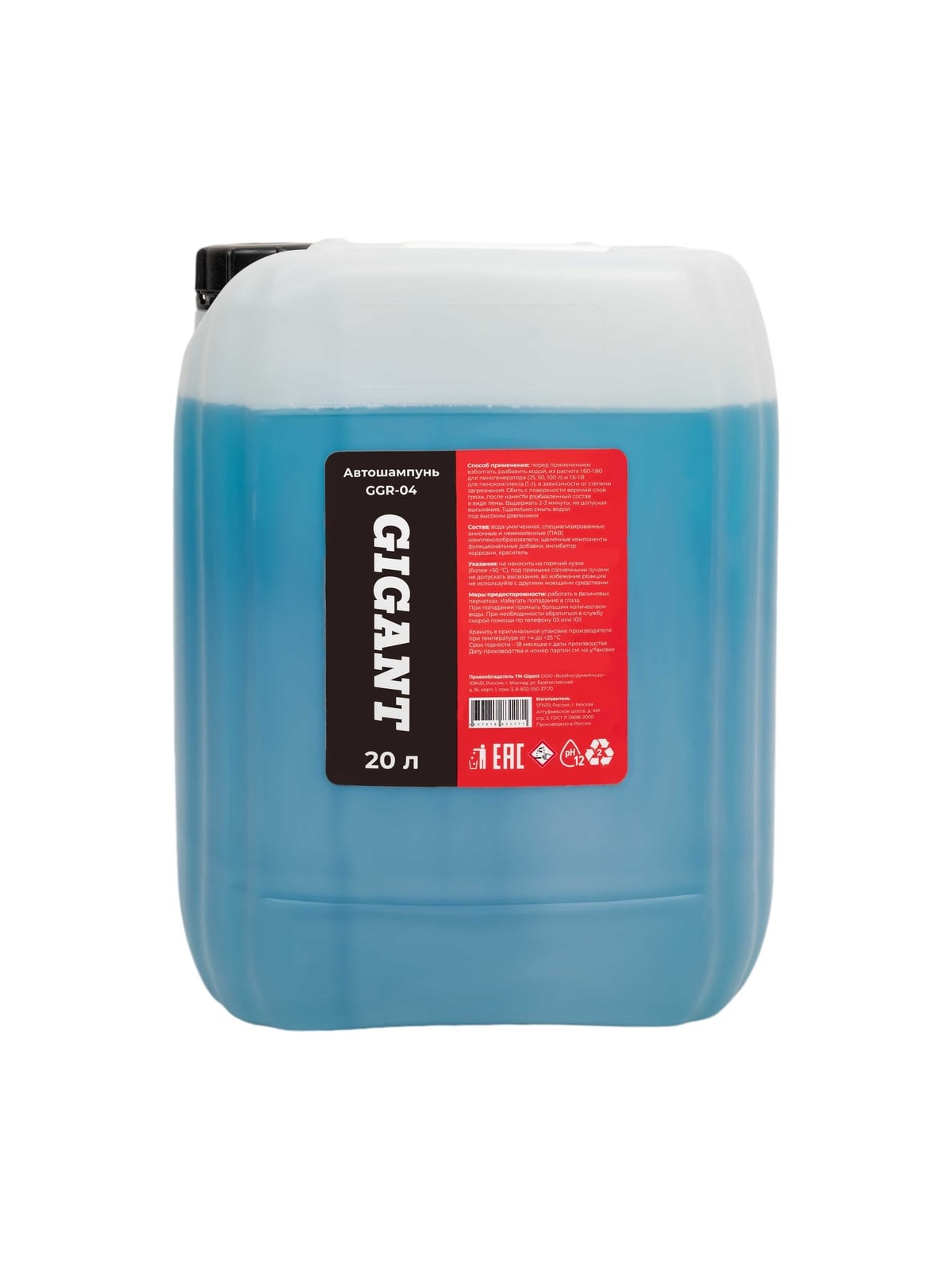 Автошампунь Gigant 20л GGR-04 - средство для бесконтактной мойки автомобилей. Бережно удаляет стойкие загрязнения. Подходит для любой воды, совместим с различными типами восков. Средство равномерно распыляется на поверхность кузова, при этом образуется пена толщиной 0.5-1.5 см. Смывается через 2-3 минуты после нанесения с помощью АВД. Представляет собой концентрированный раствор и требует разбавления водой. Способ применения: перед применением взболтать, разбавить водой, из расчета 1:60-1:80 для пеногенератора (25, 50, 100 л) и 1:6-1:8 для пенокомплекта (1 л), в зависимости от степени загрязнения. Сбить с поверхности верхний слой грязи, после нанести разбавленный состав в виде пены. Выдержать 2-3 минуты, не допуская высыхания. Тщательно смыть водой под высоким давлением. Состав: вода умягченная, специализированные анионные и неионогенные (ПАВ) комплексообразователи, щелочные компоненты, функциональные добавки, ингибитор коррозии, краситель. Указания: не наносить на горячий кузов (более +50 °С), под прямыми солнечными лучами не допускать высыхания, во избежание реакции не используйте с другими моющими средствами . Меры предосторожности: Работать в резиновых перчатках. Избегать попадания в глаза. При попадании автошампуня в глаза, промыть их большим количеством воды.