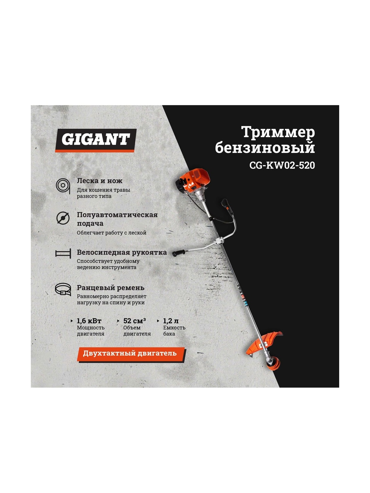 Триммер Gigant CG-KW02-520 оснащен бензиновым двигателем, что обеспечивает пользователю мобильность и независимость от наличия электросети. Инструмент имеет трехлопастной нож и полуавтоматическую головку, поэтому с его помощью можно скашивать любую траву. Емкость топливного бака составляет 1,2 литра, что позволяет работать долгое время без дозаправки на участках большой площади, а также при длительном скашивании на высокой скорости без перерыва. Двигатель объемом 52 см³ обеспечивает высокую производительность. В триммере предусмотрена полуавтоматическая подача лески - для удобного кошения без прерывания работы инструмента. Триммер оснащен жестким приводным валом, что делает его более надежным. Ранцевый ремень в комплекте распределяет вес и нагрузку при ходьбе на все тело, поэтому спина пользователя не устает, а уровень вибрации, отдающий в руку, снижается. Инструмент предназначен для бытового использования. При установке лески им можно косить невысокую мягкую траву. При использовании ножа возможно кошение запущенных участков с сухостоем, густой жесткой травой и небольшими кустарниками. Велосипедная рукоятка обеспечивает комфортную работу с инструментом, создает удобство эксплуатации при длительном кошении. Продукция представлена профессиональными и бытовыми инструментами, имеет доступную цену и высокое качество. При изготовлении товаров Gigant используется современное оборудование и прочные материалы. Производство осуществляется на современных предприятиях России и Азии. Тестирование товаров осуществляется в два этапа, каждая партия инструментов проходит проверку на соответствие стандартам и заявленным техническим характеристикам. Это является залогом качества и надежности готового продукта. Продукция представлена широкой линейкой инструментов. У нас можно приобрести ручной инструмент, строительный, садовый, сантехнический, климатический, крепежный, автогаражный, а также станки, расходные материалы и многое другое.