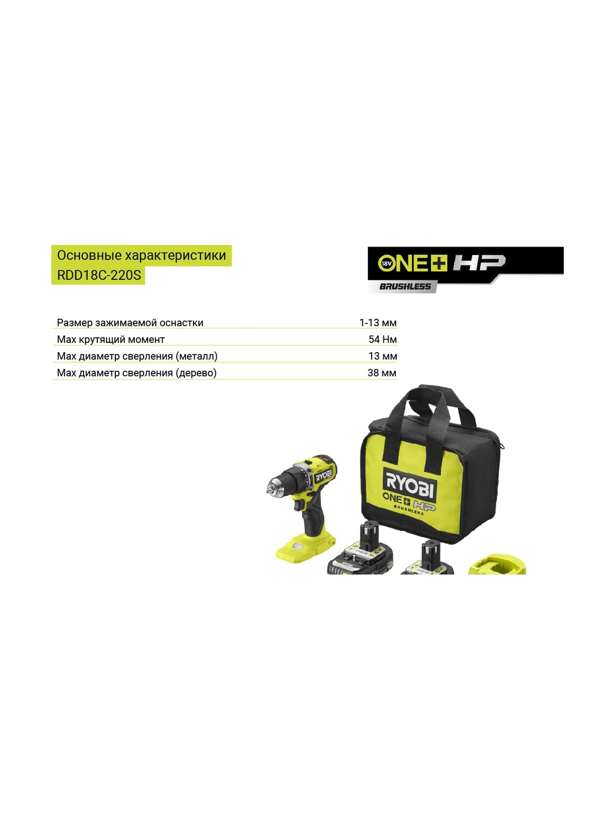 Бесщеточная дрель-шуруповерт Ryobi ONE+ HP RDD18C-220S 5133004980 идеальна для сверления дерева или металла, а так же для закручивания шурупов. Оптимизированный бесщеточный двигатель обеспечивает высокую мощность, а следящая электроника увеличивает продолжительность работы. 13мм быстрозажимной патрон с трещеткой обладает высокими удерживающей способностью и надежностью. 2 диапазона регулировки скорости подходят для эксплуатации с различными материалами. 24 положения муфты регулировки крутящего момента для работы с крепежом различного размера. LED подсветка рабочей области повышает точность работы.