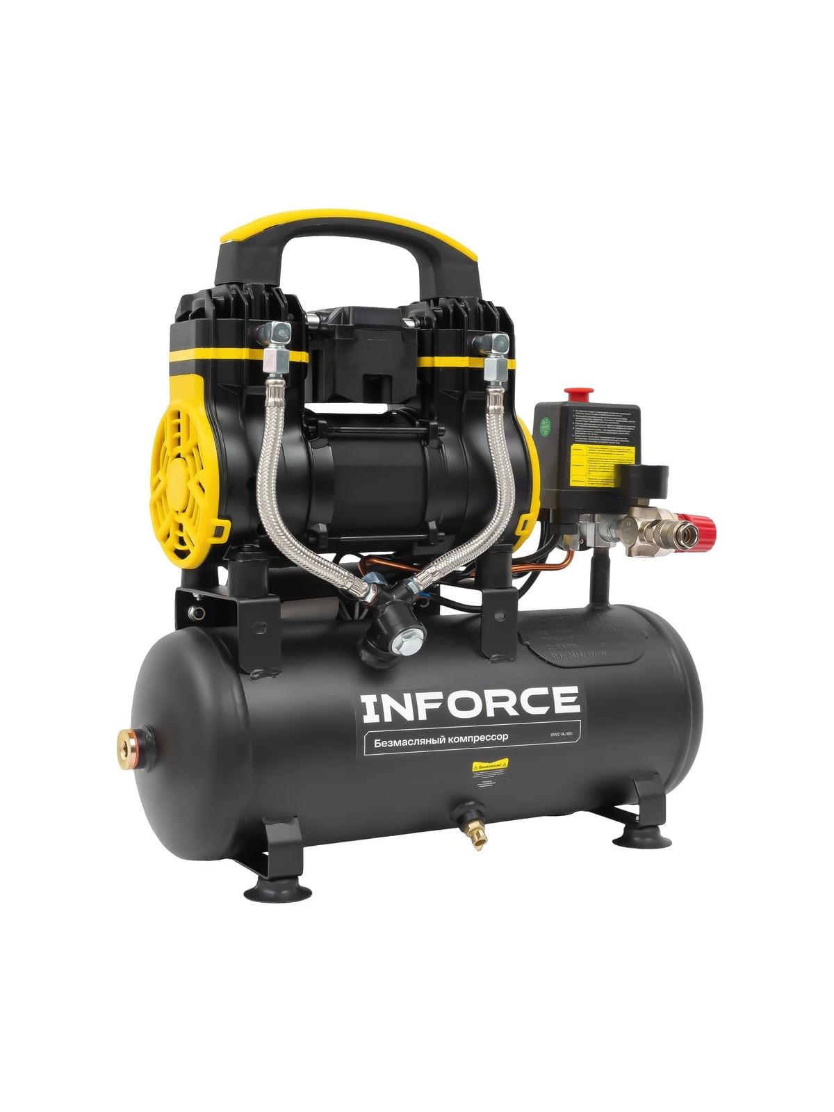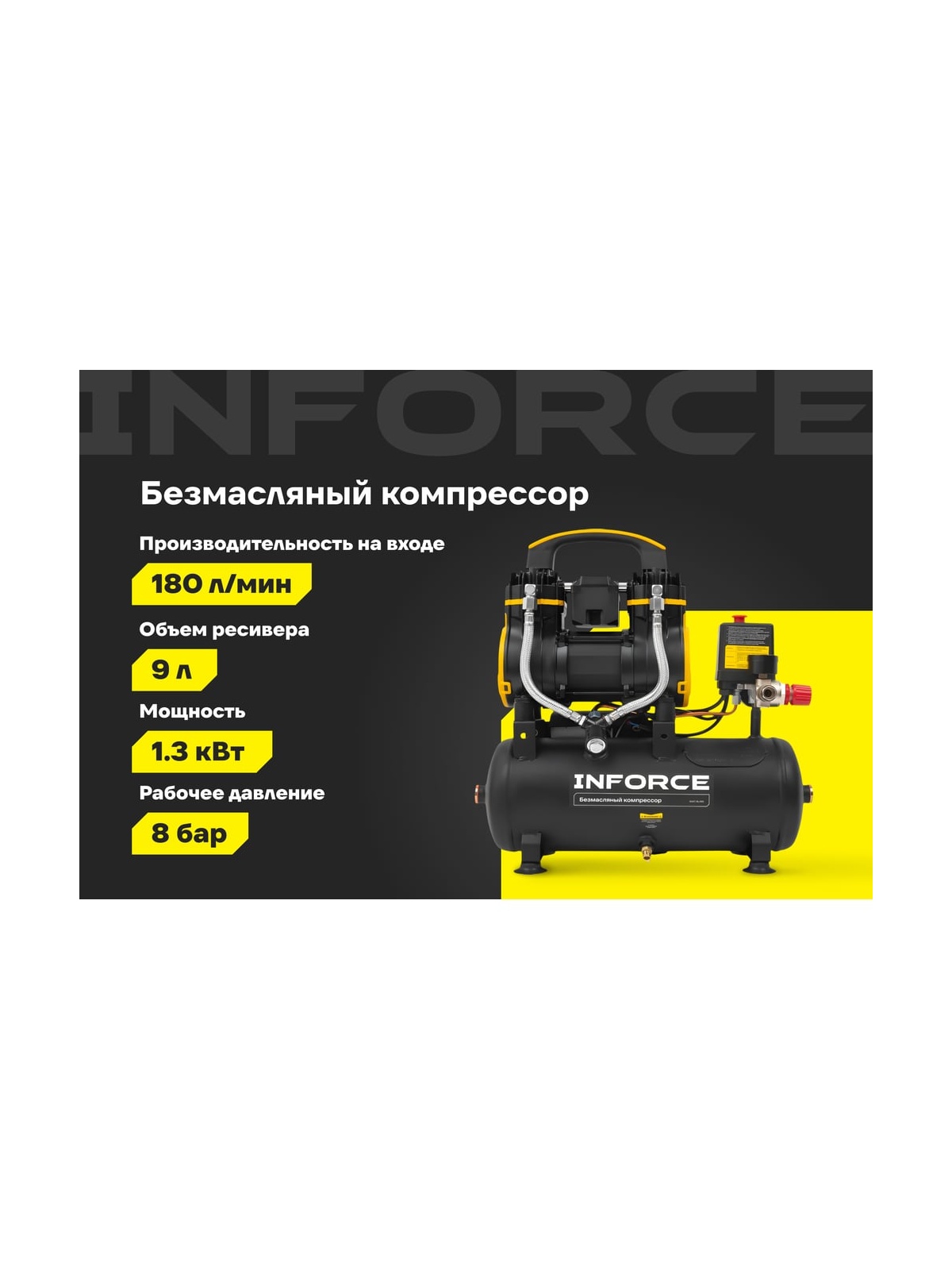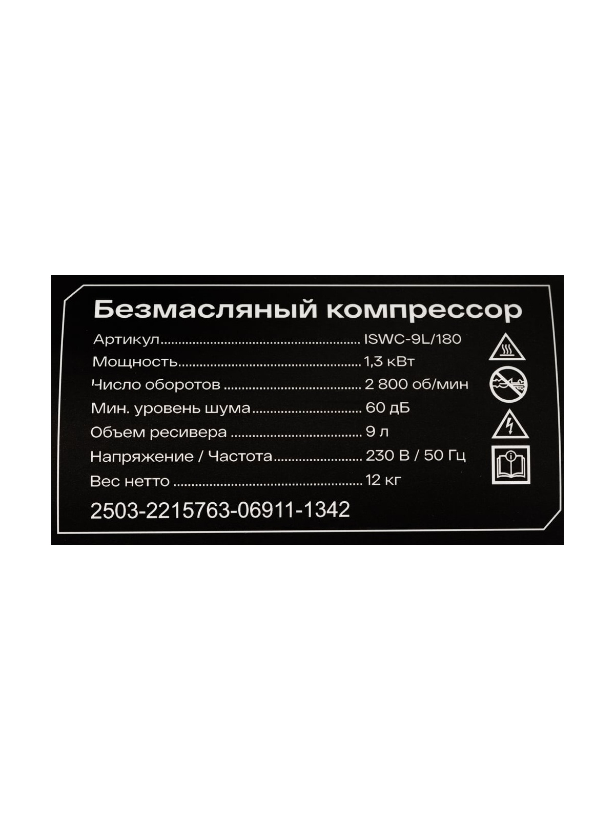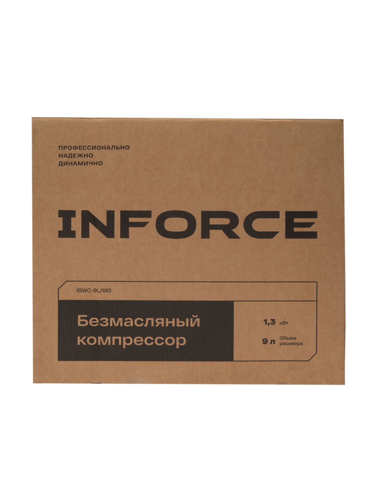 Безмасляный компрессор Inforce ISWC-9L/180 имеет высокопроизводительный и тихий электродвигатель, индивидуальный воздушный фильтр, эффективную систему охлаждения. 4 степени защиты: Предохранительный клапан срабатывает при достижении давления в ресивере в 9 бар. Электромагнитный клапан автоматически сбрасывает давление в магистралях, после выключения компрессора. Защита от перегрузки. Защита от перегрева автоматически отключает аппарат при превышении допустимой температуры, предотвращая перегрев.
