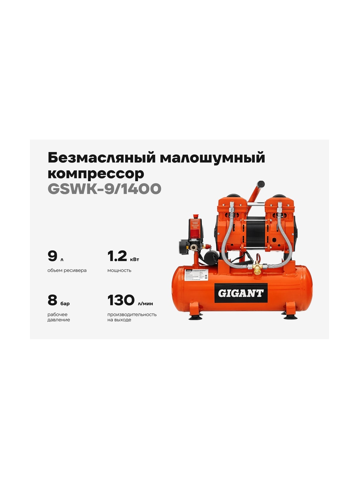 Безмасляный малошумный компрессор Gigant GSWK-9/1400 представляет собой современное оборудование для питания пневмоинструмента. Для защиты от перегрева предусматривается система аварийного отключения модели в случае повышения температуры рабочих узлов. Внутренняя поверхность ресивера имеет антикоррозийное покрытие, благодаря которому образование конденсата не влияет на продолжительность эксплуатации компрессора.