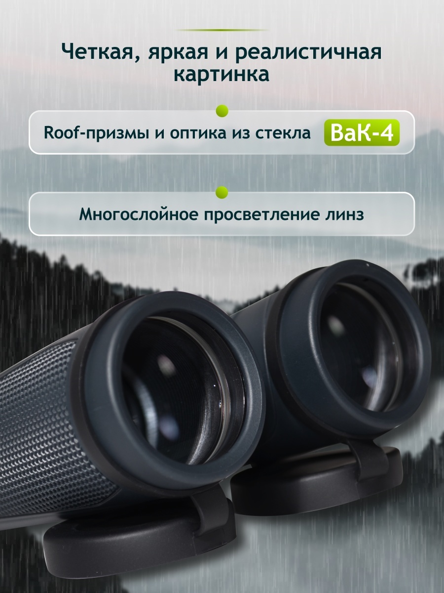 Бинокль полностью защищен от воздействия пыли, воды, песка, снега и грязи - в этом помогает герметизация корпуса, соответствующая стандарту IP67. Корректной работе прибора не помешают никакие осадки, а также прямое погружение в воду на глубину до 1 метра. Бинокль не подвержен распространенной проблеме запотевания оптики при скачках внешней температуры, поскольку внутри его корпус заполнен азотом. Переноска Levenhuk New Karma PLUS 10x42 в руках, походном рюкзаке или сумке происходит с комфортом - бинокль имеет относительно небольшие размеры из-за использованных в конструкции roof-призм. Снаружи корпус прибора имеет обрезиненное покрытие, а значит, его будет удобно удерживать и сухими, и мокрыми руками.