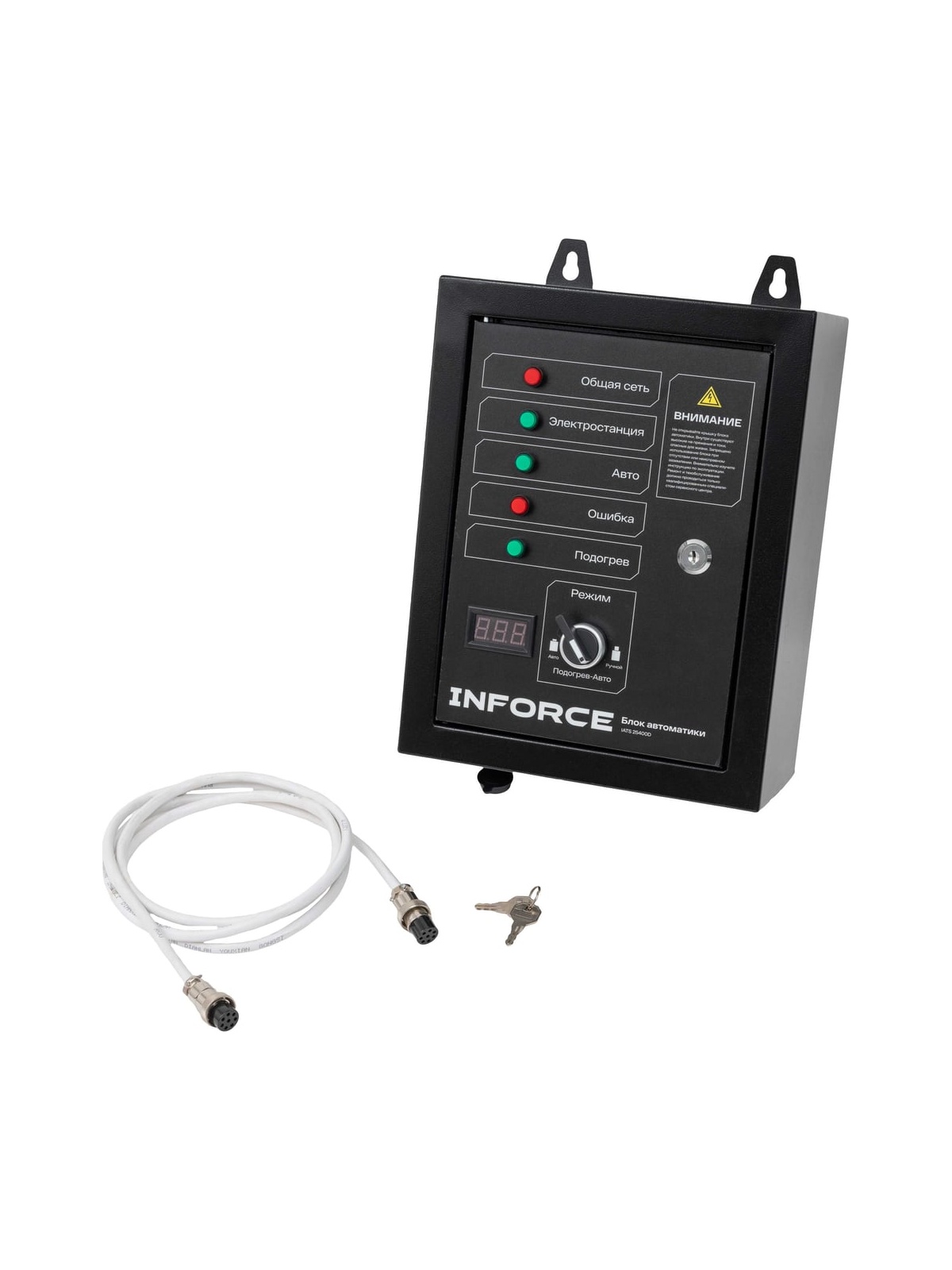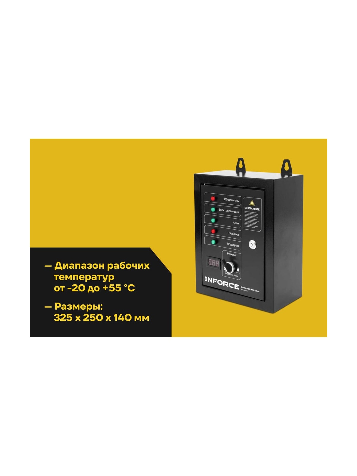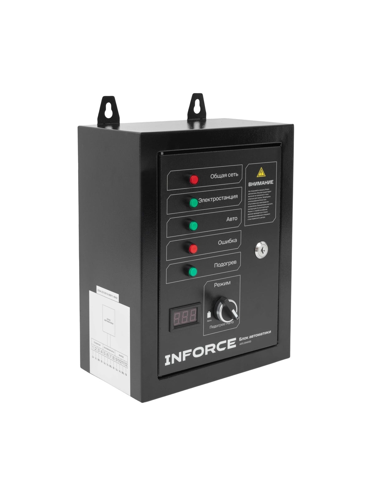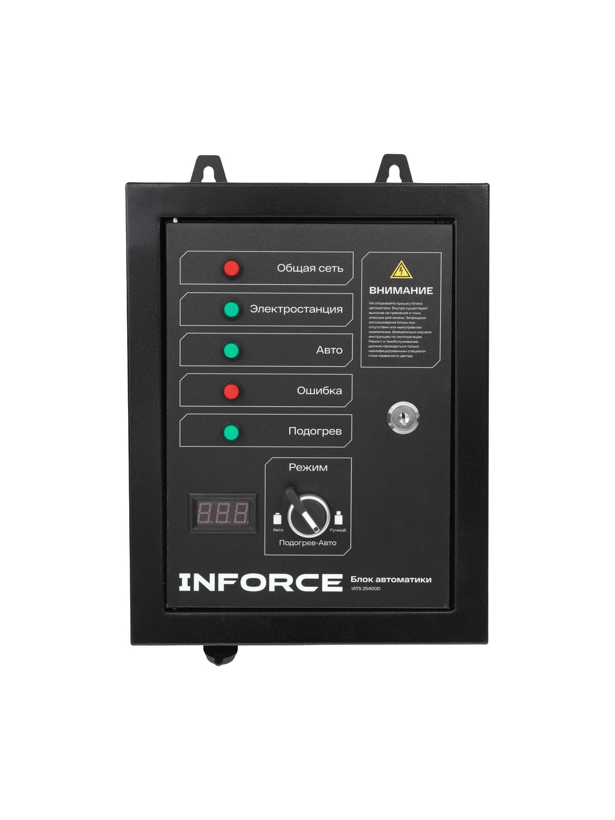 Блок автоматики Inforce IATS 25400D обеспечивает автоматический запуск дизельных генераторов в случае падения напряжения в основной сети или прекращения подачи электроэнергии. При возобновлении подачи электричества автоматика переводит питание на внешнюю сеть и отключает генераторную установку.