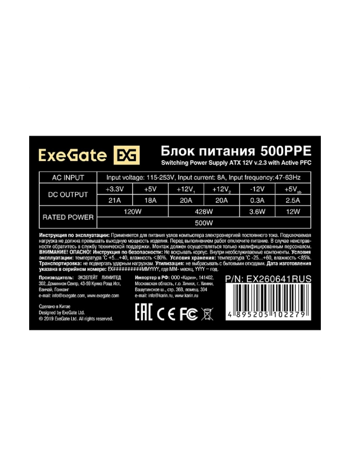 Блок питания 500W ExeGate 500PPE (ATX, APFC, PC, КПД 80% (80 PLUS), 12cm fan, 24pin, 2x(4+4)pin, 2xPCI-E, 5xSATA, 3xIDE, black, кабель 220V в комплекте)