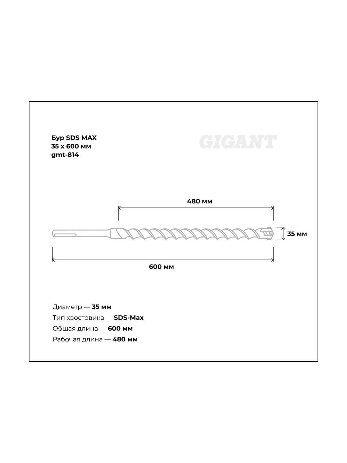 Бур SDS MAX 35x600мм Gigant gmt-814 используется в качестве оснастки на тяжелых перфораторах с хвостовиком SDS MAX. Подходит для сверления глубоких отверстий в кирпиче и особо прочных материалах: армированном бетоне, природном и искусственном камне.