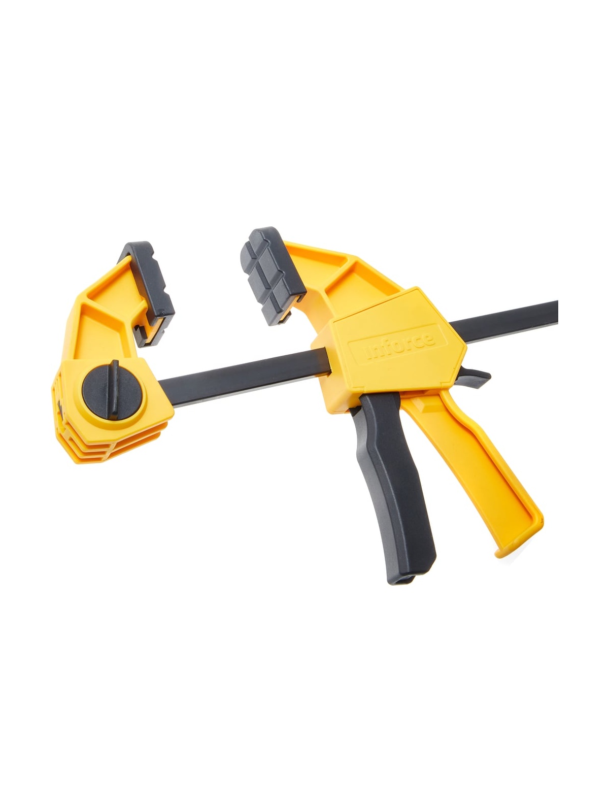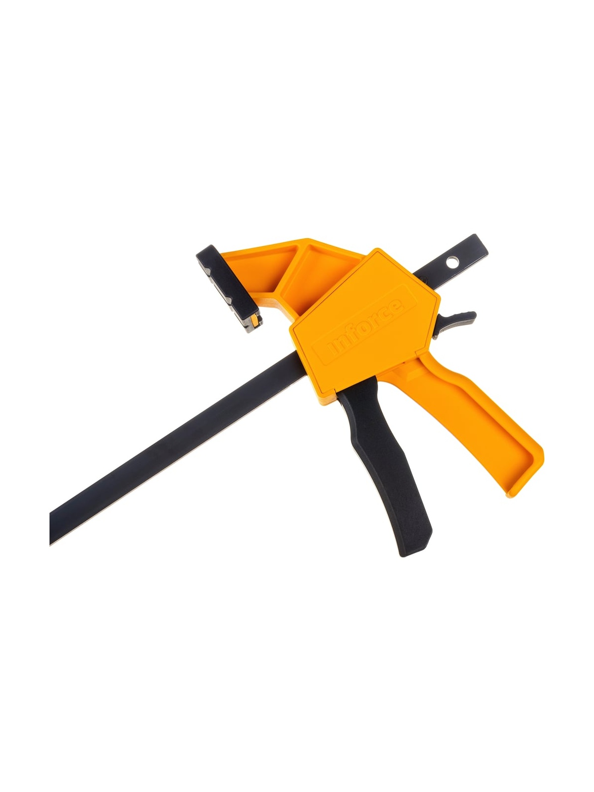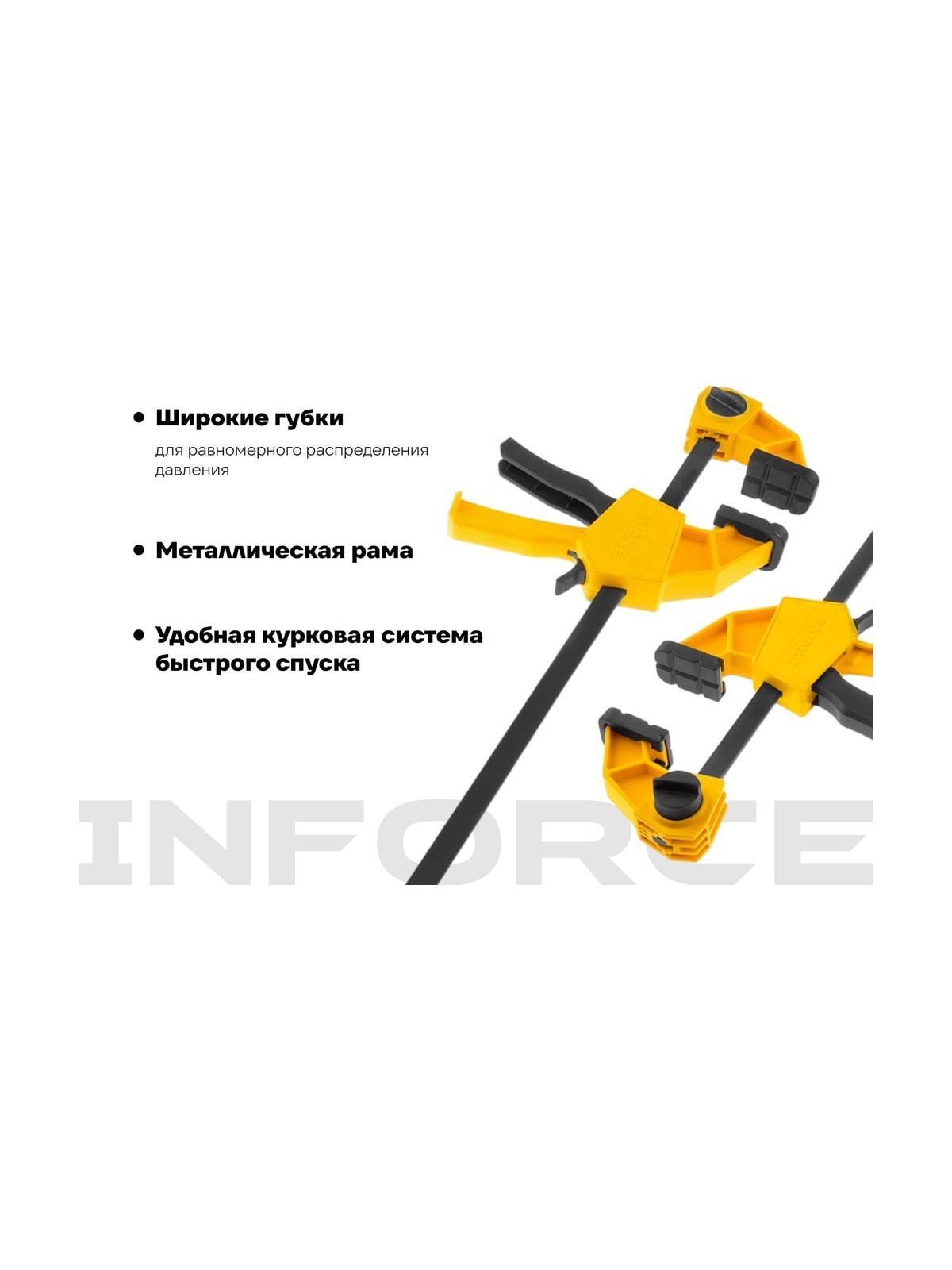 Быстрозажимные струбцины Inforce 60x300 мм, 2 шт. 06-03-34-2 оснащаются удобной курковой системой быстрого спуска и широкими губками, которые равномерно распределяют давление до 63 килограммов. Инструмент оптимален для проведения работ по деревообработке. Благодаря прочной конструкции струбцины отличаются надежностью и долговечностью.