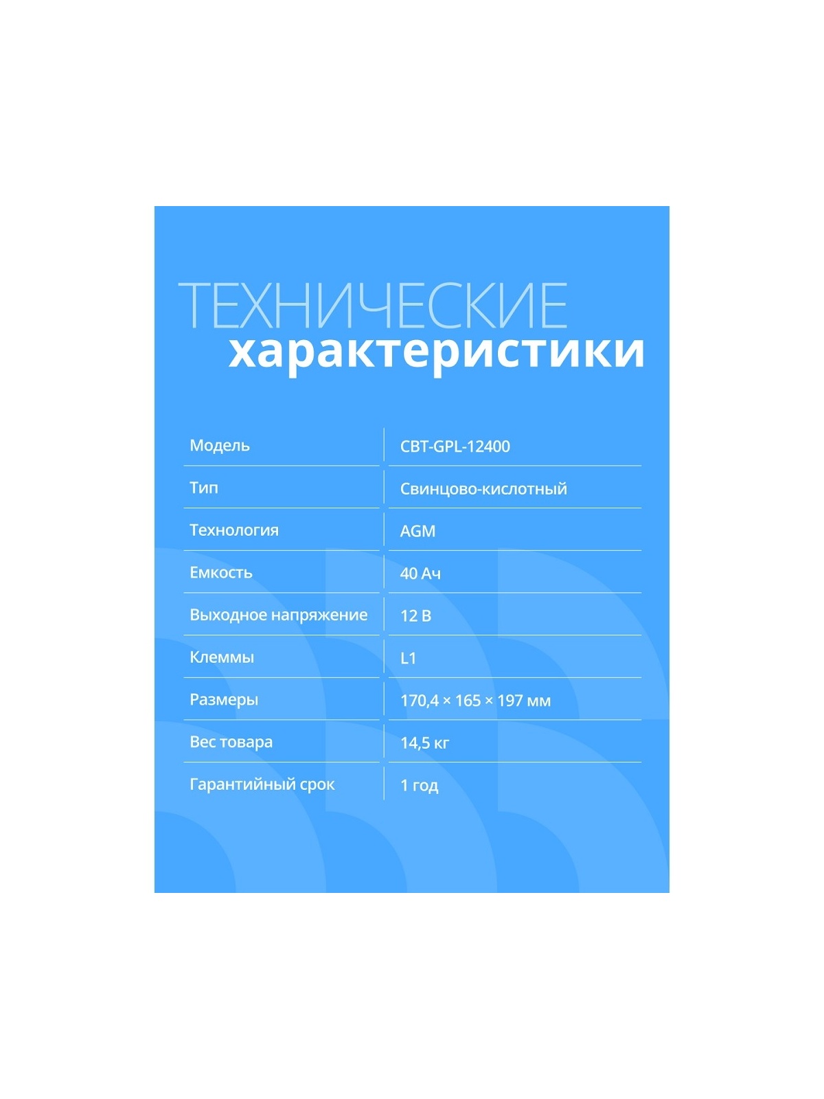 CBR Аккумуляторная VRLA батарея CBT-GPL-12400 (12В 40Ач), клеммы L1 (болт М5 с гайкой)