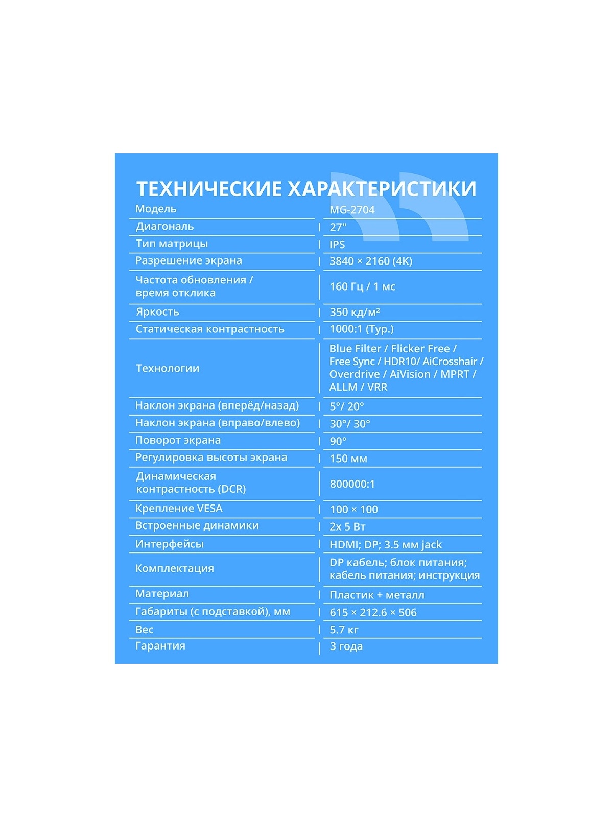 CBR LCD Монитор 27" MG-2704, IPS, UHD 4K 3840x2160, 160Гц, Динамики 2*5W, HAS, Pivot, 2*DP/2*HDMI, внешний БП, черный, кабель DP 1.5м [LCD-MG2704-OPC]