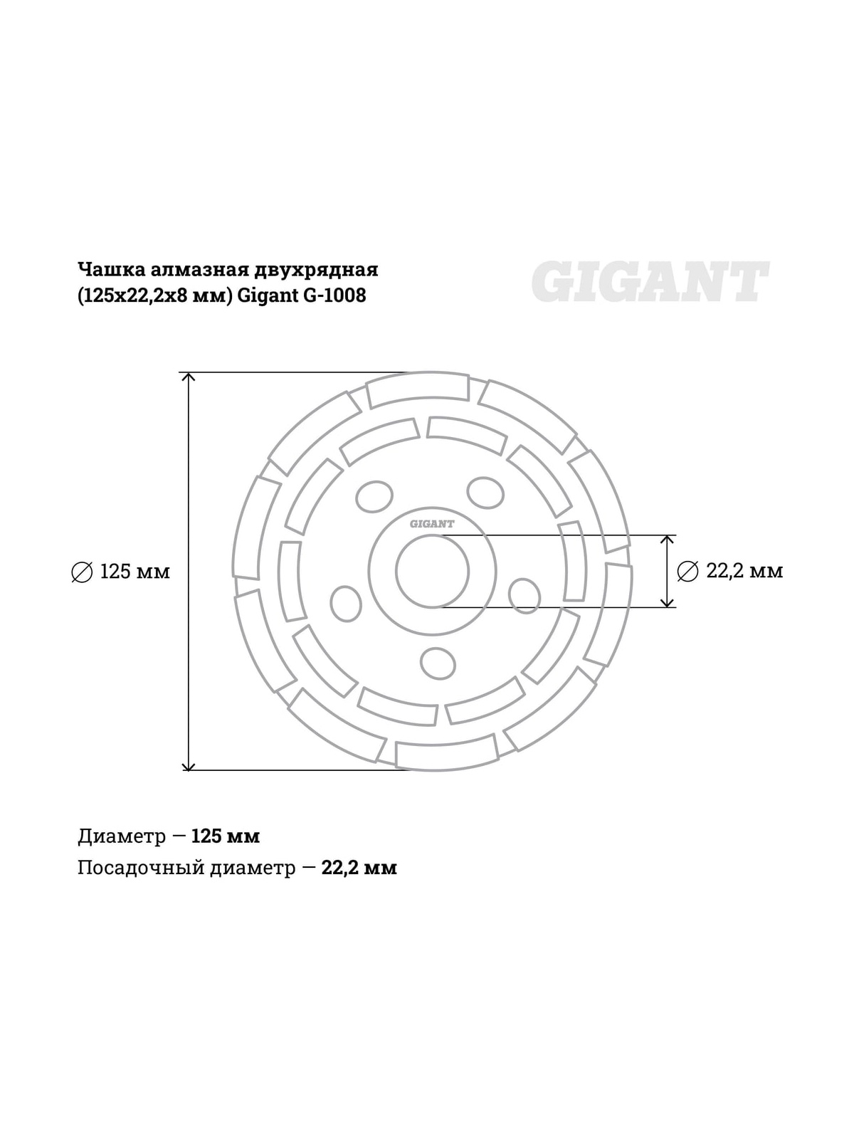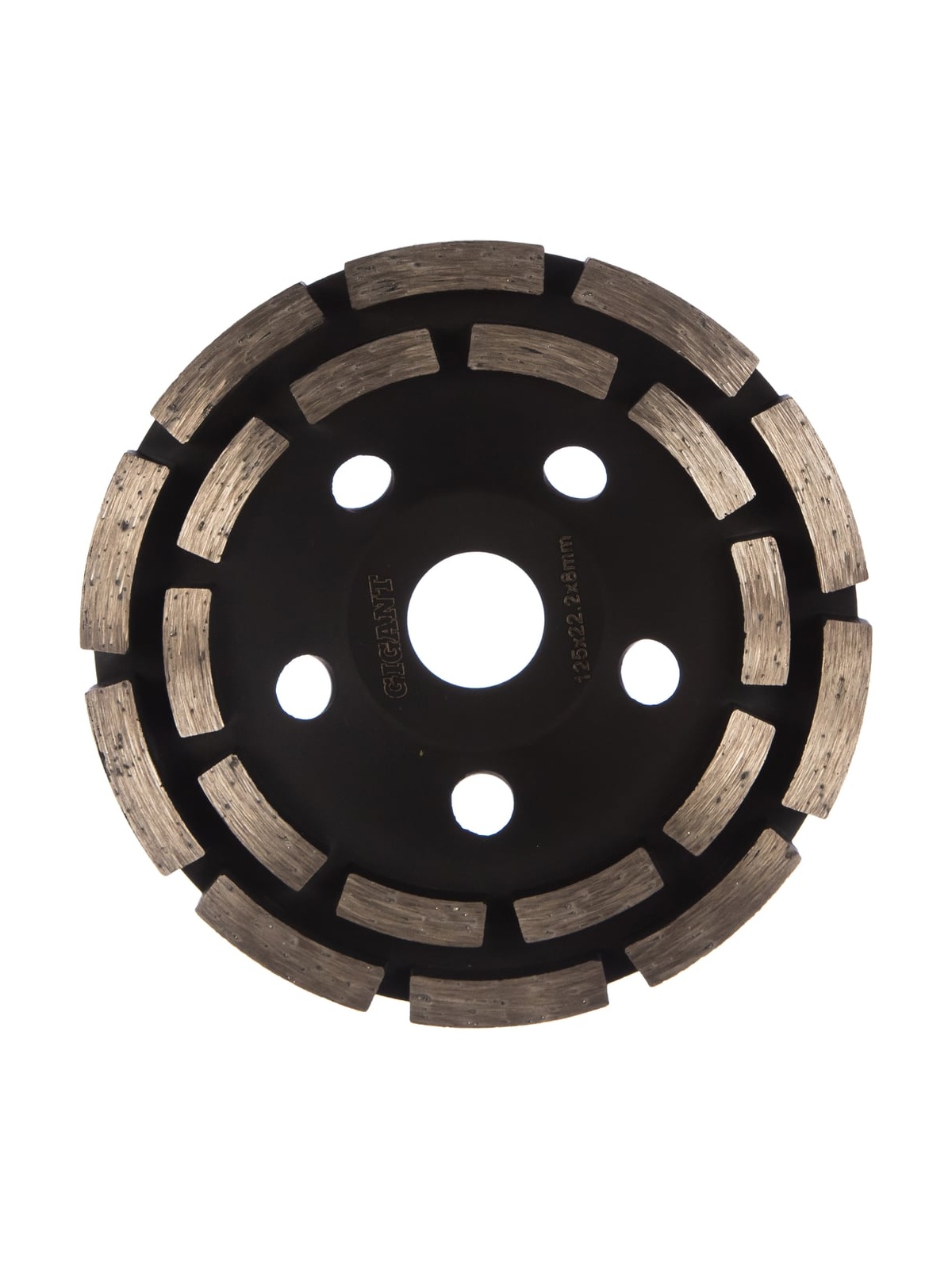 Чашка алмазная двухрядная Gigant G-1008 предназначена для угловых шлифовальных машин. Высота алмазного слоя составляет 8 мм, что больше стандартной для дисков того же класса. Применяется для шлифования поверхностей из бетона, гранита и искусственного камня. Двойная сегментированная поверхность чашки не требует водяного охлаждения во время работы. Увеличенная до 8 мм высота сегмента обеспечивает повышенный срок службы.