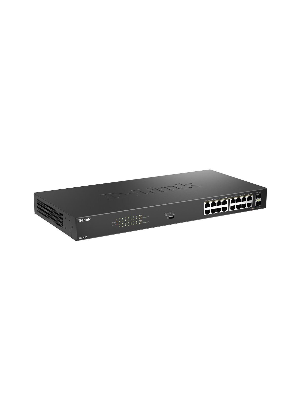 D-Link DGS-1018P/B1A Конфигурируемый коммутатор с 16 портами 10/100/1000Base-T, 2 портами 1000Base-X SFP и DIP-переключателем (16 портов PoE 802.3af/at, PoE-бюджет 240 Вт)