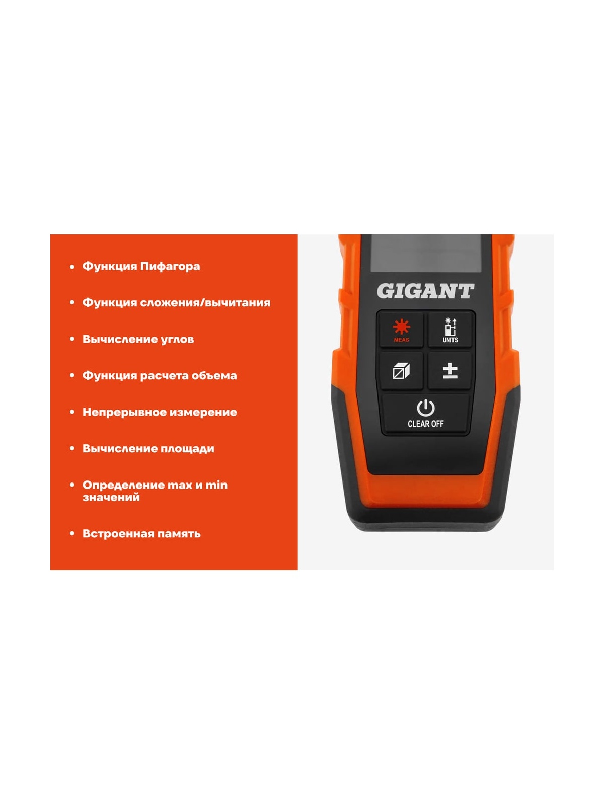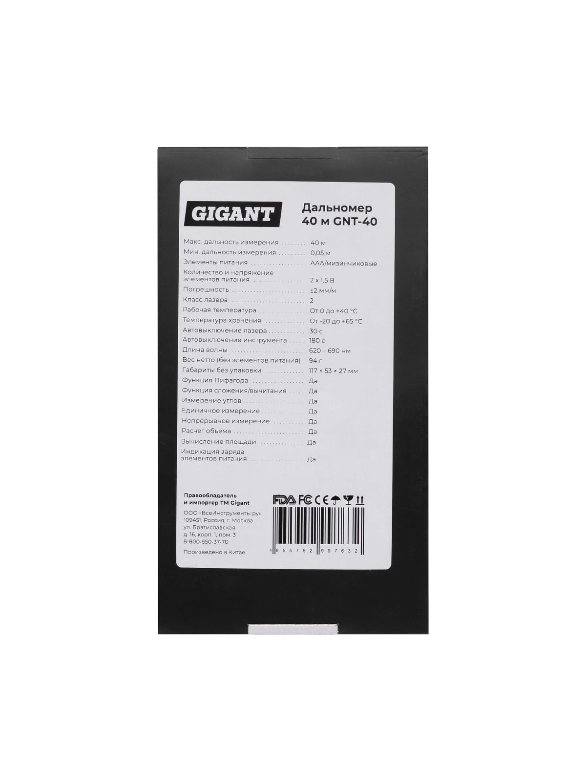 Дальномер Gigant GNT-40 предназначен для измерения расстояний от 0.05 до 40 метров. Для удобства работы в инструменте предусмотрены функции сложения и вычитания, вычисления объема, косвенного измерения, вычисления площадей. Автоматическое выключение дальномера осуществляется через три минуты бездействия. Встроенный электронный уровень. Работает на двух батарейках ААА - их хватит на более 5 тысяч измерений. Модель имеет индикатор заряда батареи.