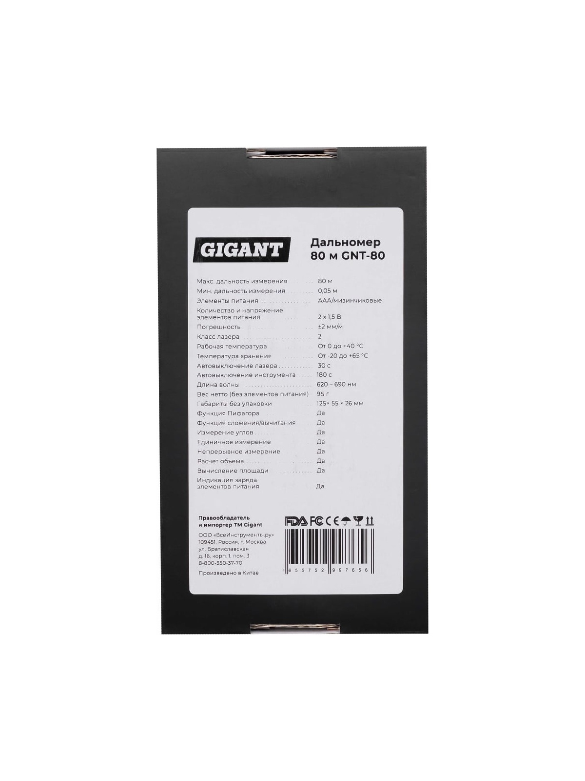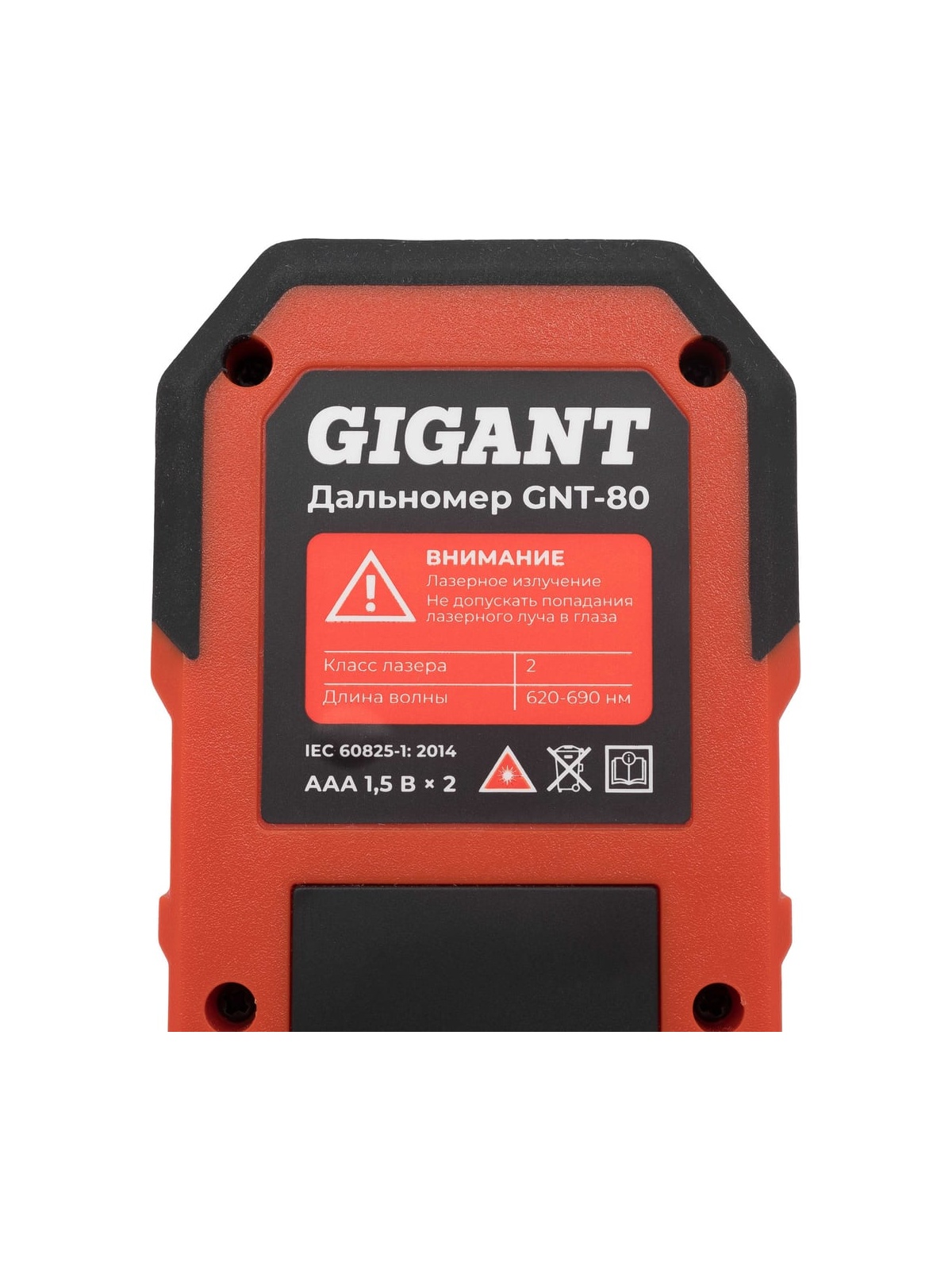 Дальномер Gigant GNT-80 предназначен для измерения расстояний от 0.05 до 100 метров. Для удобства работы в инструменте предусмотрены функции сложения и вычитания, вычисления объема, косвенного измерения, вычисления площадей. Автоматическое выключение дальномера осуществляется через три минуты бездействия. Встроенный электронный уровень. Работает на двух батарейках ААА - их хватит на более 5 тысяч измерений. Модель имеет индикатор заряда батареи.