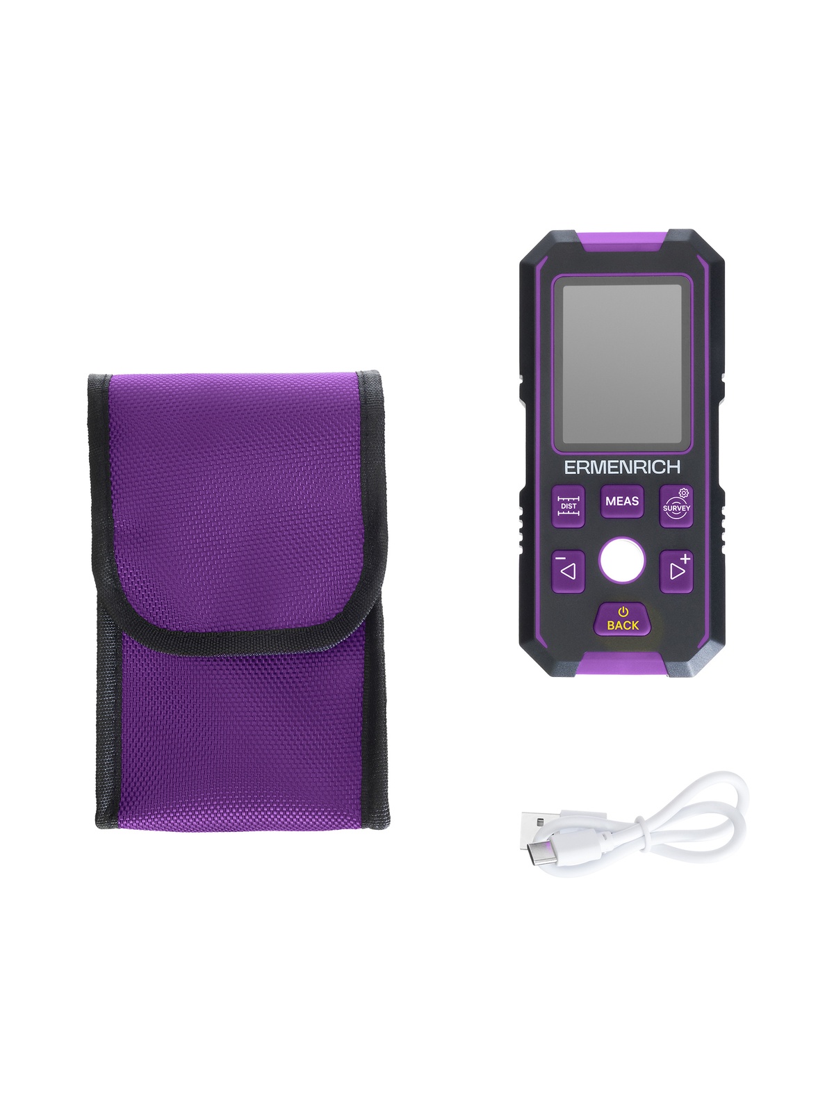 В детекторе Ermenrich Ping SM90 есть функция лазерной рулетки для измерения длины в диапазоне 0,2–40 м, доступно измерение в дюймах и футах. Предусмотрено два режима: единичное измерение или сканирование. Результаты замеров сохраняются во внутренней памяти детектора. По длине, ширине и высоте устройство автоматически вычисляет объем и площадь. С помощью функции «Пифагор» вычисляется длина стороны в прямоугольном треугольнике, например, для определения высоты объекта. Еще одна полезная функция – цифровой уровень для измерения углов от –90° до +90°.