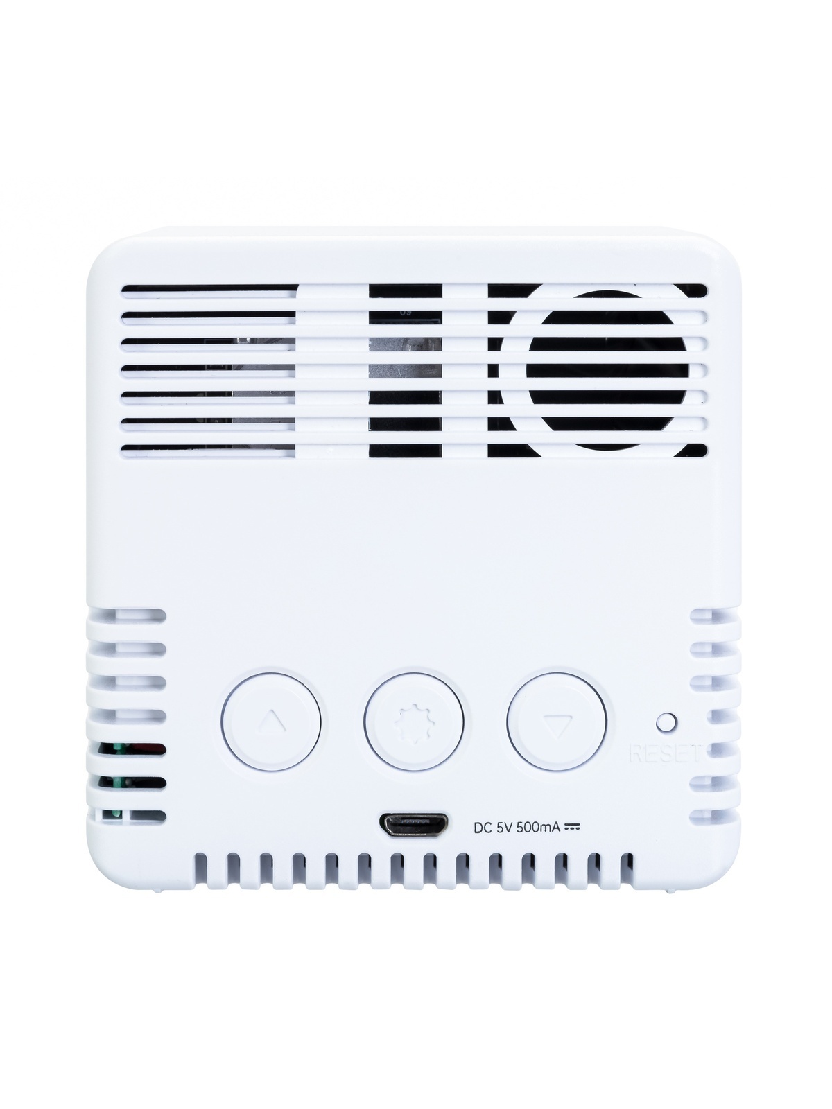 Информация об уровне CO2 выводится на встроенный экран крупно в центре: здесь и шкала, по которой удобно ориентироваться, и непосредственно измеряемое значение. Рядом расположена иконка уровня общего комфорта. Также детектор имеет функции термометра, гигрометра и часов. Температура и влажность воздуха выводятся в верхней части экрана, время – в нижней. Экран имеет подсветку.