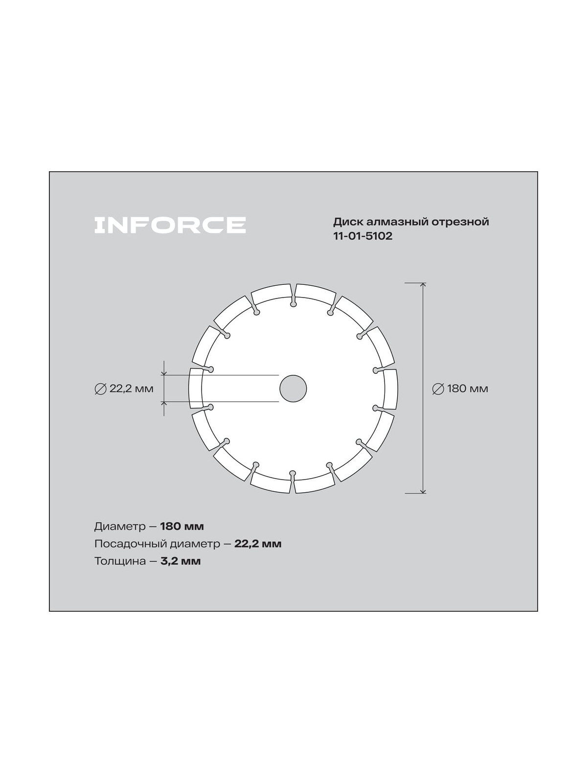 Диск алмазный отрезной по бетону 180x22,23 Inforce 11-01-5102 предназначен для работы с угловыми шлифмашинами ручного применения. Внешний диаметр - 180 мм, внутренний — 22,23 мм, толщина - 3,2 мм.
