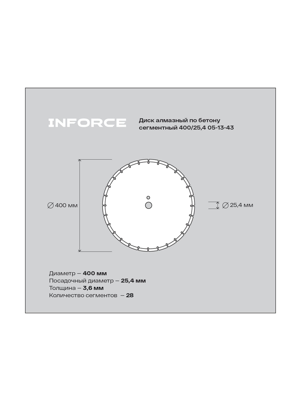 Диск алмазный по бетону сегментный 400/25,4 Inforce 05-13-43 применяется для резки на швонарезчиках, бензорезах и станках таких материалов как : бетон бетон со слабым и средним уровнем армирования кирпич песчаник тротуарная плитка Имеет высоту алмазного сегмента 10 мм ,что не мало важный фактор для высокой производительности алмазного инструмента. Подходит для работы как с водяным охлаждением так и без него