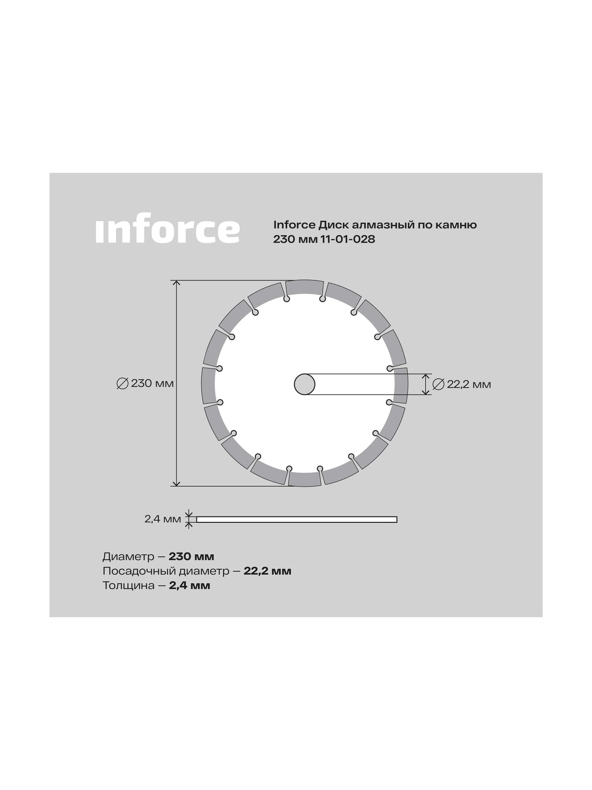 Увеличенная до 12мм высота алмазного слоя обеспечивает высокий ресурс Диск алмазный Inforce 11-01-028 предназначен для работ по искусственному и натуральному камню, бетону, кирпичу с помощью УШМ. Изготовлен с использованием лазерной технологии, что обеспечивает высокую скорость реза и увеличенный ресурс. Не рекомендован для абразивных материалов.