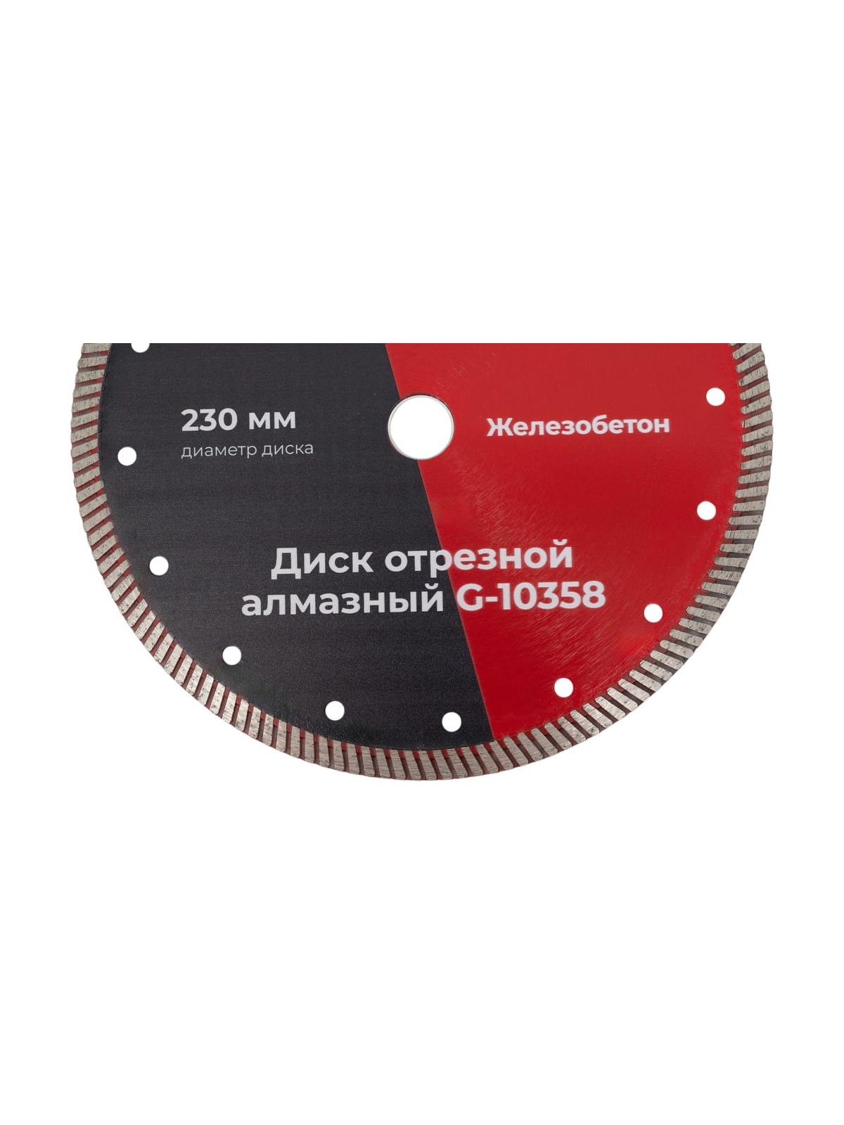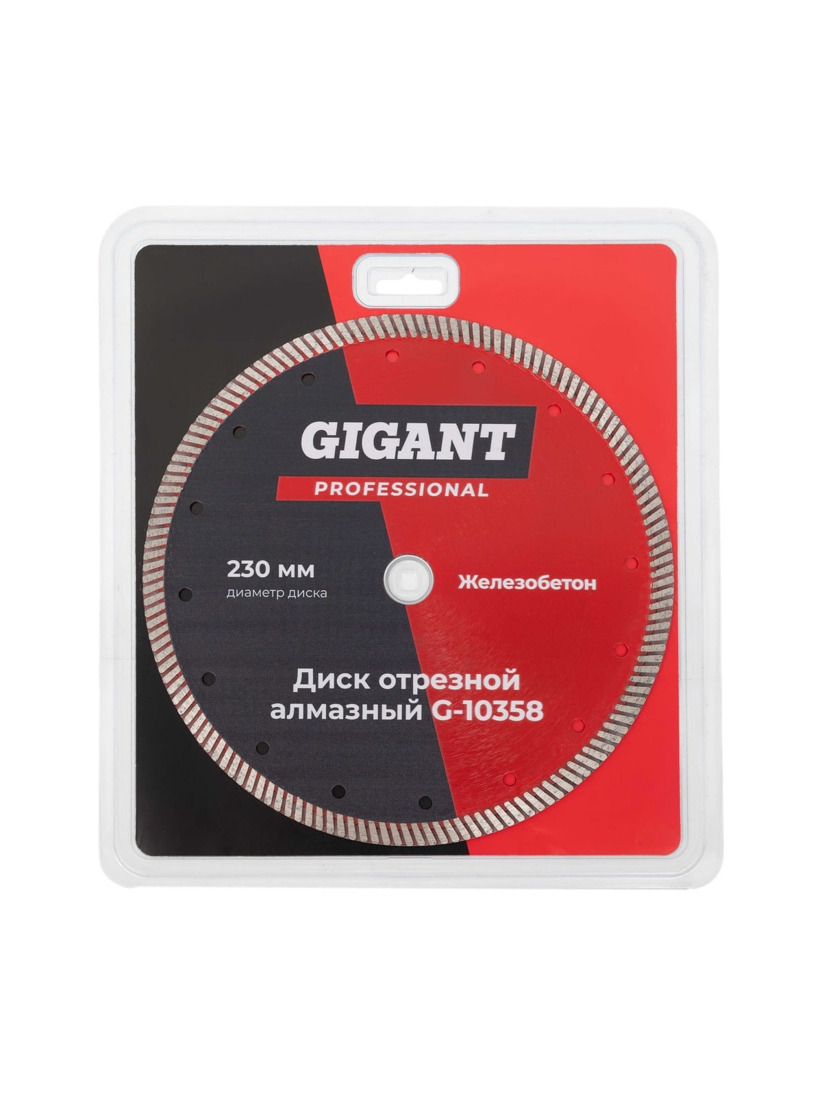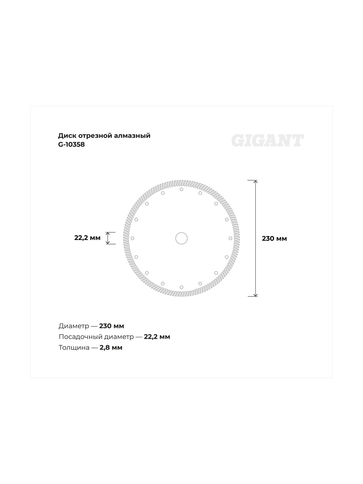 Диск отрезной алмазный 230 мм Gigant G-10358 предназначен для работы с железобетоном и чугуном, что делает его универсальным инструментом для строительных и ремонтных работ. Диаметр диска составляет 230 мм, а посадочный диаметр — 22.2 мм, что обеспечивает совместимость с большинством стандартных углошлифовальных машин. Сегментированный тип диска способствует эффективному охлаждению и снижению нагрузки на инструмент, что увеличивает срок его службы. Толщина диска 2.8 мм и высота алмазного слоя 10 мм обеспечивают точность и качество реза. Максимальная частота вращения 6650 об/мин позволяет выполнять работы быстро и эффективно.