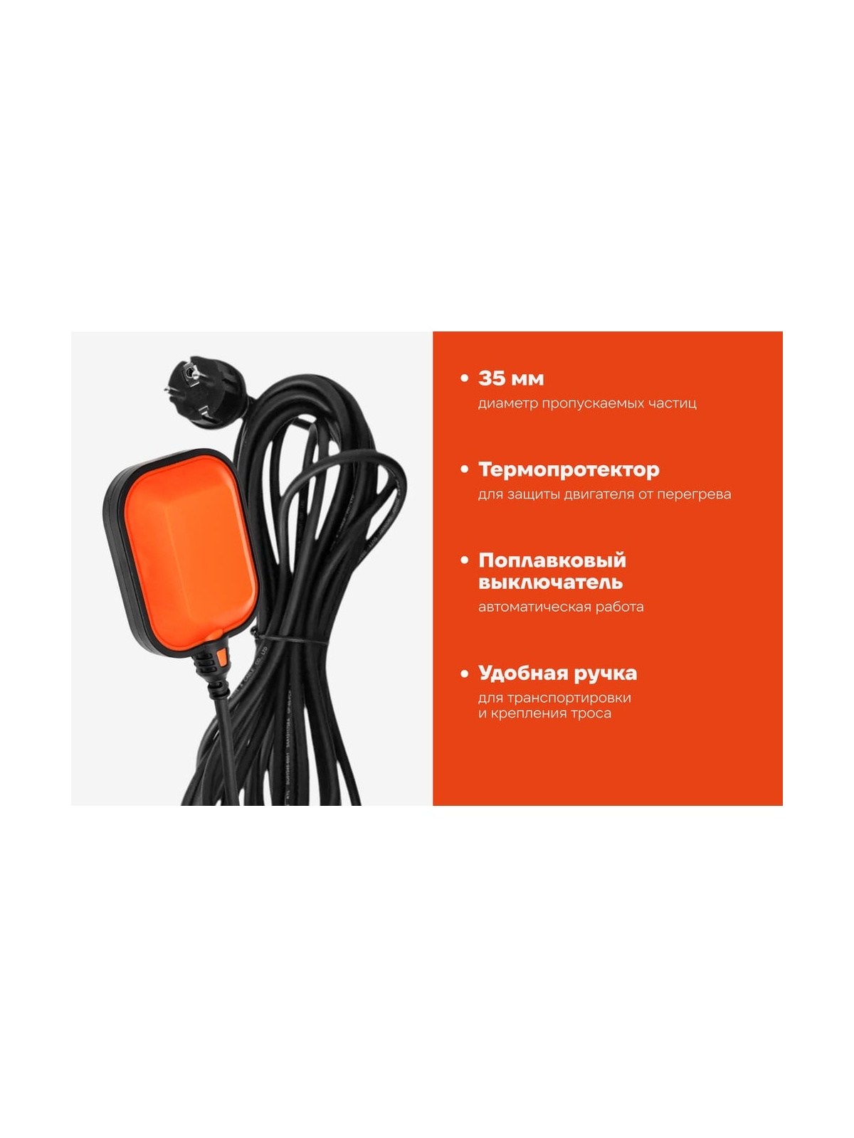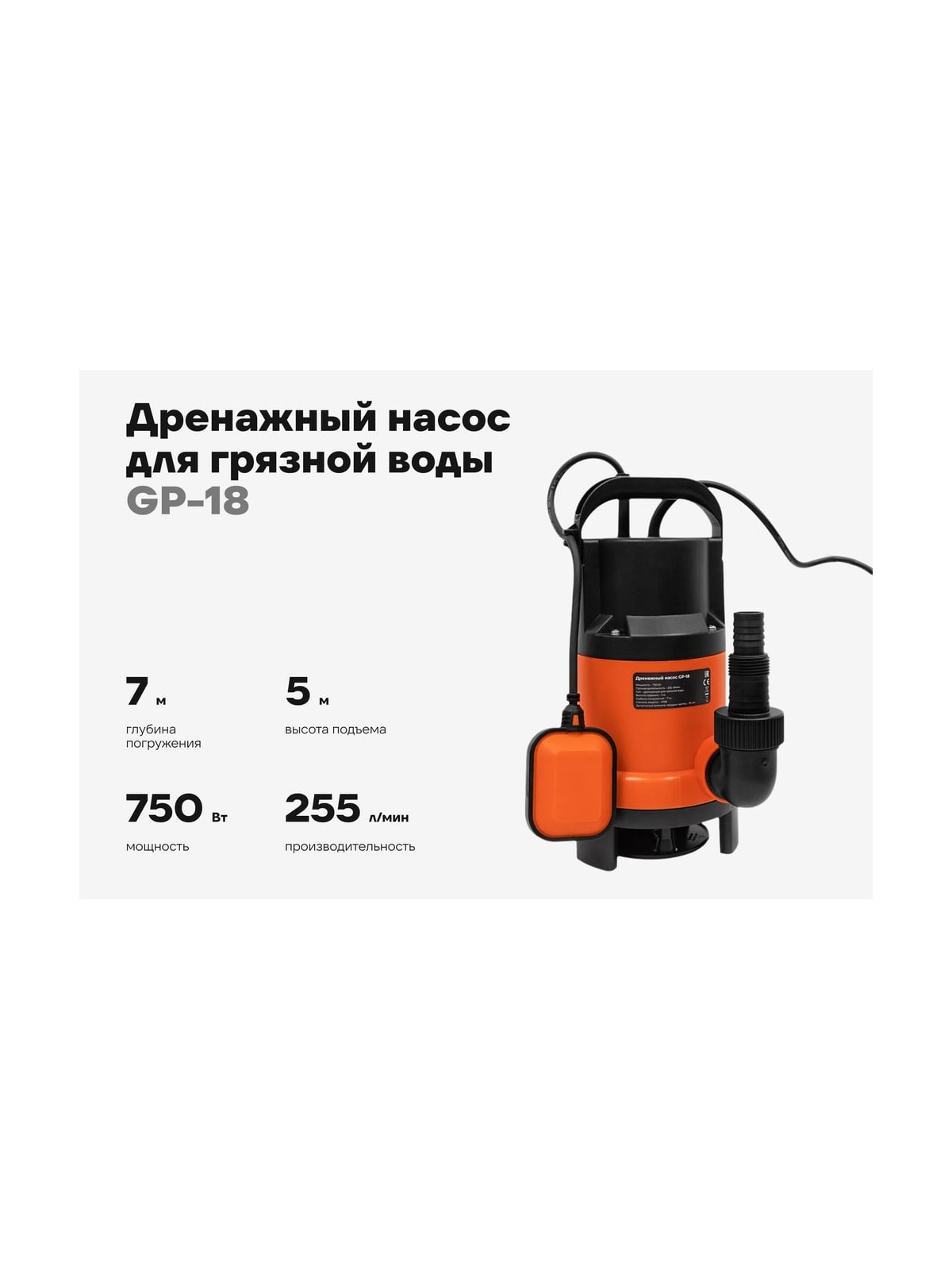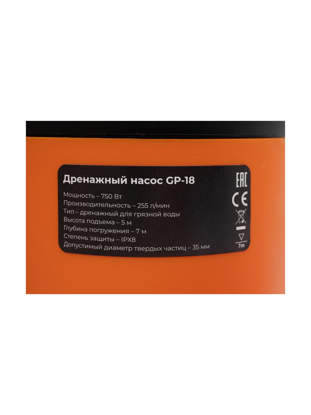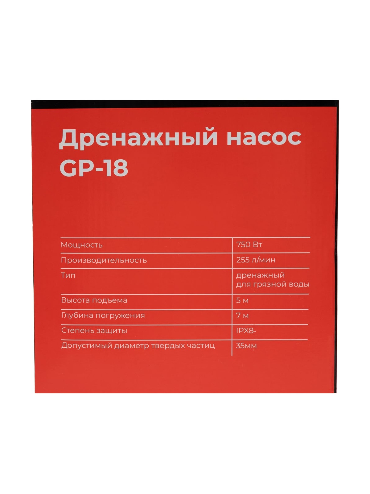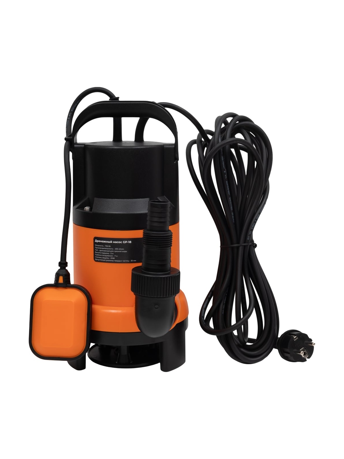 Дренажный насос для грязной воды Gigant GP-18 используется для перекачки загрязненной воды из естественных водоемов, оросительных каналов и дренажных колодцев, затопленных жилых помещений и подвалов. Допустимый размер пропускаемых механических частиц - до 35 мм. Использование в воде с более крупными включениями изнашивает рабочие части насоса и может привести к заклиниванию рабочего колеса. Дренажный насос оснащен поплавковым выключателем для предотвращения работы «всухую». Длина кабеля поплавка настраивается в зависимости от дебита водоема, чтобы двигатель отключался при достижении минимального или максимального уровня воды. В модели нижний забор воды, это необходимо учесть при установке уровня выключения насоса. Количество срабатываний не должно превышать 20 в час. Корпус насоса выполнен из пластика, сверху имеется удобная ручка для транспортировки и крепления троса. Насос способен создавать напор в 5 м и перекачивать до 255 л/мин. Выходная магистраль имеет диаметр 1,5 дюйма.