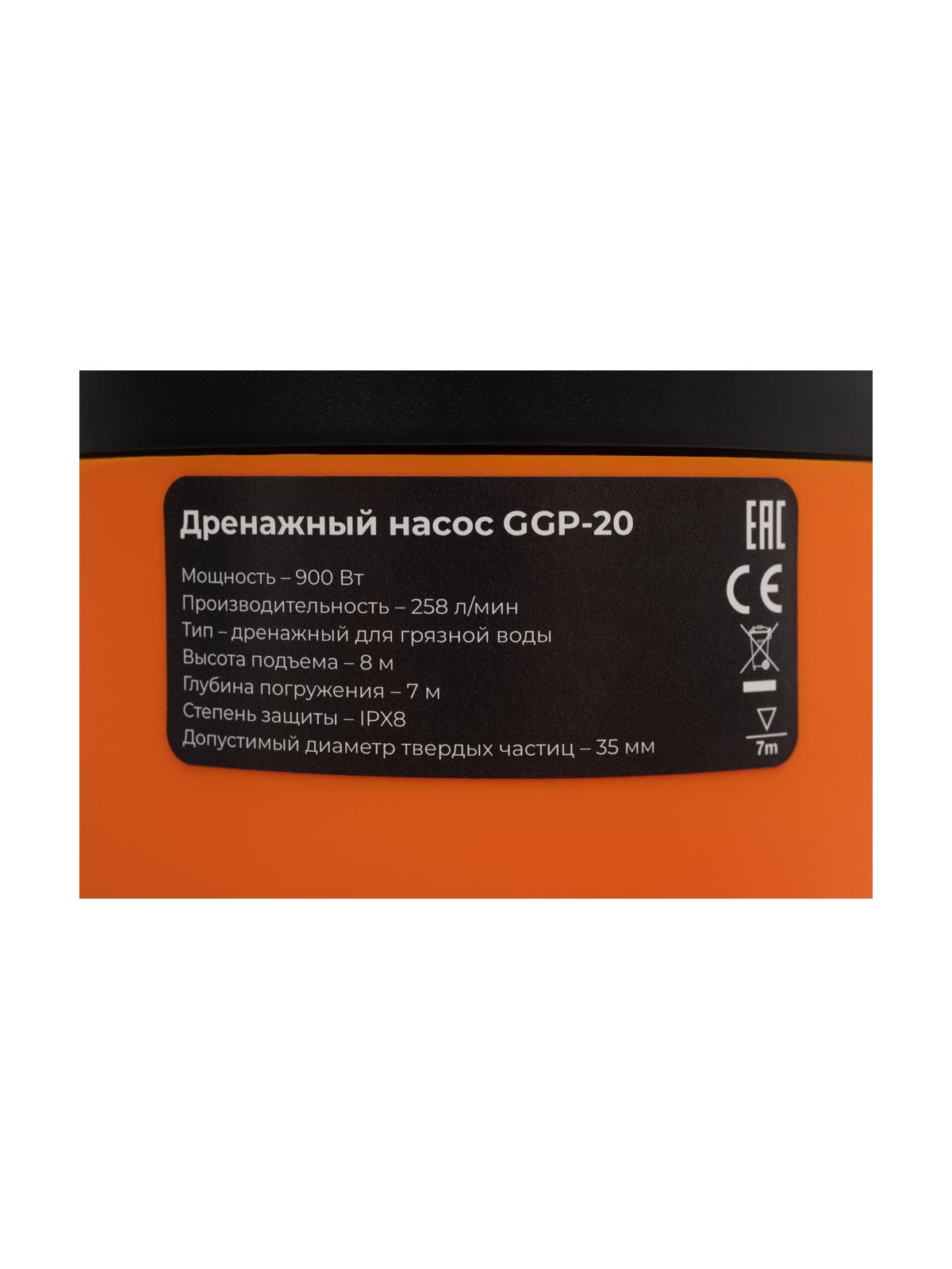 Дренажный насос для грязной воды Gigant GGP-20 обеспечивает подачу воды до 258 л/мин и напор до 8 м. В нём установлен однофазный двигатель, отличающийся надёжностью и большим рабочим ресурсом. Модель предназначена для откачивания грязной воды из подвалов, забора воды для технических нужд из открытых водоёмов, водоотведения из сливных ям. Допустимый диаметр пропускаемых частиц составляет 35 мм. Диаметр выходного отверстия 1.5". Особенностью этого дренажного насоса является наличие в конструкции встроенного поплавка, что позволяет использовать агрегат в узких местах. Основной рабочий режим насоса - автоматический. Предусмотрена также возможность функционирования агрегата в ручном режиме, когда насос работает при отключённом поплавковом выключателе, что обеспечивает откачку при минимальном уровне воды. Корпус выполнен из ударопрочного пластика. Конструкция герметичная. Степень защиты – IPX8. Параметры сети питания – 220 В, 50 Гц.