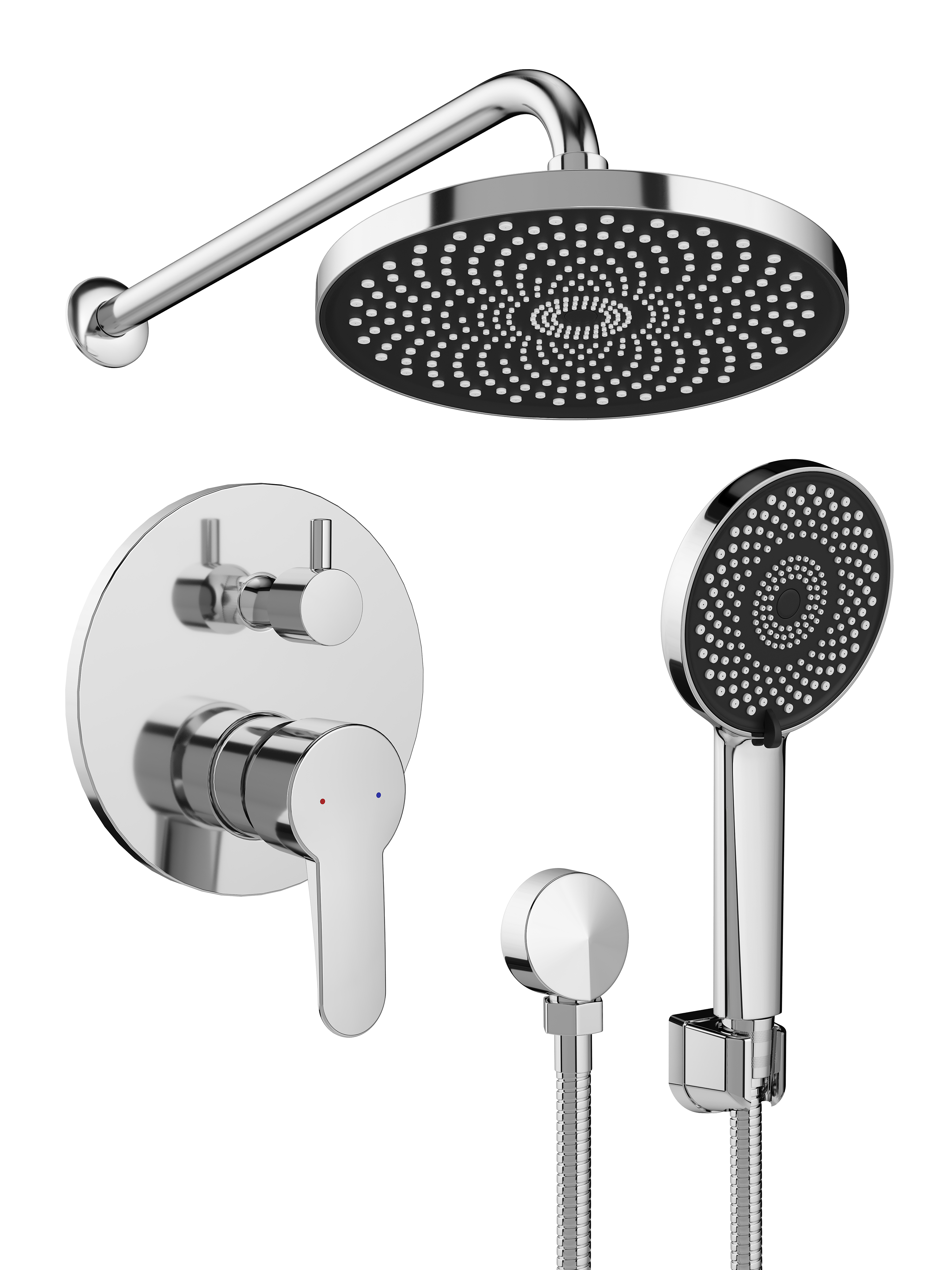 Состав комплекта - настенный держатель,шланговое подключение,верхний душ,душевой гарнитур,смеситель для душа