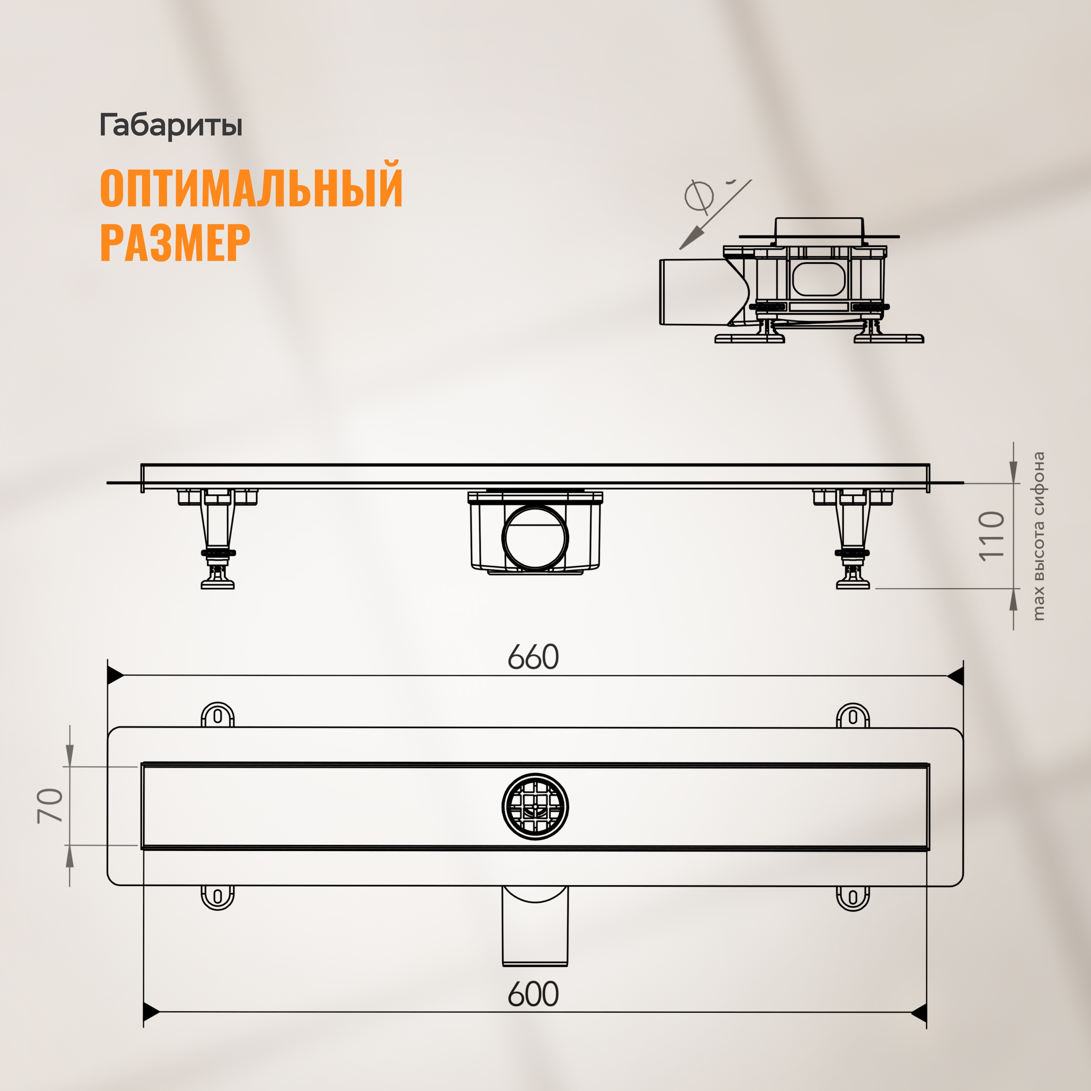 Преимущества - съемный клапан сифона,регулируемые опоры в пределах 3 см,выдерживает нагрузку до 300 кг,высокая пропускная способность,поворотный сифон 360° с регулировкой по высоте