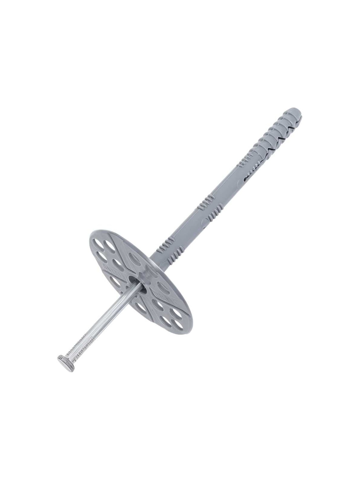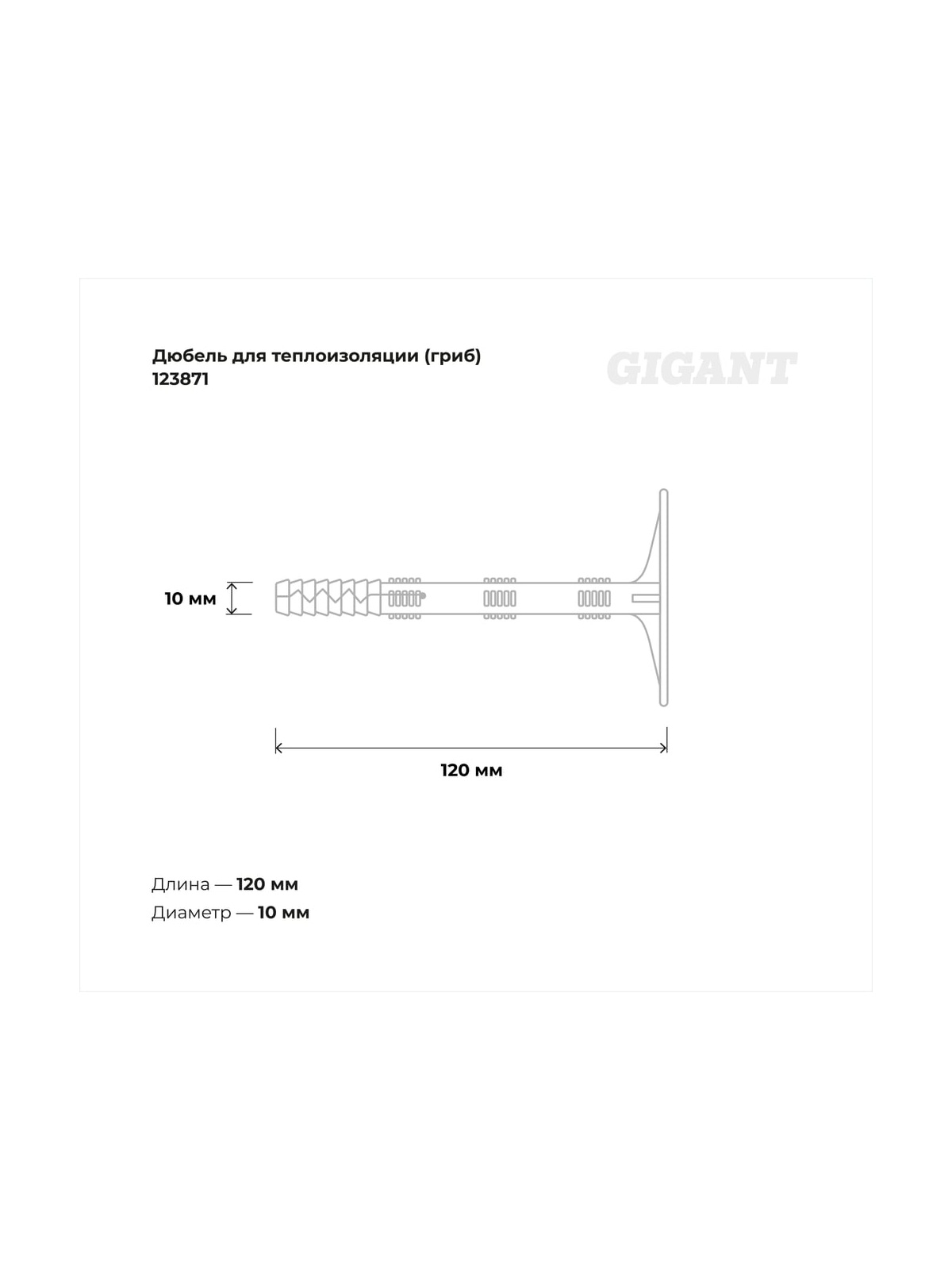 Дюбель для теплоизоляции Gigant (гриб) 10x120 с металлическим гвоздём 50 шт 123871 используется для крепления теплоизоляционных строительных материалов и изделий толщиной до 150 мм. Материал применения: бетон, кладки из полнотелого силикатного и керамического кирпича, пустотелого керамического кирпича, легкий ячеистый бетон. Материал дюбеля: полиэтилен, ударопрочный полипропилен. Увеличенная распорная зона (10 см) дает возможность устанавливать дюбель в пустотелых материалах. Специальные насечки, шипы и зубцы с обратной направленностью на стержне обеспечивают повышенную прочность на вырыв и срез. Повышенная прочность за счет усиленных ребер жесткости в месте соединения шляпки и стержня. Плотное и надежное крепление теплоизоляционных материалов благодаря диаметру шляпки - 60 мм. Гвоздь, выполненный из более жесткого материала, гарантированно забивается, увеличивая общее тепловое сопротивление дюбеля. Установка производится методом сквозного монтажа. В среднем на 1 кв. м площади теплоизоляции применяется 5-8 дюбелей.