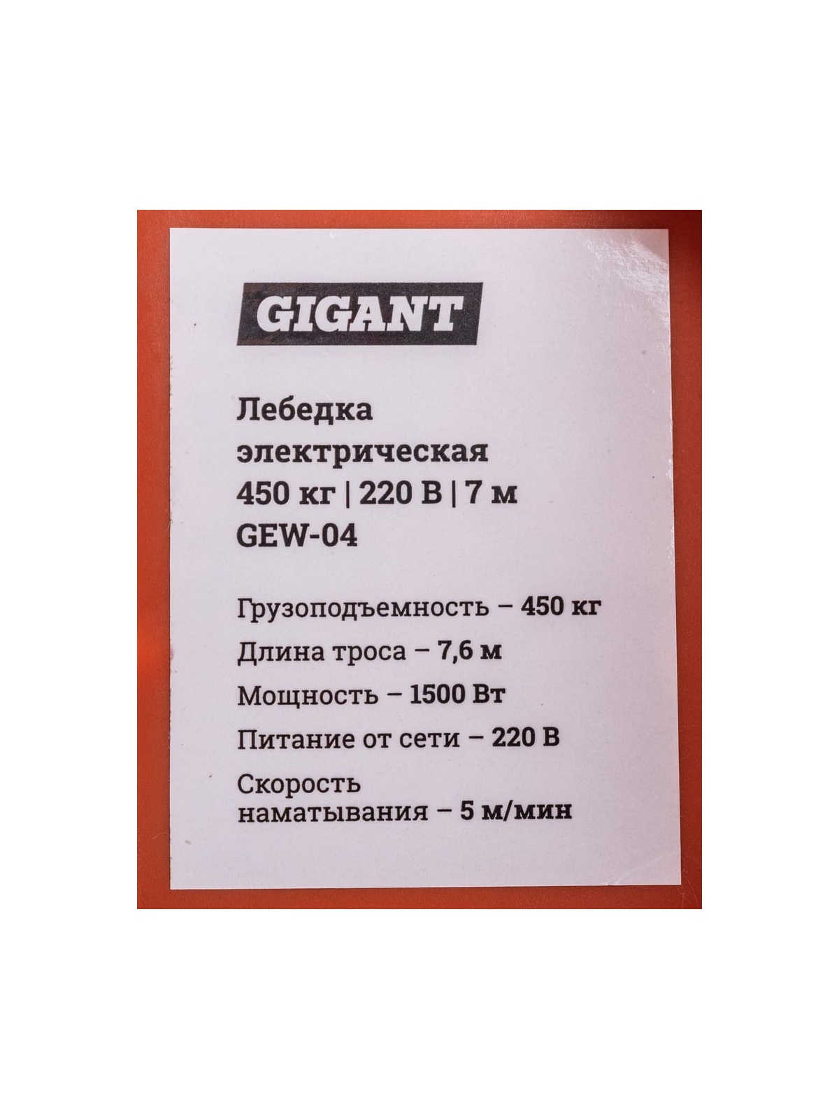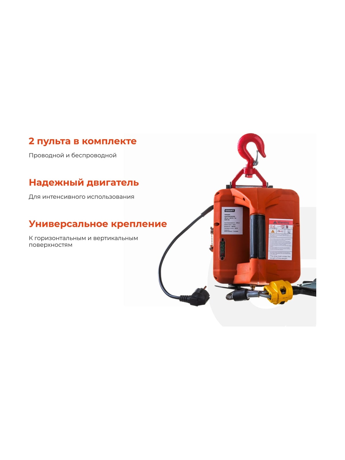 Электрическая лебедка Gigant 225/450кг, 220 В, 7,6/3,8 м GEW-04 предназначена для обеспечения подъемно-транспортных действий при строительных, монтажных и других работах, а также для комплектации подъемных устройств. Лебедка оснащена двигателем на 1,5 кВт. Для удобства эксплуатации предусмотрены два пульта управления проводной и радио). С их помощью можно поднимать или опускать груз (то есть или тянуть, или разматывать трос). Максимальная грузоподъёмность лебедки — 450 кг. Лебедка применяется для: вытягивания застрявшего в яме небольшого автомобиля; подъема катера, лодки или квадроцикла; подъема различных грузов. Продукция представлена профессиональными и бытовыми инструментами, имеет доступную цену и высокое качество. При изготовлении товаров Gigant используется современное оборудование и прочные материалы. Производство осуществляется на современных предприятиях России и Азии. Тестирование товаров осуществляется в два этапа, каждая партия инструментов проходит проверку на соответствие стандартам и заявленным техническим характеристикам. Это является залогом качества и надежности готового продукта. Продукция представлена широкой линейкой инструментов. У нас можно приобрести ручной инструмент, строительный, садовый, сантехнический, климатический, крепежный, автогаражный, а также станки, расходные материалы и многое другое.