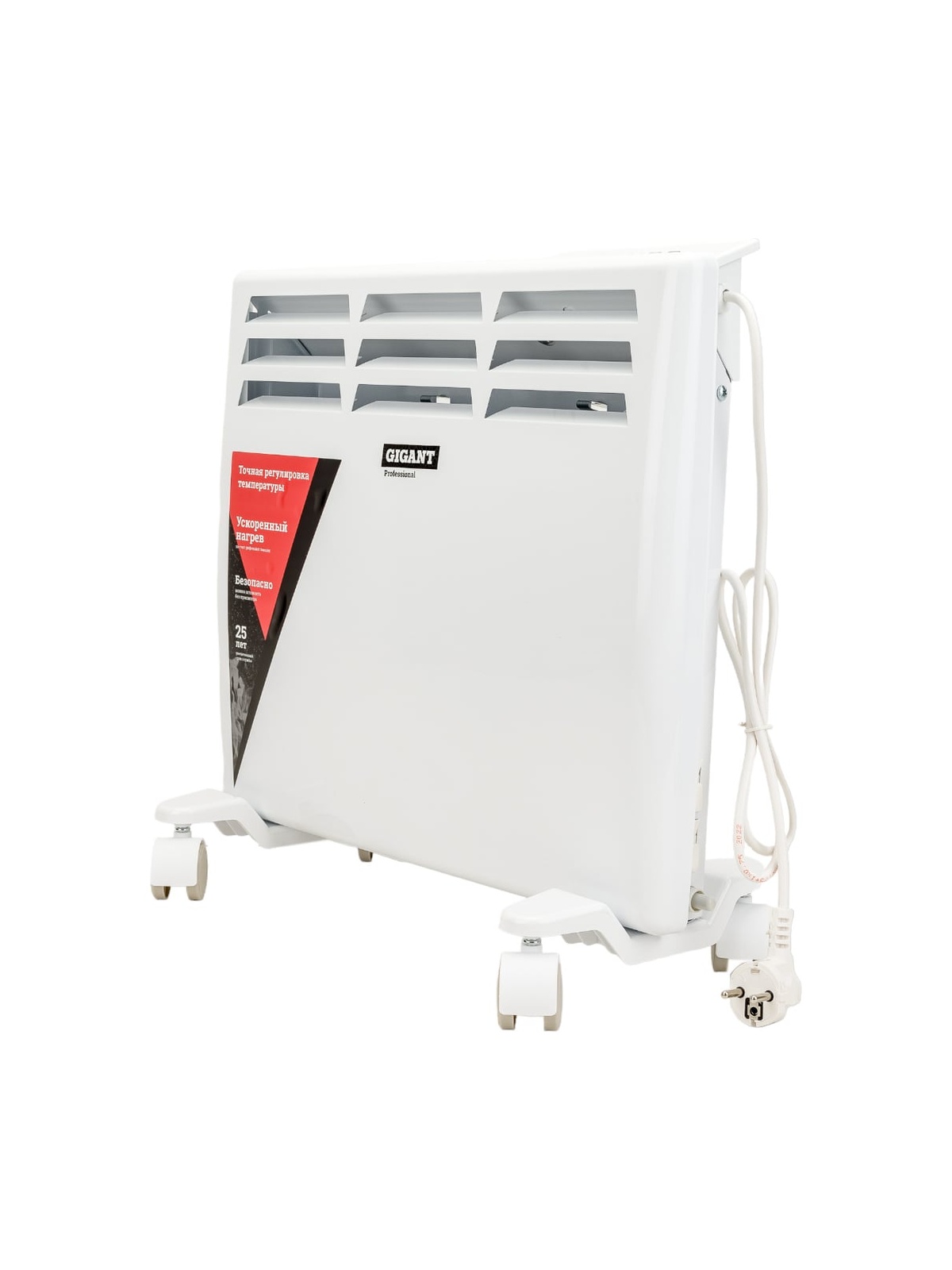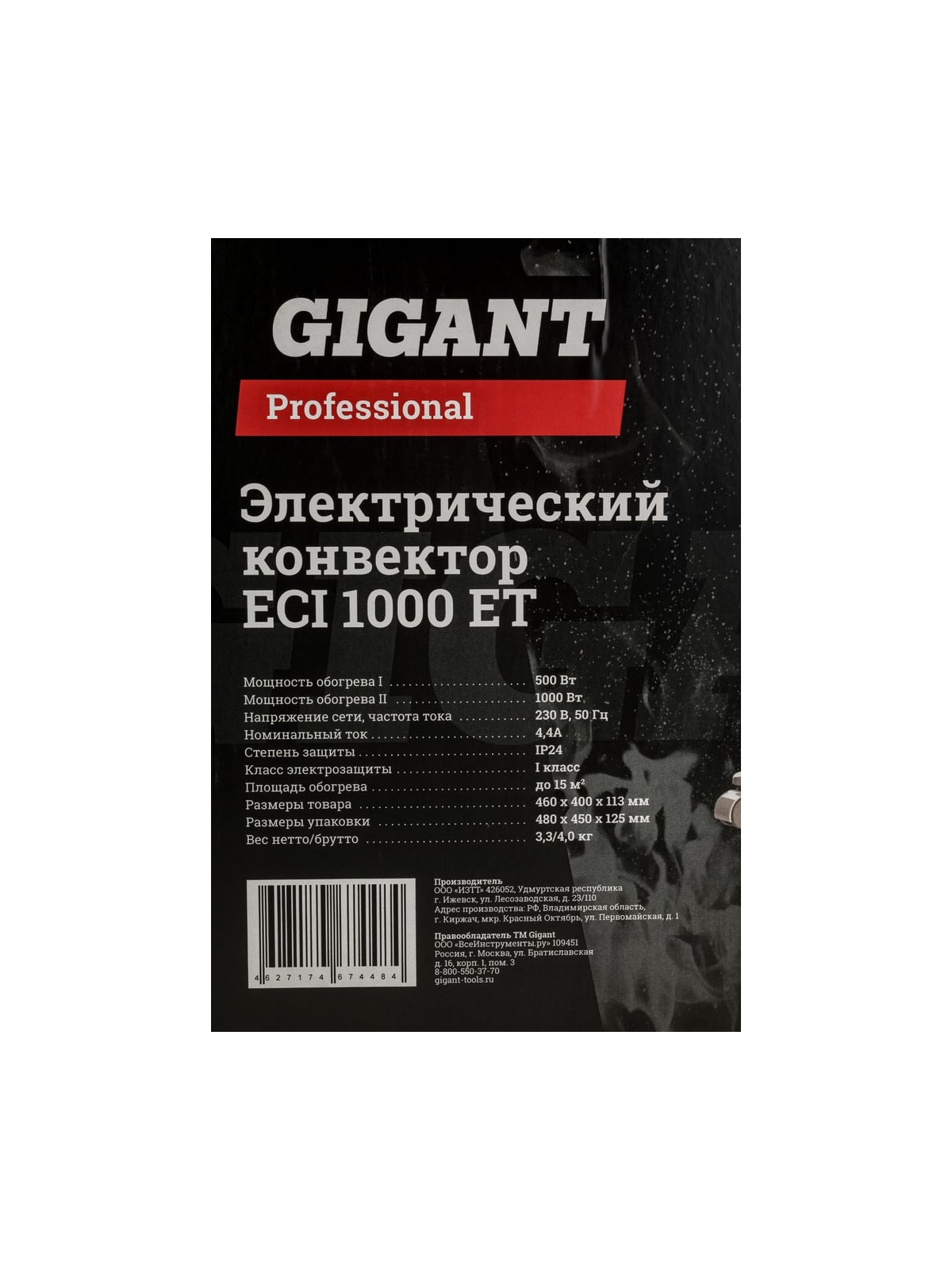 Электрический конвектор Gigant Professional ECI 1000 ET является усовершенствованной версией модели Gigant ECI 1000 MT. Основные отличия Gigant Professional от базовой линейки Gigant: LCD экран; Таймер отключения; Ионизация воздуха; Родительский контроль; Точность регулировки температуры до 1 градуса Цельсия. Как и базовую модель нагреватель ECI 1000 ET можно монтировать на стену или на пол, для этого в комплект входят колеса и настенный кронштейн. Прибор имеет 2 режима работы: 500 Вт и 1000 Вт. В основе конструкции - монолитный нагревательный элемент - более энергоемкий и с большей теплопередачей, чем нагревательные элементы типа "стич". Предусмотрена защита от перегрева и опрокидывания, а значит, снижен риск возникновения пожара. Высокоточный электронный термостат позволяет настраивать температуру в точности до 1 градуса. Рекомендуемая площадь обогрева составляет 15 кв.м. Корпус изготовлен из стали. Срок эксплуатации до 25 лет. Ионизация воздуха ION air позволяет не сушить воздух. Инновационная система равномерной конвекции Homogeneous flow. Воздухозаборник увеличенной площади Intake. Длина провода 1,2 м. Продукция представлена профессиональными и бытовыми инструментами, имеет доступную цену и высокое качество. При изготовлении товаров Gigant используется современное оборудование и прочные материалы. Производство осуществляется на современных предприятиях России и Азии. Тестирование товаров осуществляется в два этапа, каждая партия инструментов проходит проверку на соответствие стандартам и заявленным техническим характеристикам. Это является залогом качества и надежности готового продукта. Продукция представлена широкой линейкой инструментов. У нас можно приобрести ручной инструмент, строительный, садовый, сантехнический, климатический, крепежный, автогаражный, а также станки, расходные материалы и многое другое.