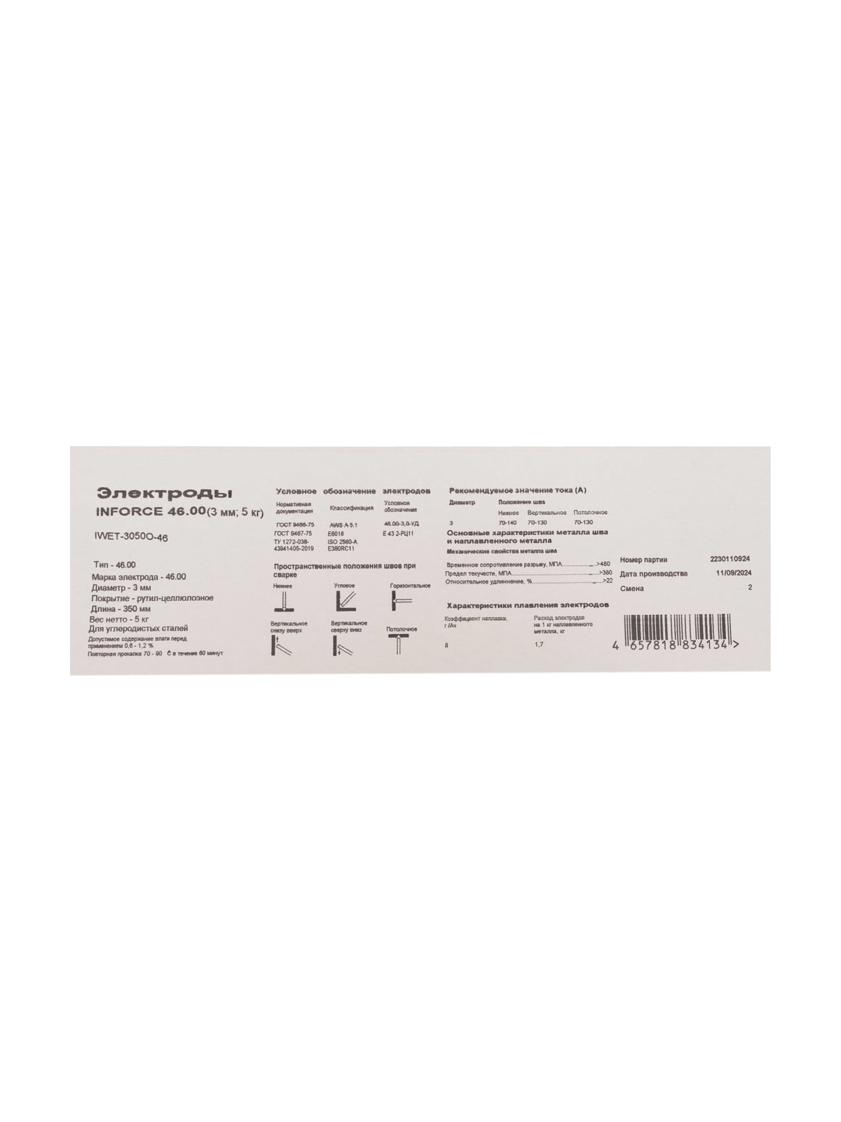 Электроды 46.00 (3 мм; 5 кг) Inforce IWET-3050O-46 предназначены для сварки методом MMA ответственных конструкций из углеродистых и низколегированных сталей с временным сопротивлением до 50 кгс/мм2. Сварка ведется во всех пространственных положениях. Работы следует проводить на постоянном токе прямой полярности и переменным током. Наплавленный металл образует ровный и высококачественный шов. Перед применением прокалить 120-160°C, 30 минут. Более подробную информацию по подбору электродов можно посмотреть в разделе документации карточки товара.