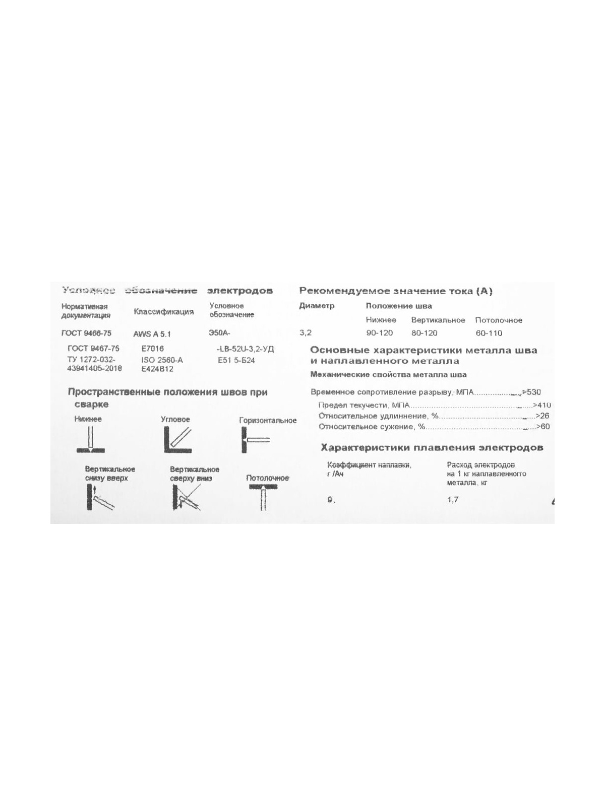 Электроды LB-52U (3,2 мм; 1 кг) Inforce IWET-3210U предназначены для сварки углеродистых и низколегированных сталей в ответственных конструкциях, которые подвергаются нагрузкам и деформации. Перед использованием прокалить при температуре 300-350°С в течение 60 минут. Дополнительные параметры: Расход электродов на 1 кг наплавленного металла – 1.7 кг. Коэффициент наплавки – 9 г/Ач. Допустимое содержание влаги в покрытии – 0.3%. Рекомендуемый ток – 130-170А. Более подробную информацию по подбору электродов можно посмотреть в разделе документации карточки товара.