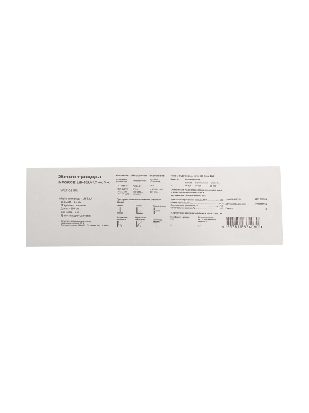 Электроды LB-52U (3,2 мм; 5 кг) Inforce IWET-3250U предназначены для сварки углеродистых и низколегированных сталей в ответственных конструкциях, которые подвергаются нагрузкам и деформации. Перед использованием прокалить при температуре 300-350°С в течение 60 минут. Дополнительные параметры: Расход электродов на 1 кг наплавленного металла – 1.7 кг. Коэффициент наплавки – 9 г/Ач. Допустимое содержание влаги в покрытии – 0.3%. Рекомендуемый ток – 130-170А. Более подробную информацию по подбору электродов можно посмотреть в разделе документации карточки товара.
