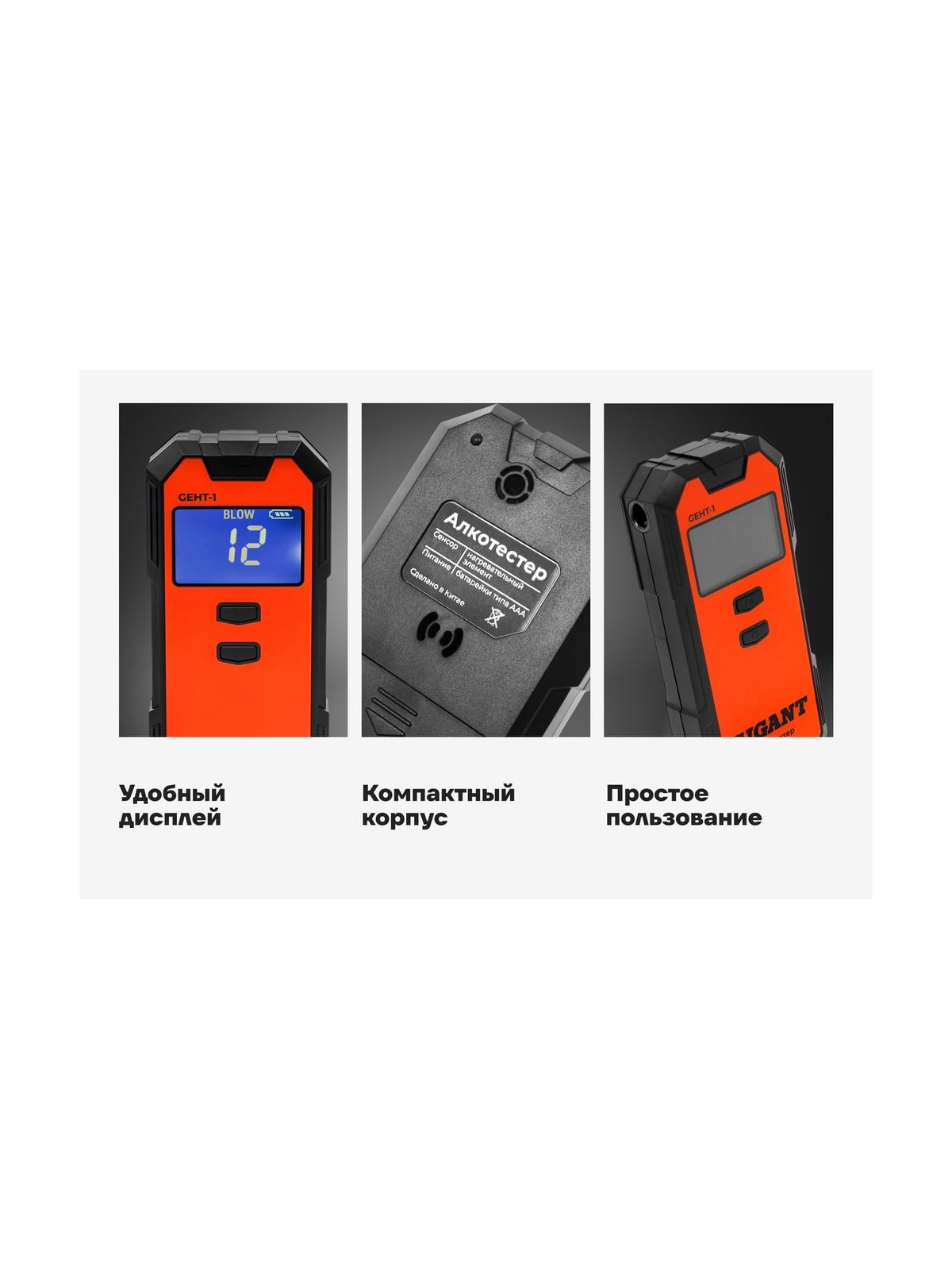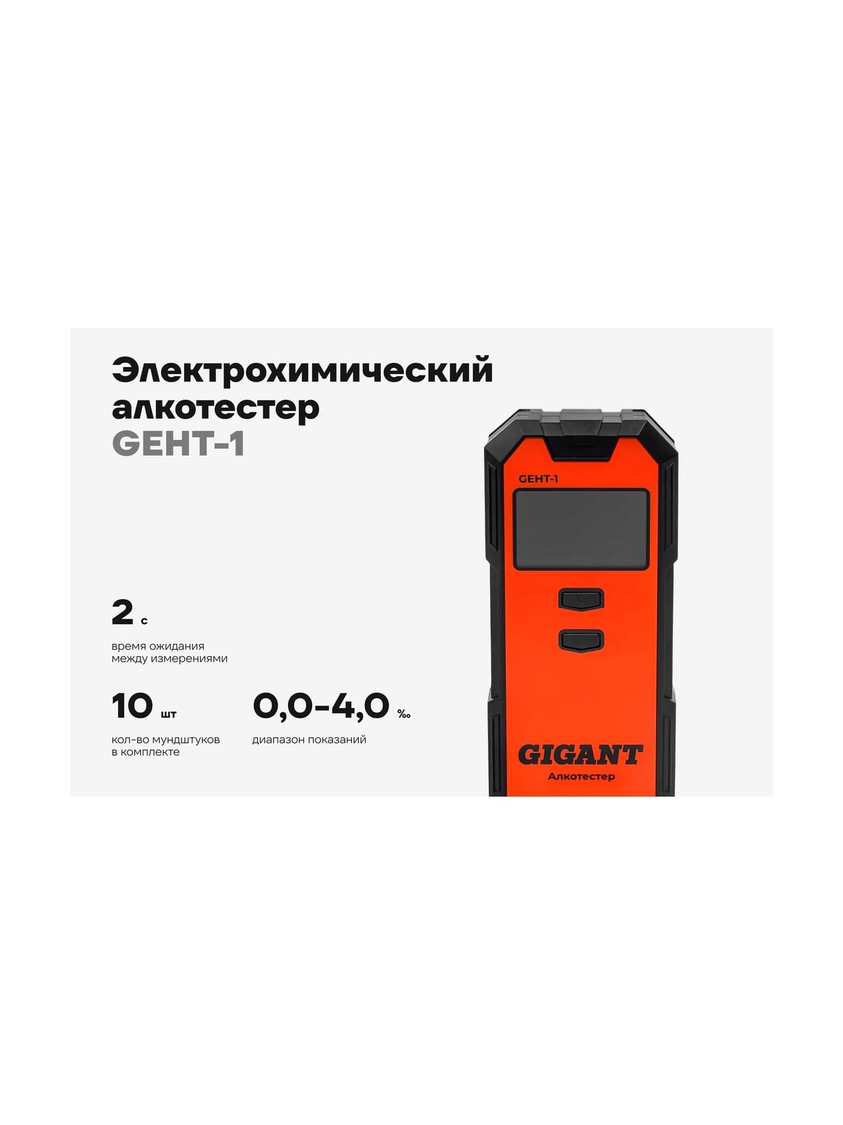 Электрохимический алкотестер Gigant GEHT-1 предназначен для измерения концентрации алкоголя в выдыхаемом человеком воздухе или в крови человека по выдыхаемому воздуху. Прибор может использоваться как в целях проверки самого себя, так и для проверки большого количества людей, например в автопарке, на производстве перед началом рабочего дня.