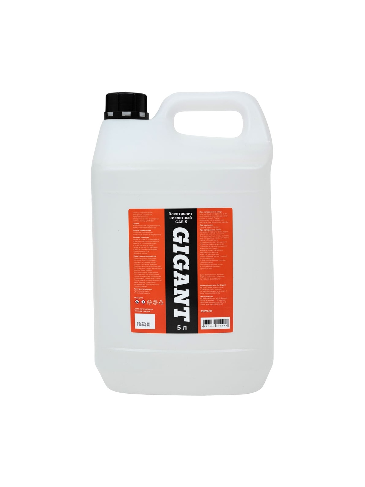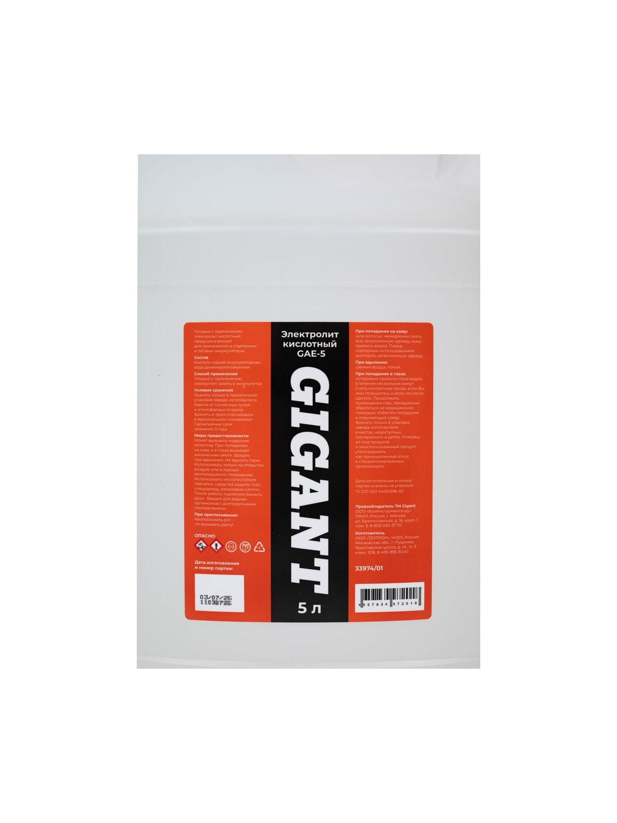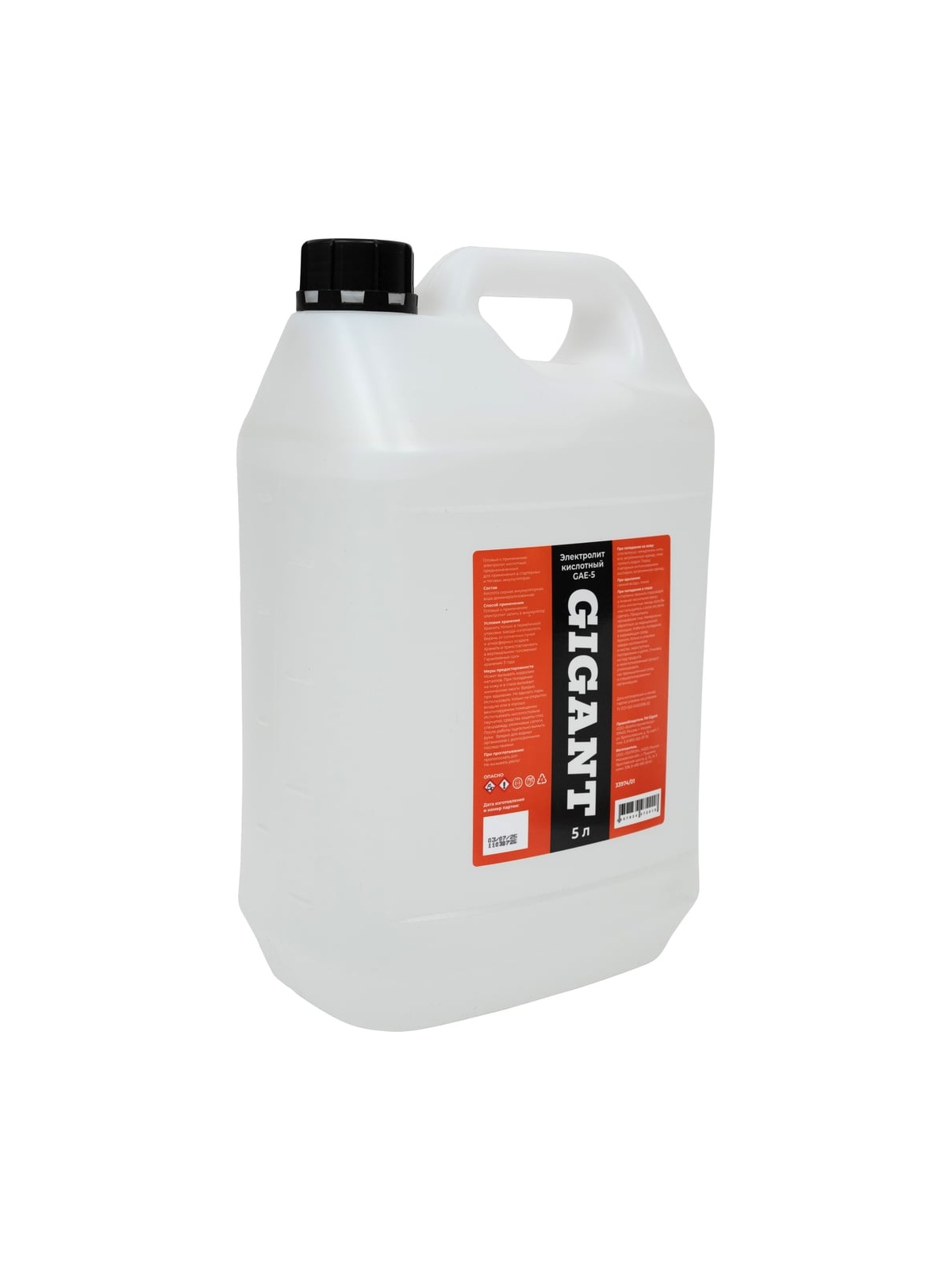 Электролит Gigant 5л GAE-5 - это готовый к применению кислотный электролит, предназначенный для заливки в тяговые и стартерные аккумуляторы. Произведен на основе высококачественной серной аккумуляторной кислоты и дистиллированной воды высокой степени очистки. Продлевает срок службы всех марок кислотных стартерных аккумуляторов.