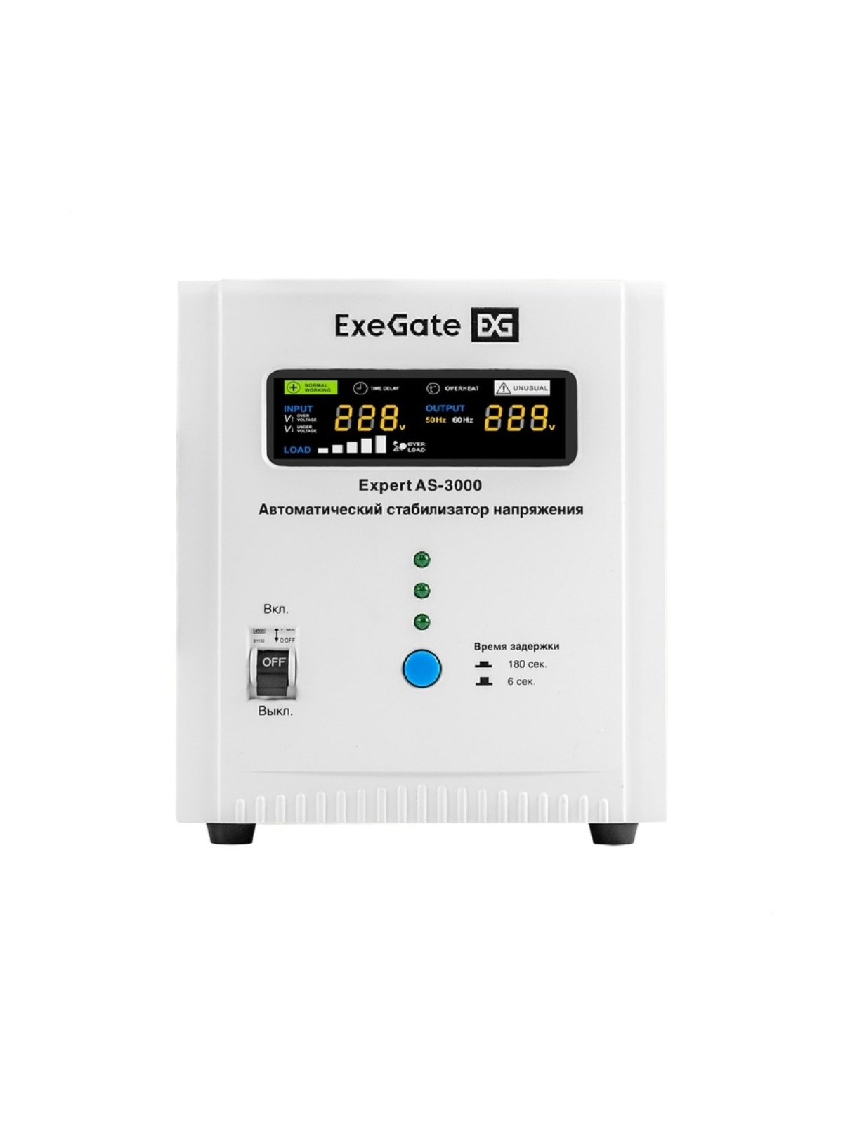 Exegate EX291724RUS Стабилизатор напряжения ExeGate Expert AS-3000 (3000ВА, вход 140...260В, двойная цифр. индикация вход/вых. напряжения, выход 220В±8%, КПД 98%, 5 уровней защиты, метал. корпус, клем