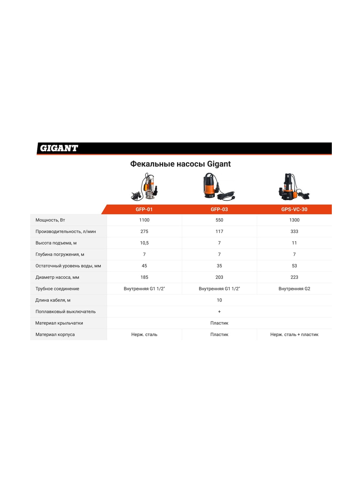 Фекальный насос Gigant изготовлен из нержавеющей стали, благодаря чему отличается прочностью, устойчивостью к образованию коррозии и механическим воздействиям. Для защиты от работы вхолостую предусмотрен внешний поплавковый механизм, который отключает и включает насос в зависимости от уровня воды. Фекальный насос применяется для перекачивания жидкостей с взвешенными частицами в составе. Предназначен для перекачки воды из септиков, сточных колодцев, подвалов. Способен поднимать воду на высоту до 10.5 метров, погружается на глубину 7 метров. Производительность инструмента - 275 литров в минуту. Продукция представлена профессиональными и бытовыми инструментами, имеет доступную цену и высокое качество. При изготовлении товаров Gigant используется современное оборудование и прочные материалы. Производство осуществляется на современных предприятиях России и Азии. Тестирование товаров осуществляется в два этапа, каждая партия инструментов проходит проверку на соответствие стандартам и заявленным техническим характеристикам. Это является залогом качества и надежности готового продукта. Продукция представлена широкой линейкой инструментов. У нас можно приобрести ручной инструмент, строительный, садовый, сантехнический, климатический, крепежный, автогаражный, а также станки, расходные материалы и многое другое.