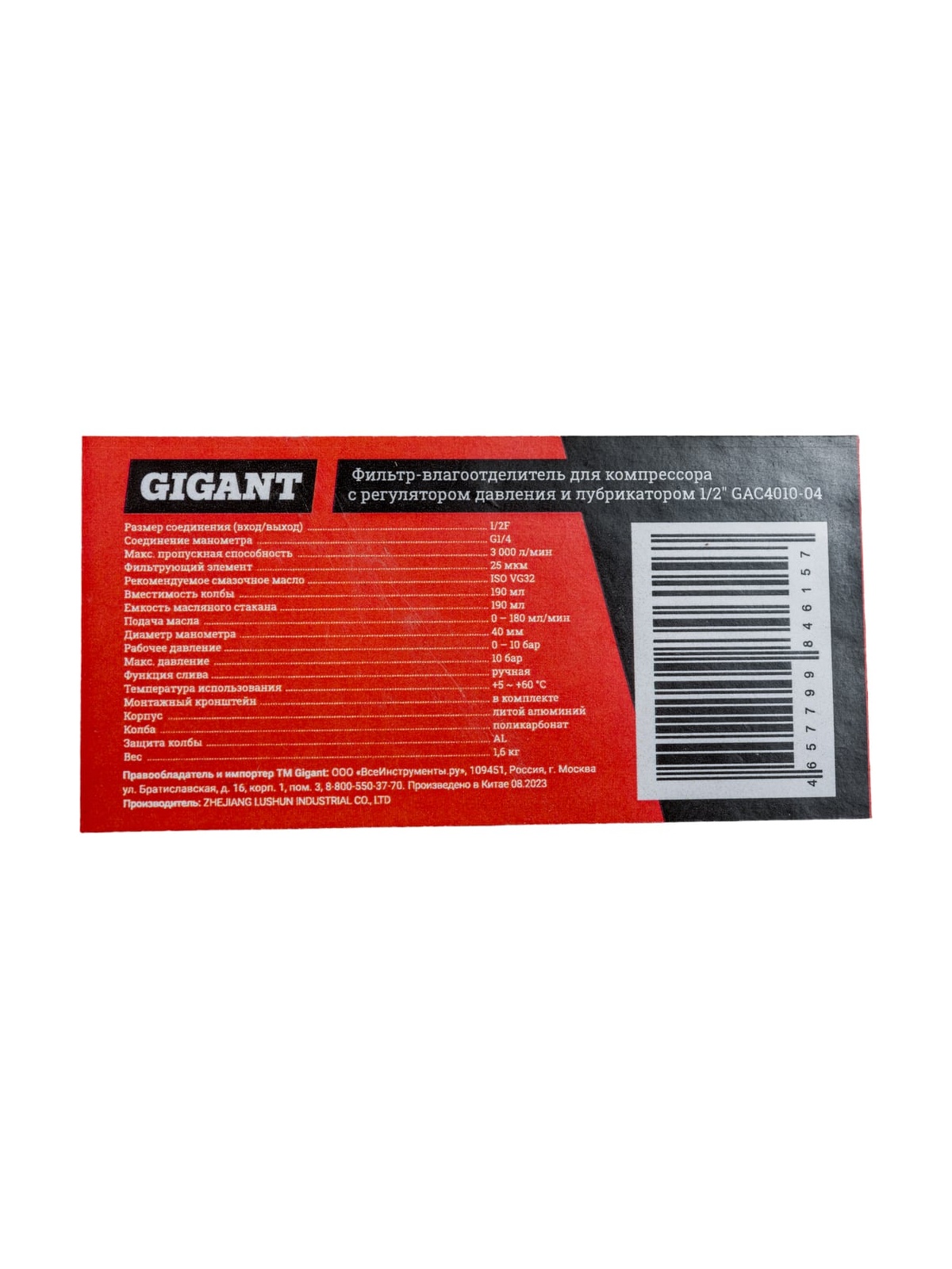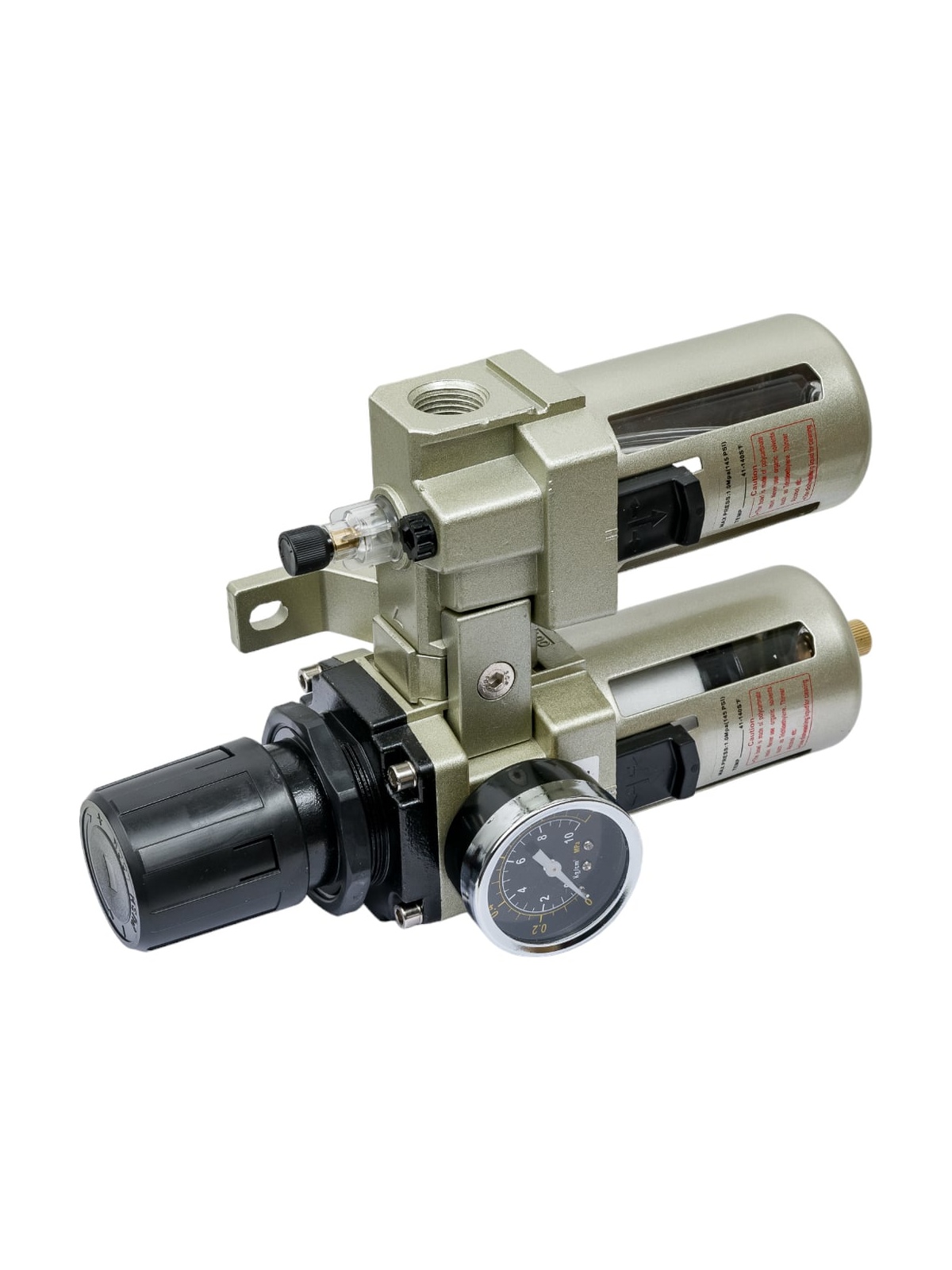 Фильтр-влагоотделитель для компрессора с регулятором давления и лубрикатором 1/2" Gigant GAC4010-04 предназначен для очистки сжатого воздуха от пыли, паров воды. Включает в себя фильтр-регулятор и масленку. Встроенный манометр позволяет отслеживать уровень давления воздуха, подаваемого к пневмоинструменту. Лубрикатор обеспечивает дозированную подачу смазки в воздух.