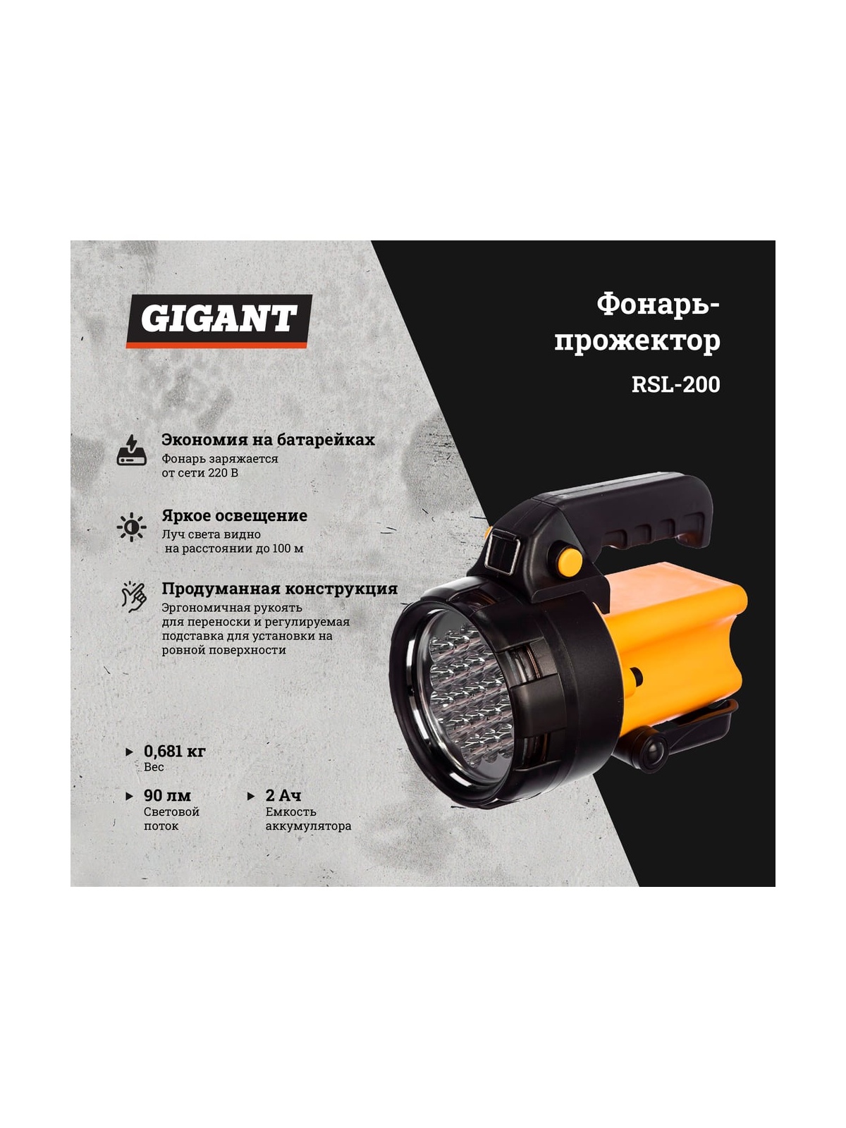 Фонарь-прожектор Gigant 19хLED RSL-200 подходит для использования на улице или в дороге. Выполнен из прочного ABS-пластика. Оснащен удобной подставкой для надежной установки на рабочей поверхности, а также эргономичной рукояткой для комфортной переноски. Мощный луч света будет виден на расстоянии до 100 м. Зарядка происходит напрямую от сети 220 В. В комплекте ремешок, зарядное устройство для автомобиля и стандартное от сети. Фонарь отличается длительным временем работы - 10 часов. Продукция представлена профессиональными и бытовыми инструментами, имеет доступную цену и высокое качество. При изготовлении товаров Gigant используется современное оборудование и прочные материалы. Производство осуществляется на современных предприятиях России и Азии. Тестирование товаров осуществляется в два этапа, каждая партия инструментов проходит проверку на соответствие стандартам и заявленным техническим характеристикам. Это является залогом качества и надежности готового продукта. Продукция представлена широкой линейкой инструментов. У нас можно приобрести ручной инструмент, строительный, садовый, сантехнический, климатический, крепежный, автогаражный, а также станки, расходные материалы и многое другое.