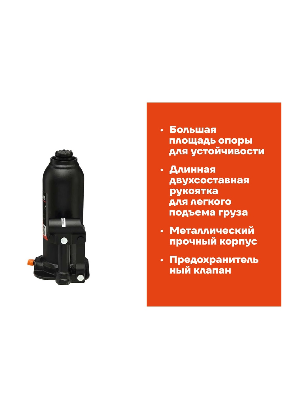 Гидравлический бутылочный домкрат Gigant 5Т HBJ-5 подойдет для легковых автомобилей, внедорожников и малотоннажных грузовиков. Наличие предохранительного клапана защищает устройство от поломки из-за перегрузок. Высота подхвата данного домкрата составляет 216 мм. грузоподъемность - 5 т. Модель полностью соответствует ГОСТ Р 53822-2010. Оборудование проходит тщательный контроль качества в лаборатории завода, а также входной контроль качества перед продажей. Бутылочный домкрат отличается следующими особенностями: Удобный размер - небольшие габариты по сравнению с механическими домкратами при одинаковых возможностях. Легкость в эксплуатации - необходимо минимальное усилие для работы домкрата. Устойчивость - большая площадь опоры и перпендикулярное приложение усилия без смещения в процессе работы.