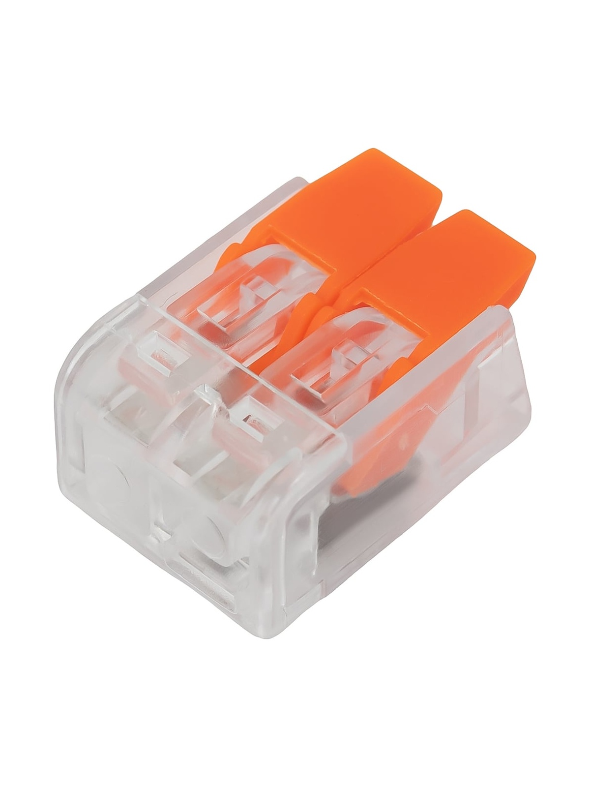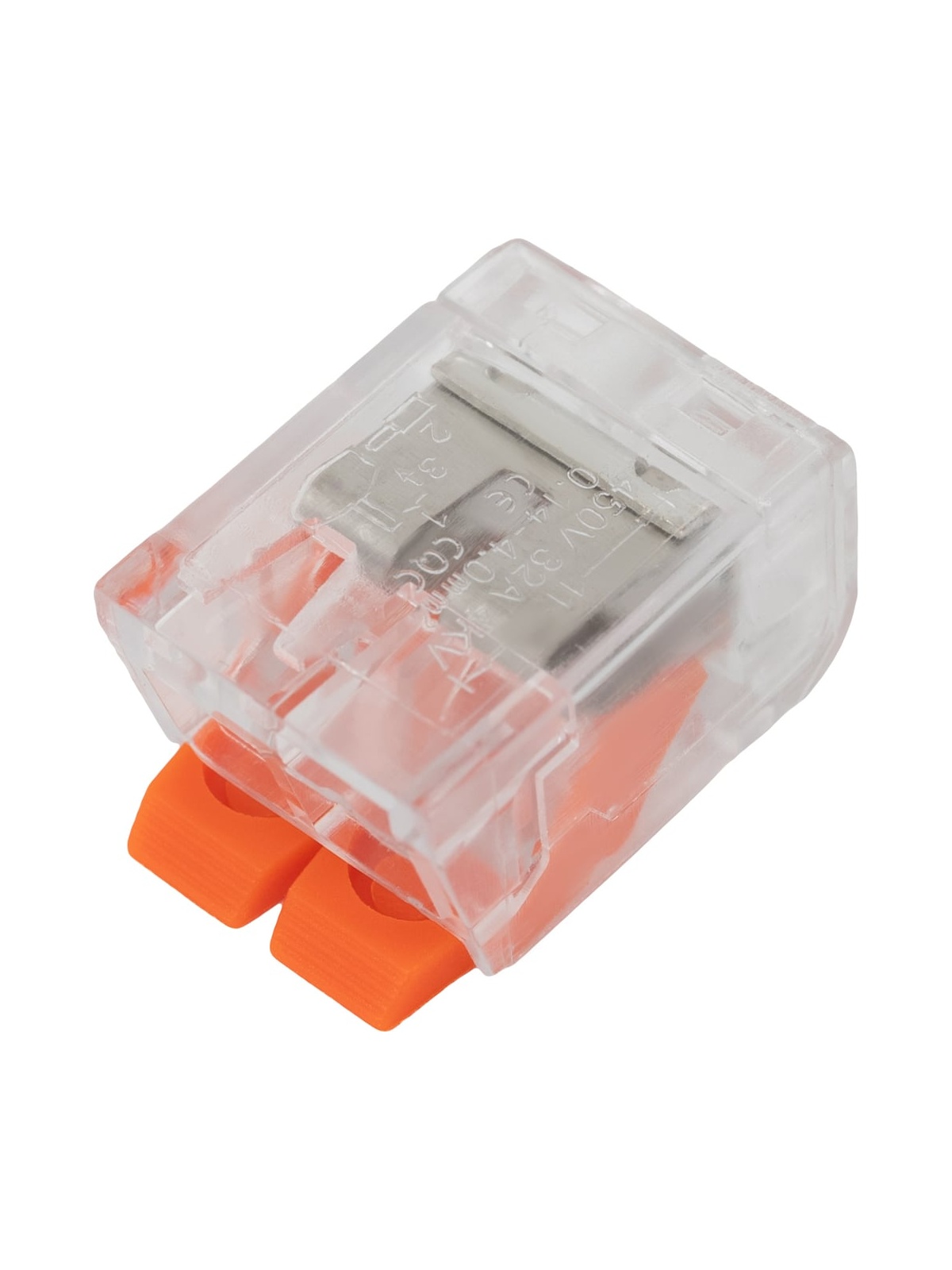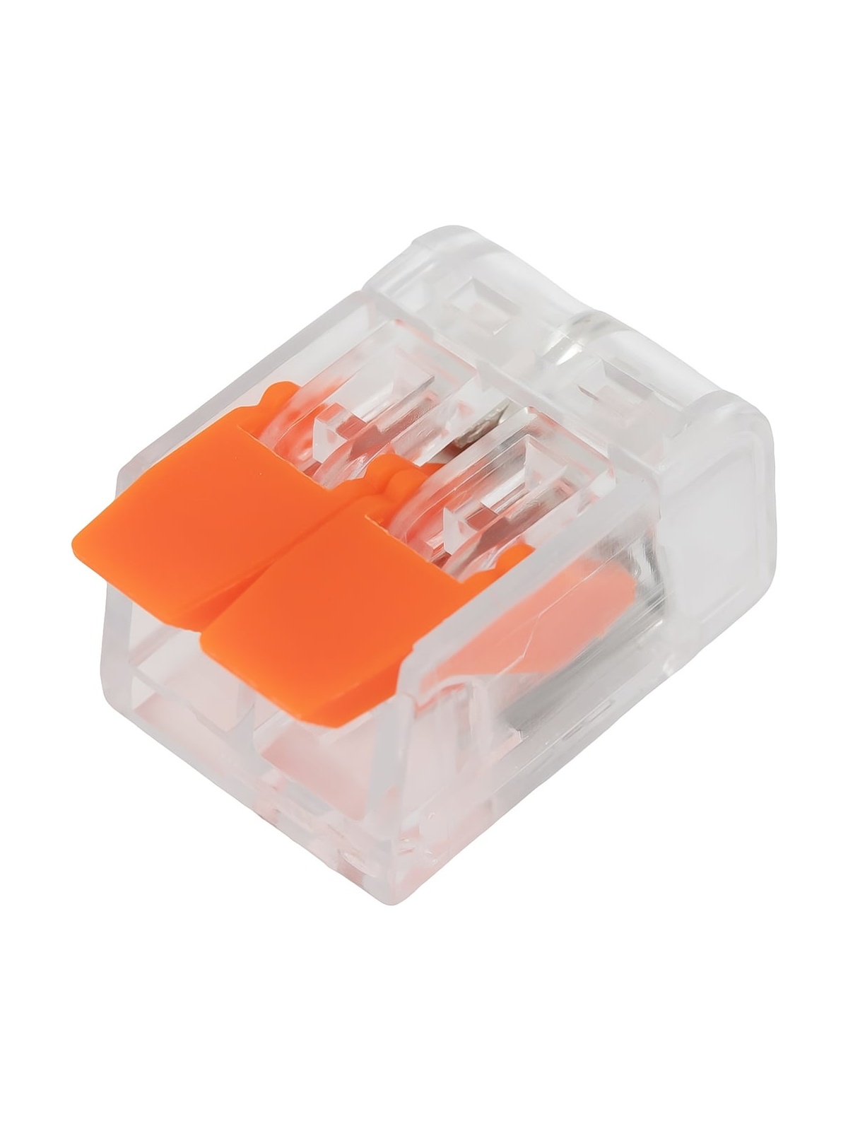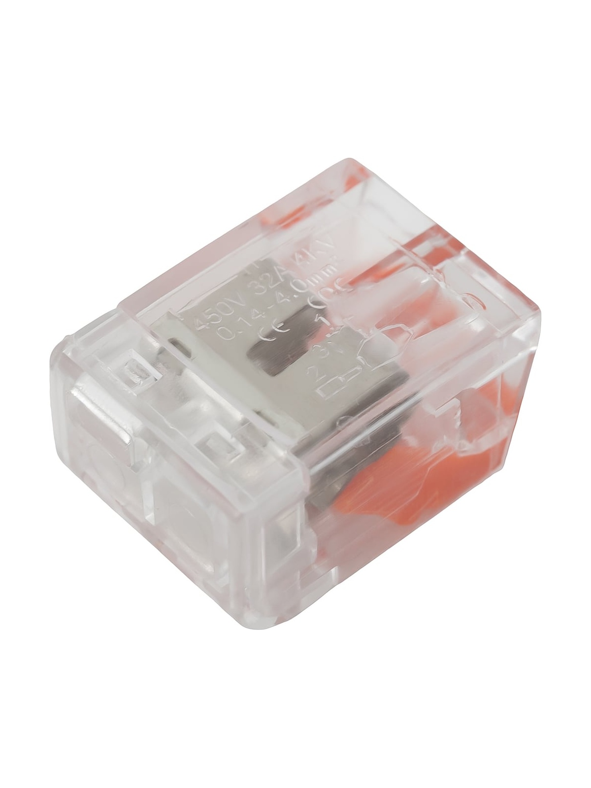 Gigant 2-х проводная клемма 100 шт/уп GCT-221-412-100 предназначена для быстрого и надёжного соединения медных проводников в распределительных коробках, щитах и электроустановочных изделиях. Используется в сетях переменного и постоянного тока напряжением до 600 В с номинальным током до 32 А. Подходит для профессионального и бытового электромонтажа. Клеммы серии 221 обеспечивают соединение однопроволочных и многопроволочных проводников различного сечения в одной клемме: — многопроволочные: 0,14–4 мм²; — однопроволочные: 0,2–4 мм². Рабочая температура окружающей среды — до +85 °C. Рекомендуемая длина зачистки изоляции — 11 мм. Применяются при монтаже осветительных линий, розеточных групп, распределительных коробок, подключении оборудования, а также при ремонте и модернизации электропроводки. Преимущества: Прозрачный корпус позволяет визуально контролировать правильность вставки и глубину захода проводника. Возможность сочетания проводников разного типа и сечения в одной клемме — удобно при реконструкции и подключении нового оборудования к существующей проводке. Пружинный зажим из нержавеющей стали обеспечивает стабильное контактное давление и исключает ослабление соединения со временем. Медный контакт с гальваническим покрытием гарантирует низкое переходное сопротивление и устойчивость к нагреву. Корпус выполнен из полимерного материала, соответствующего классу пожарной безопасности UL 94 V0 — не поддерживает горение и самозатухает при устранении источника пламени. Детали изготовлены из армированного стекловолокном полимера — повышенная прочность и устойчивость к механическим нагрузкам. Быстрый монтаж без инструмента: провод вводится в зажим без чрезмерных усилий и надёжно фиксируется без риска выпадения. Российское производство полного цикла с автоматизированной сборкой и контролем качества — стабильность параметров каждой партии.