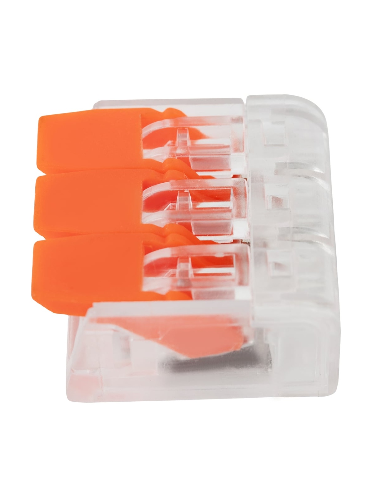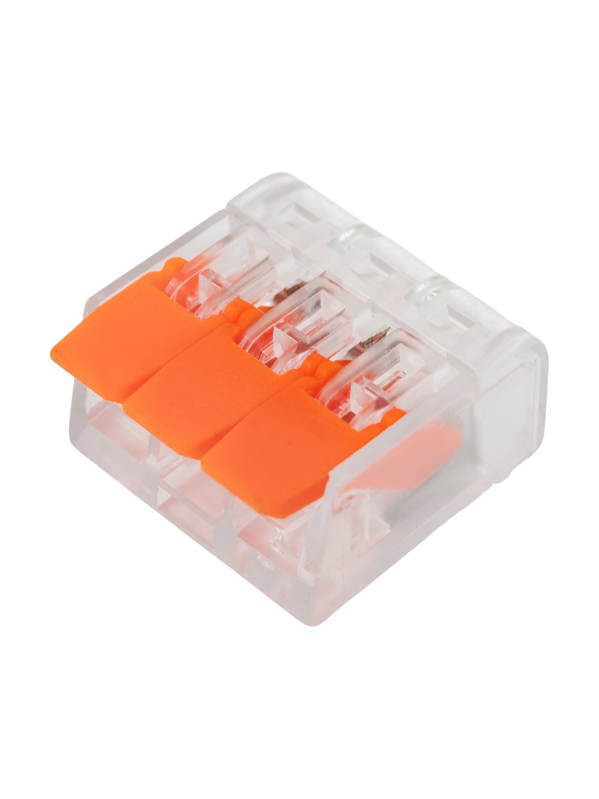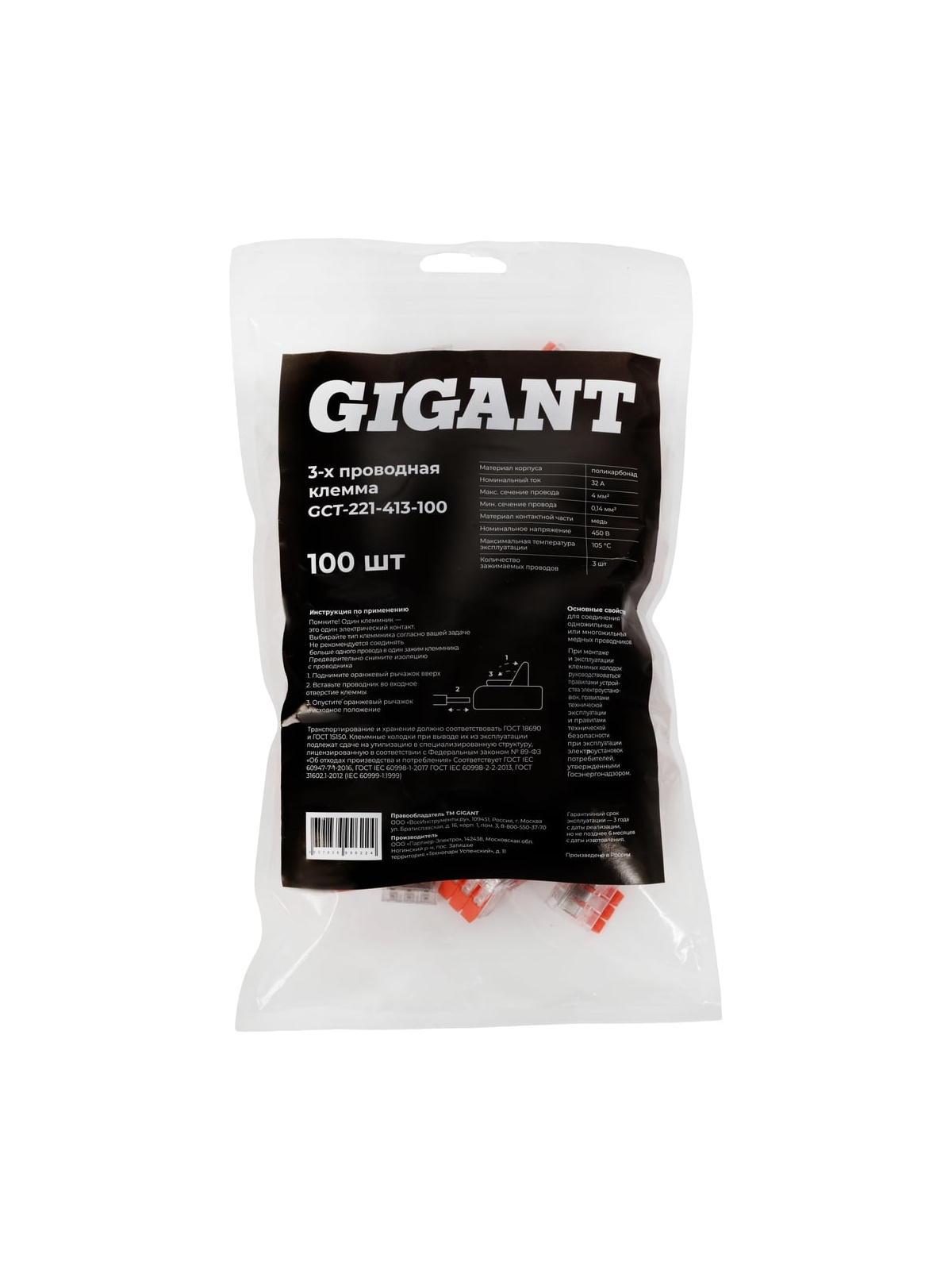 Gigant 3-х проводная клемма 100 шт/уп GCT-221-413-100 предназначена для быстрого и надёжного соединения медных проводников в распределительных коробках, щитах и электроустановочных изделиях. Используется в сетях переменного и постоянного тока напряжением до 600 В с номинальным током до 32 А. Подходит для профессионального и бытового электромонтажа. Клеммы серии 221 обеспечивают соединение однопроволочных и многопроволочных проводников различного сечения в одной клемме: — многопроволочные: 0,14–4 мм²; — однопроволочные: 0,2–4 мм². Рабочая температура окружающей среды — до +85 °C. Рекомендуемая длина зачистки изоляции — 11 мм. Применяются при монтаже осветительных линий, розеточных групп, распределительных коробок, подключении оборудования, а также при ремонте и модернизации электропроводки. Преимущества: Прозрачный корпус позволяет визуально контролировать правильность вставки и глубину захода проводника. Возможность сочетания проводников разного типа и сечения в одной клемме — удобно при реконструкции и подключении нового оборудования к существующей проводке. Пружинный зажим из нержавеющей стали обеспечивает стабильное контактное давление и исключает ослабление соединения со временем. Медный контакт с гальваническим покрытием гарантирует низкое переходное сопротивление и устойчивость к нагреву. Корпус выполнен из полимерного материала, соответствующего классу пожарной безопасности UL 94 V0 — не поддерживает горение и самозатухает при устранении источника пламени. Детали изготовлены из армированного стекловолокном полимера — повышенная прочность и устойчивость к механическим нагрузкам. Быстрый монтаж без инструмента: провод вводится в зажим без чрезмерных усилий и надёжно фиксируется без риска выпадения. Российское производство полного цикла с автоматизированной сборкой и контролем качества — стабильность параметров каждой партии.