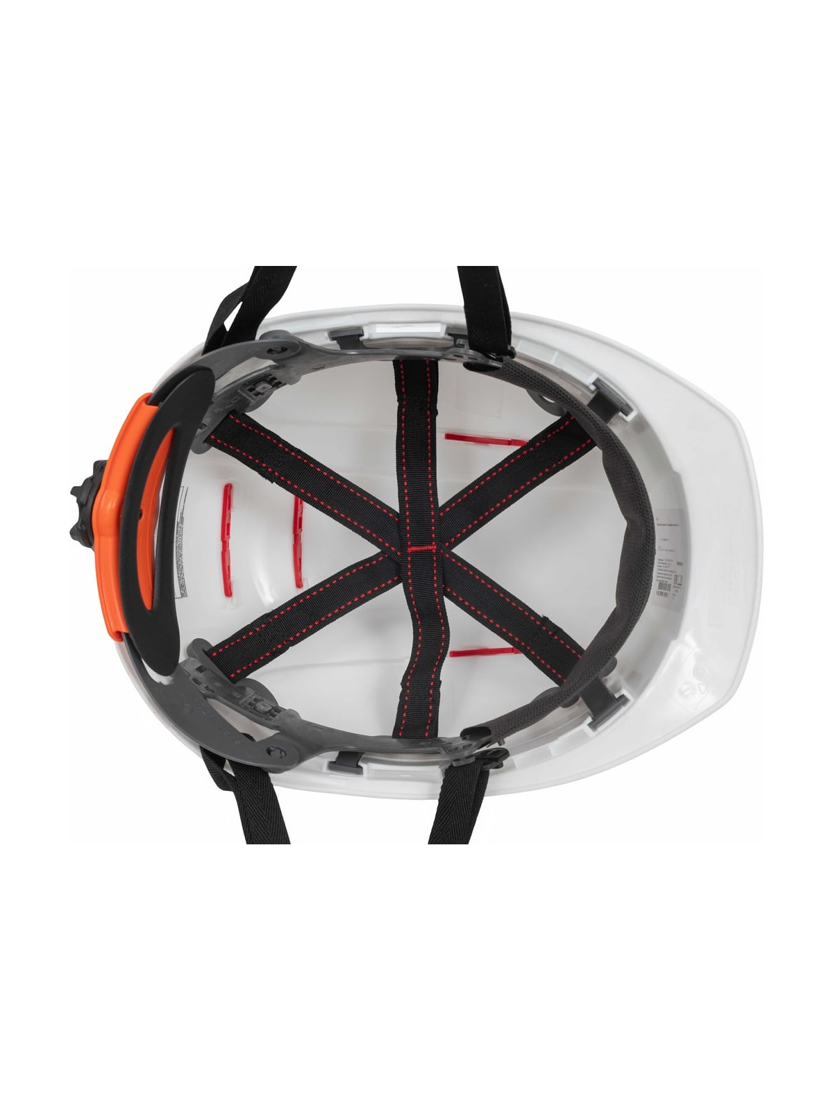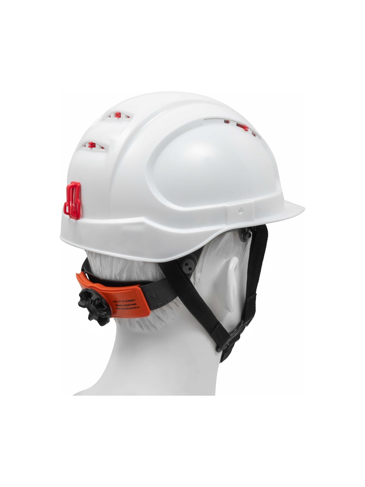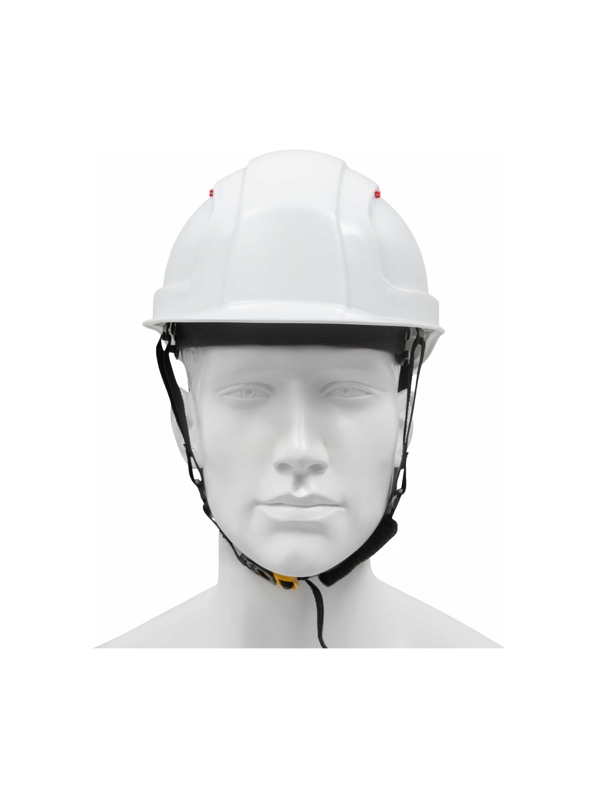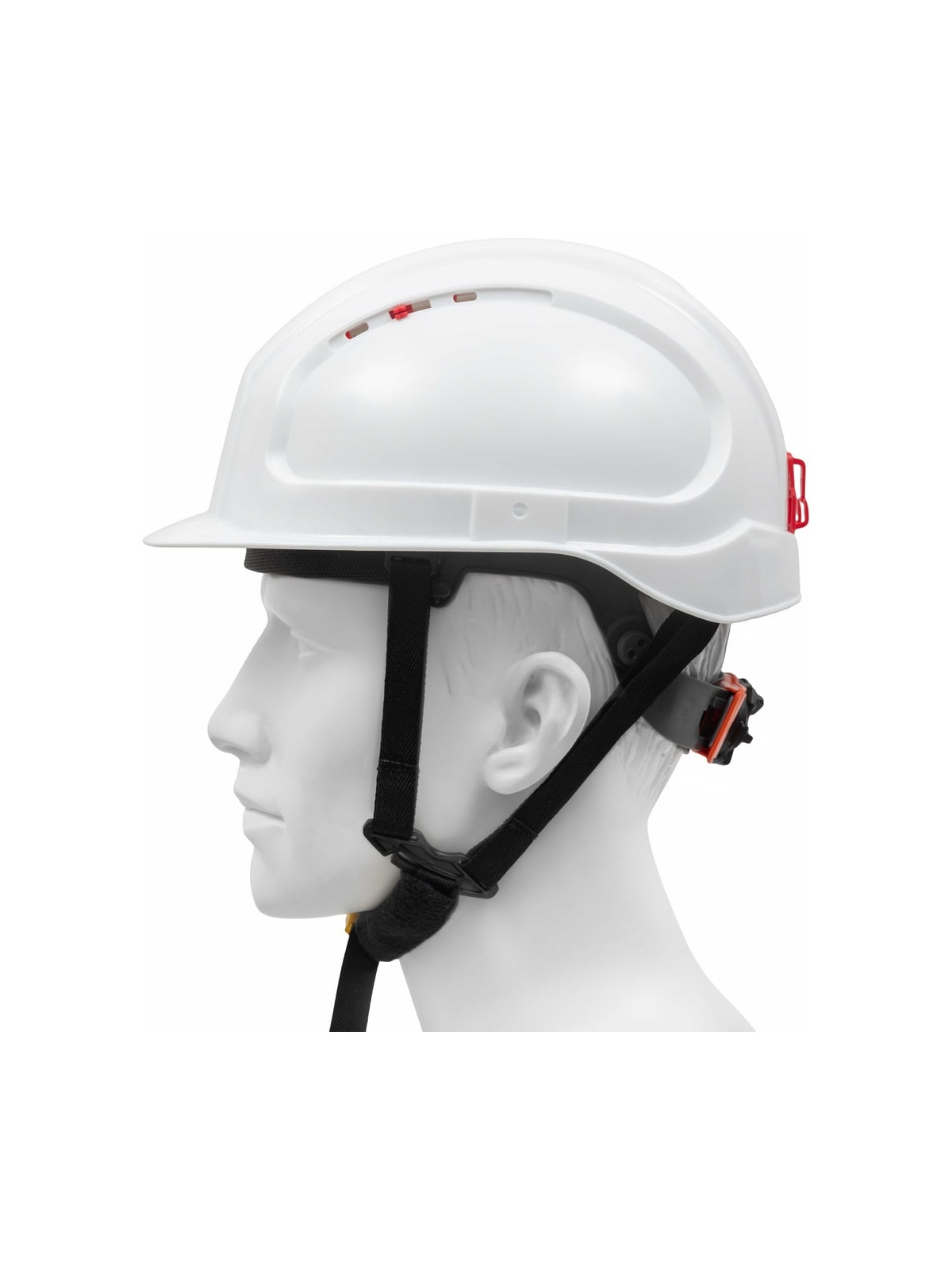 Защитная каска Gigant Zip белая храповая регулировка GHZ-22 защищает голову пользователя от повреждений падающими предметами, от воздействия влаги, брызг металла, химических веществ. Имеются пазы (слоты) для крепления наушников и щитков, держатель SMART для фиксации наголовной ленты защитных закрытых очков. Корпус каски изготовлен из полиэтилена низкого давления с несмываемой маркировкой защитных свойств на козырьке каски Имеется двойное ребро жёсткости и увеличенная защита затылочной части Вентиляционные отверстия регулируются заглушками, которые являются УФ-индикаторами старения Внутренняя оснастка с текстильными амортизационными лентами крепится к корпусу в 8-ми точках Шесть ступней регулировки высоты ношения Регулировка по размеру головы осуществляется плавно храповым механизмом RAPID Cменная мягкая налобная лента (обтюратор) из триплированного материала Подбородочный ремень позволяет надежно фиксировать каску на голове пользователя за счет 4-х точек крепления к корпусу каски и регулируется по длине при помощи пряжки.